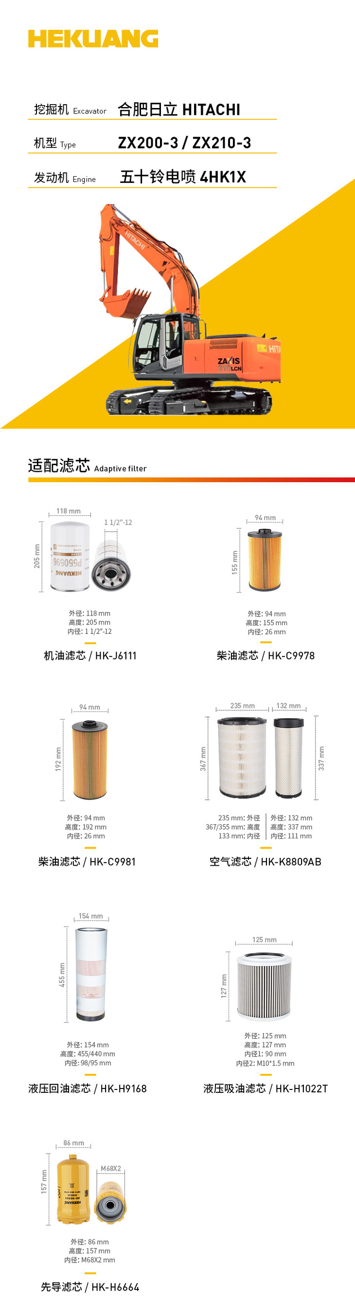 日立ZX200-3 ZX210-3(五十铃电喷4HK1X) 挖掘机滤芯 机油柴油空气滤芯 液压油先导滤芯