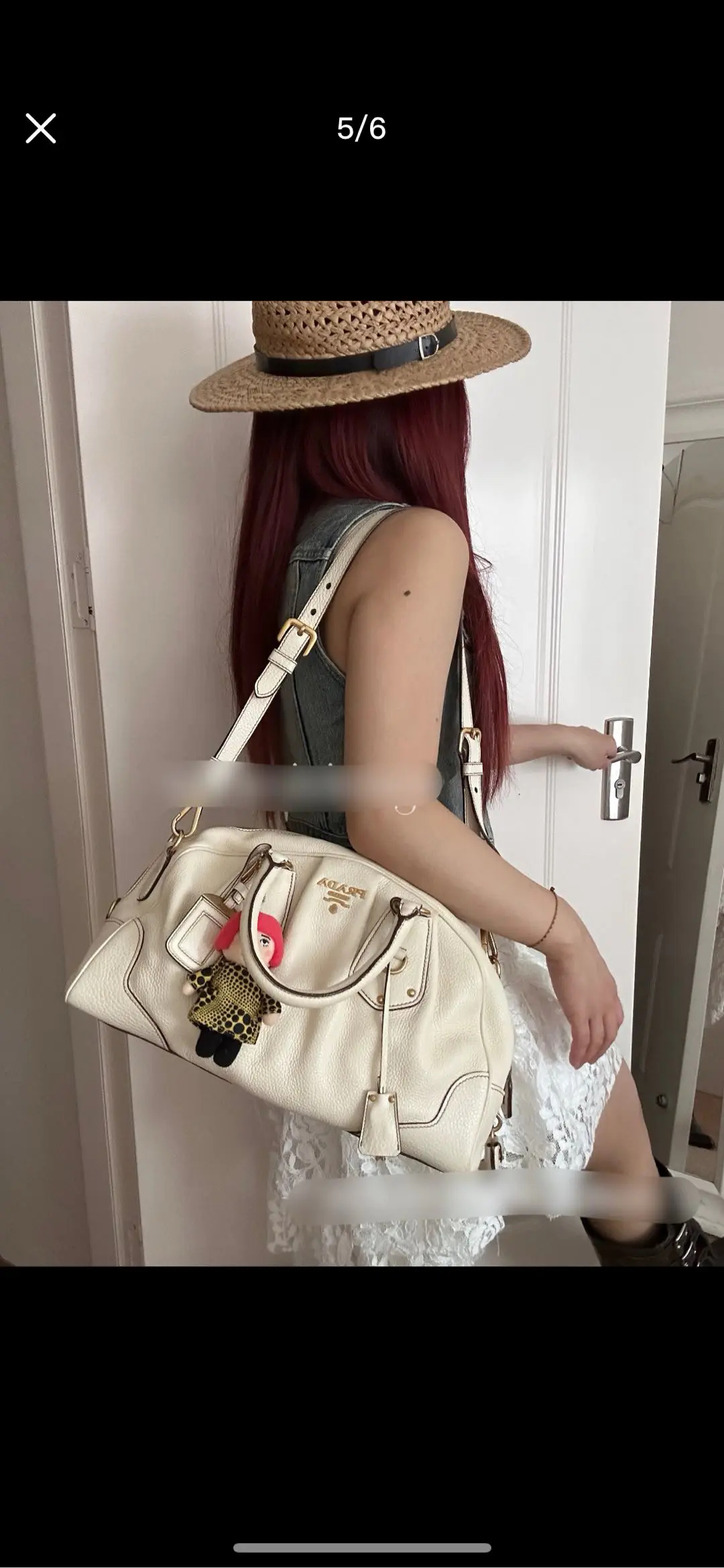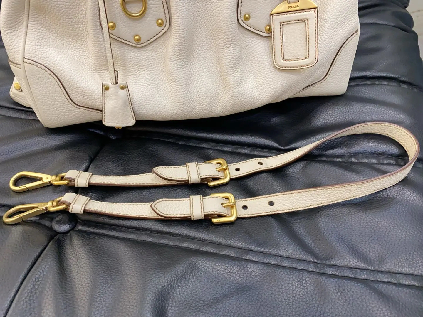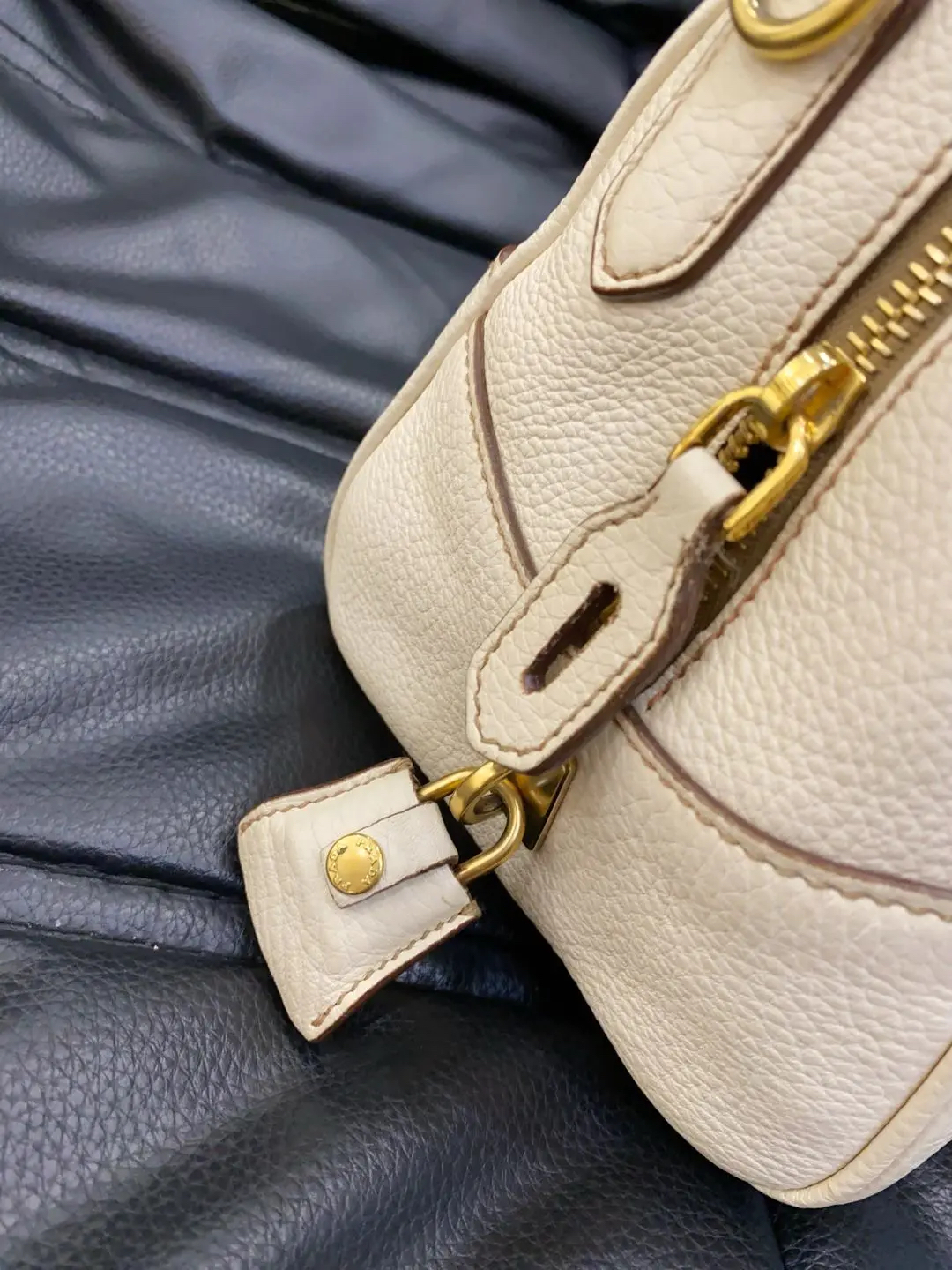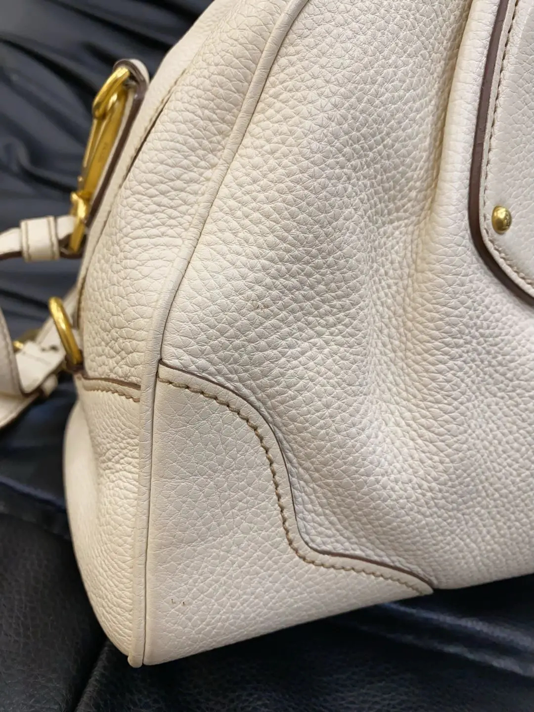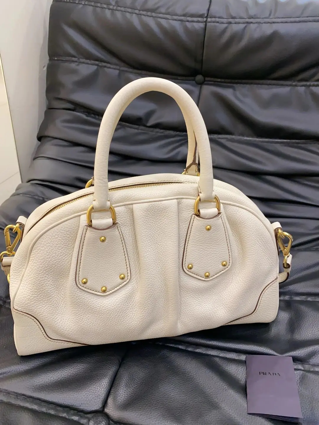 【商品详情】正品二手 Prada 奶白色 荔枝牛皮 手提 保龄球包🛍️ 95新 35*23 配件:挂件x2 肩带。边角和内里正常使用感。奶呼呼的