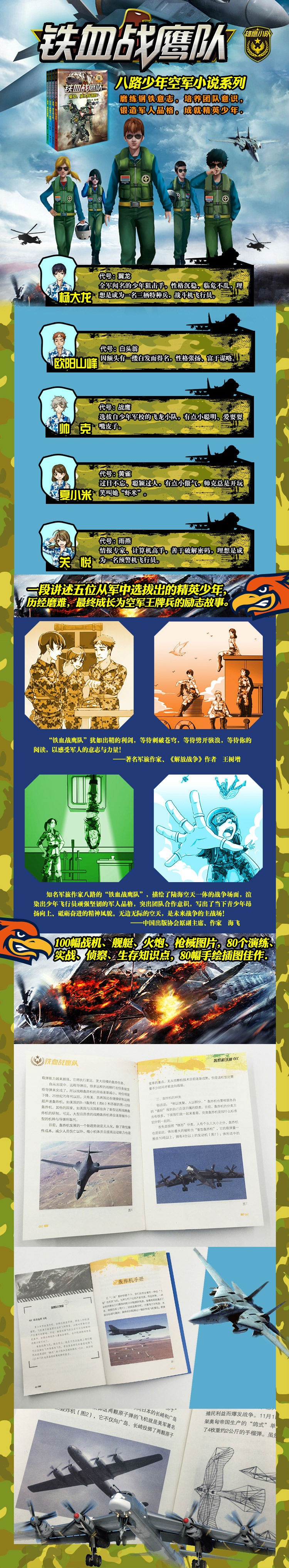 知名军旅作家八路的“铁血战鹰队”系列,描绘了陆海空天一体的战争场面,渲染出少年飞行员顽强坚韧的军人品格,突出团队合作意识,写出了当下少年儿童昂扬向上、砥砺奋进的精神风貌。无边无际的空天,是未来战争的主战场!