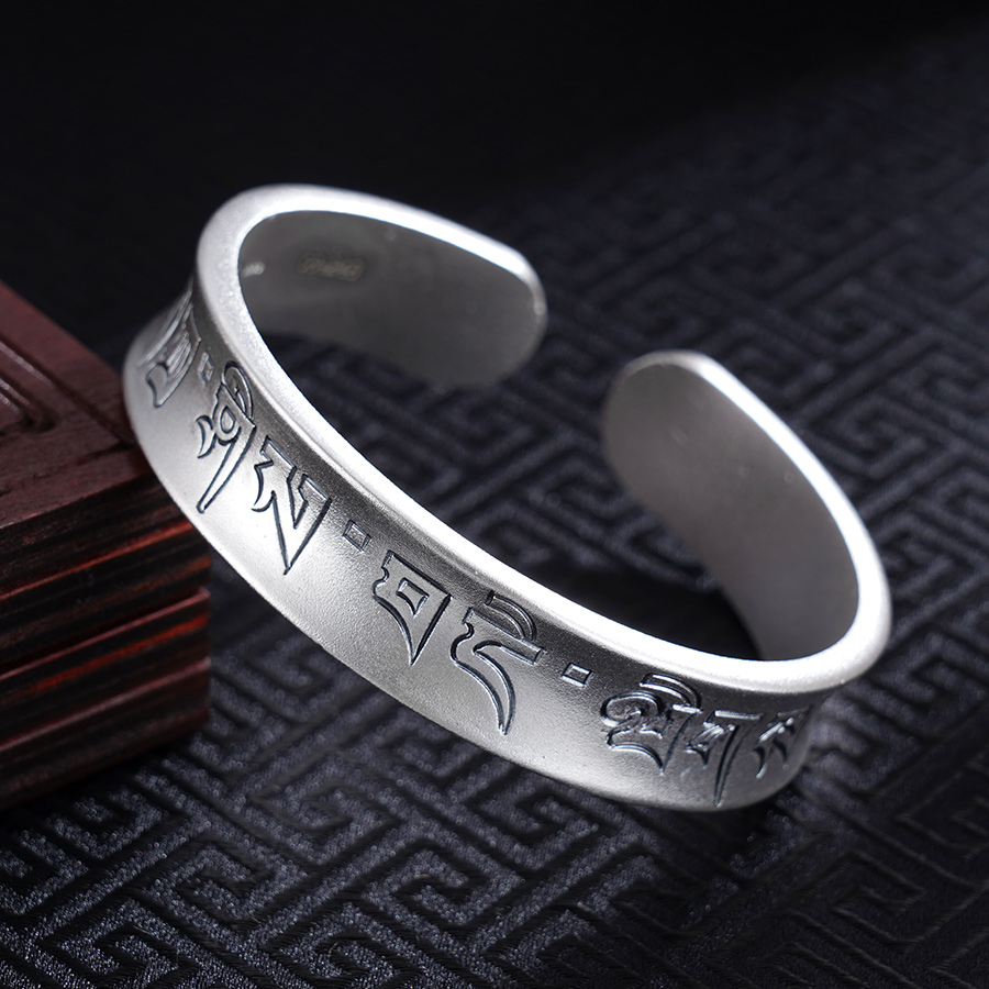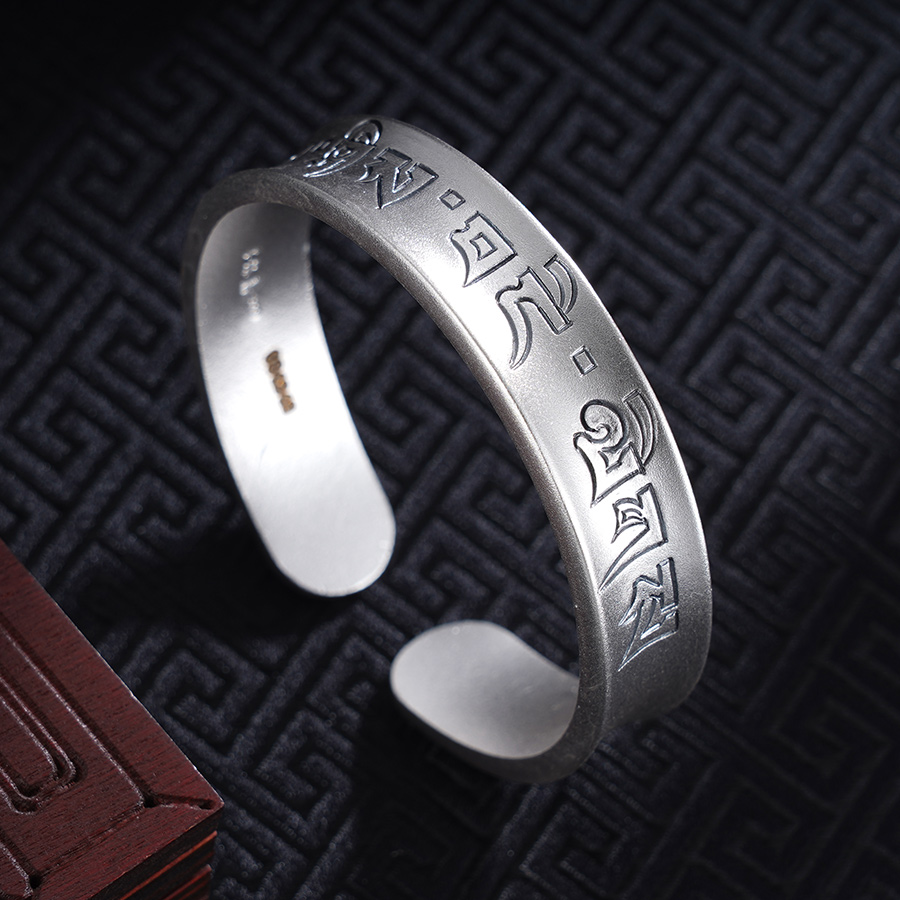 【寓意】:六字真言,内涵丰富,奥秘无穷。手镯以其为灵感设计,应用錾刻、仿古工艺打造。随身佩戴,佛法加持,避邪消灾。