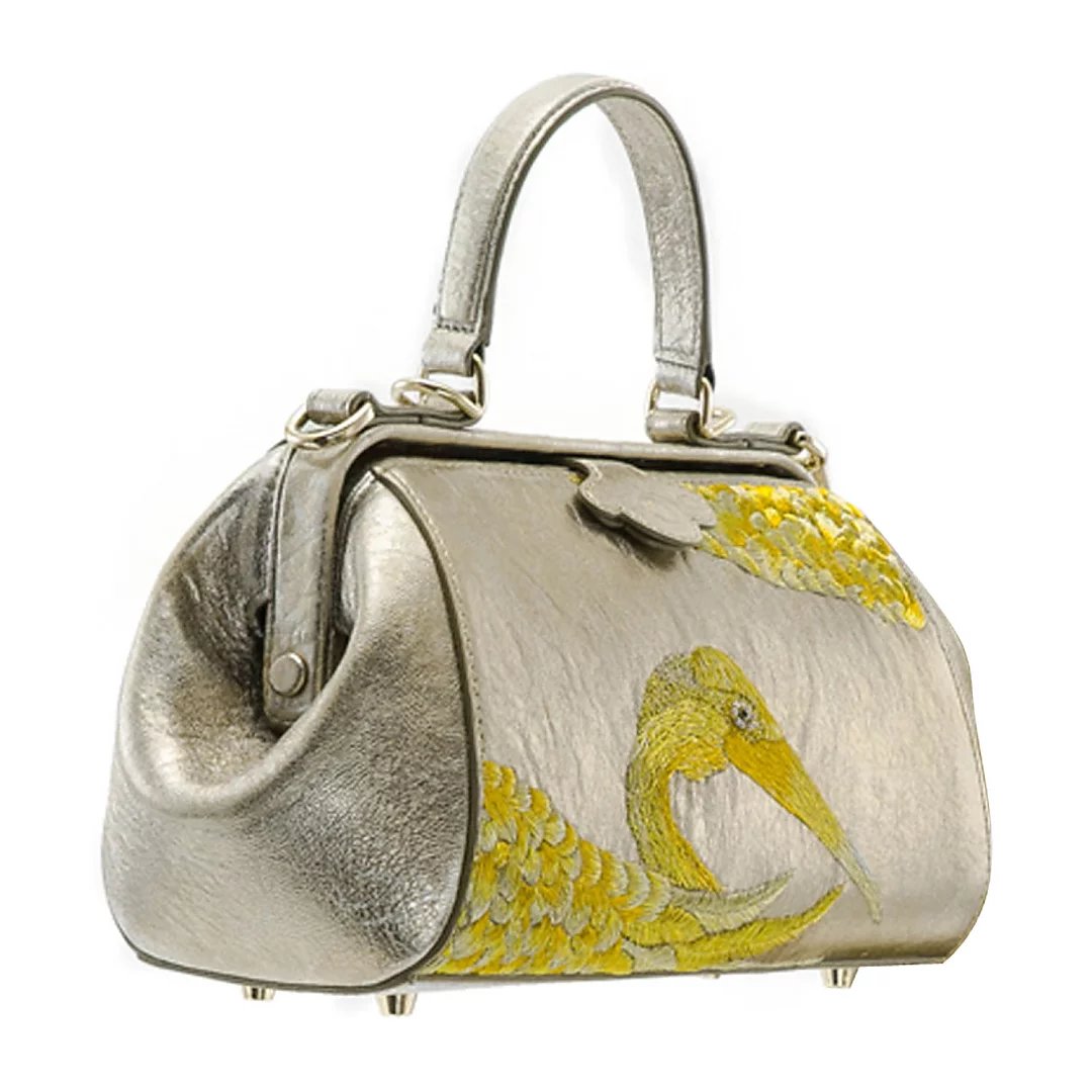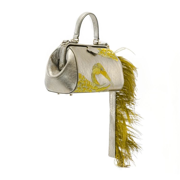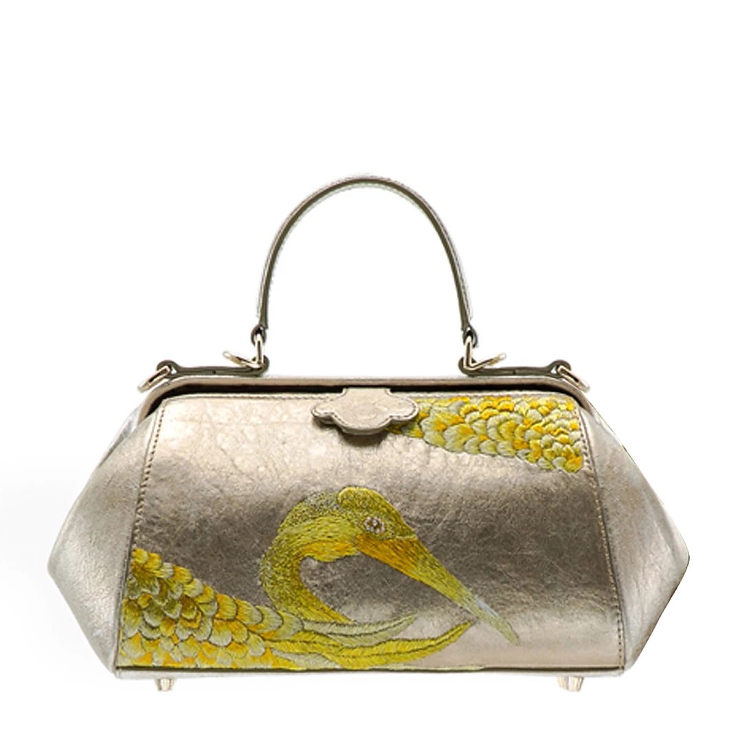 颜色:金色 尺寸:L30xW15 xD11cm 材质:进口优质羊皮(绸缎内里) 标配:可拆卸长肩带(无鸵鸟毛) 选配:鸵鸟毛肩带(价格1000元) 采用手工真皮古法刺绣,在浅金色缩纹羊皮上,刺绣仙鹤的主题形象,与往季大不相同的是,这次的绣片又新增了五种以上针法,来表现仙鹤的羽毛状态与结构特点;每一种针法在真皮材质上的尝试,都耗费了更多时间与成本,光是刺绣部分就几乎达到了40小时以上,但最终,我们得到了机器不可能达到的,丰富细腻多层次的效果,自然离不开绣娘的精心巧思。 经典Doctor Bag,外观线条流畅,硬挺的铰框带出复古的正式感,配有可拆卸长肩带(无鸵鸟毛),手拎肩背、通勤晚宴无缝衔接,包包虽小巧精致,却容量惊人,不易变形。浅金色法国进口自然肌理羊皮,手感柔软,高贵不失轻灵,低调奢华,也是百搭色。同时沿用了瓷说系列的金色瓷珠为景德镇手工匠人专属定做,出产量极低,色泽别致,每件都如艺术品般珍贵,顾客享受到独一无二的体验。