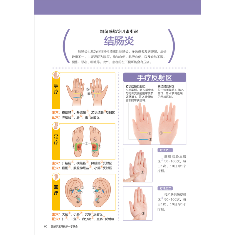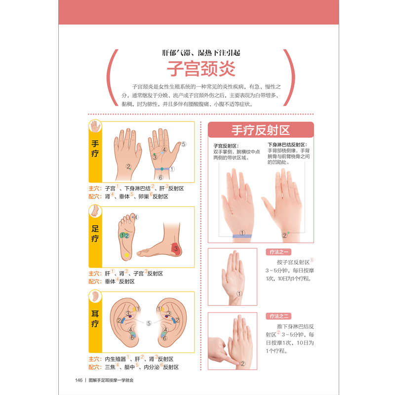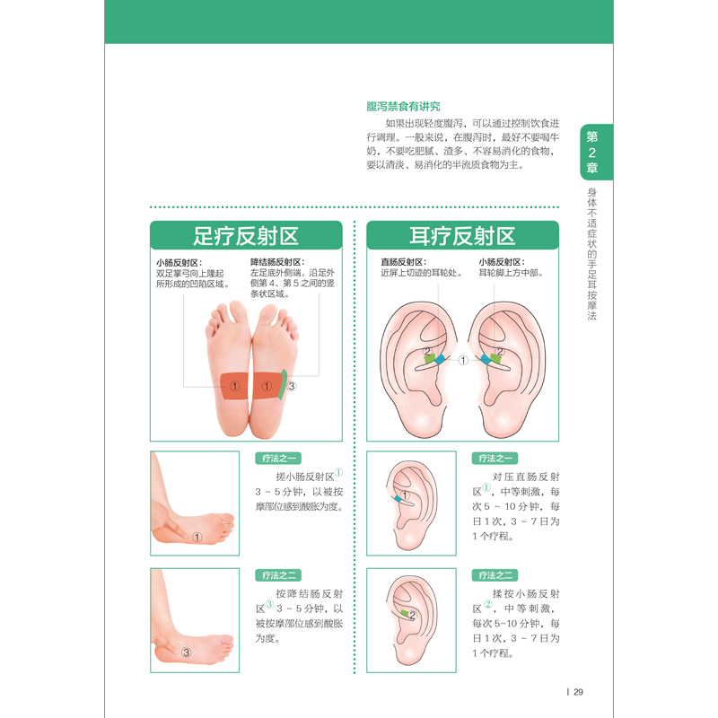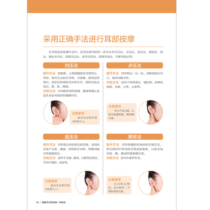 章 手足耳按摩法的基础知识认识手足耳按摩法手部,人体的“外在大脑”采用正确手法进行手部按摩手部按摩时不可忽视的细节足部,人体的“第二心脏”采用正确手法进行足部按摩足部按摩时不可忽视的细节耳部,人体的缩影采用正确手法进行耳部按摩耳部按摩时不可忽视的细节手足耳按摩前的充足准备这样的情况下不要进行按摩第2章 身体不适症状的手足耳按摩法咳嗽呃逆腹泻便秘尿频盗汗宿醉呕吐头痛眩晕失眠耳鸣牙痛贫血 晕车、晕船进行手足耳按摩之后 第3章 常见内科疾病的手足耳按摩法感冒 哮喘 慢性支气管炎神经衰弱 心律失常 三叉神经痛 高血压 低血压脂血症 中风后遗症胆囊炎急性胃肠炎 慢性胃炎 胃下垂 消化性溃疡糖尿病神奇的“芳香SPA”第4章 常见外科疾病的手足耳按摩法结肠炎 慢性阑尾炎痔疮落枕颈椎病肩周炎肋软骨炎网球肘腰肌劳损腰椎间盘突出症坐骨神经痛扭挫伤类风湿关节炎荨麻疹湿疹常做足浴能活血通络、第5章 常见五官科疾病的手足耳按摩法过敏性鼻炎扁桃体炎面瘫中耳炎麦粒肿常按五大保健特区强过吃补品第6章 常见妇产科和男科疾病的手足耳按摩法闭经痛经月经不调子宫肌瘤功能失调性子宫出血盆腔炎性疾病子宫颈炎子宫脱垂白带过多产后少乳急性乳腺炎更年期综合征遗精阳痿前列腺炎女人,要多给自己一点爱 第7章 养颜美体的手足耳按摩法青春痘黄褐斑腿粗肥胖胸部下垂皮肤粗糙面部水肿美,让青春走得慢一些强身健体的第8章 强身健体的手足耳按摩法消除疲劳调理肠胃预防感冒肺部保健大脑保健缓解压力提高注意力房事保健附录 国际针灸穴位图