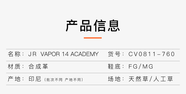 NIKE/耐克 JR VAPOR 14 ACADEMY FG/MG刺客14中端低帮MG大童款足球鞋CV0811760