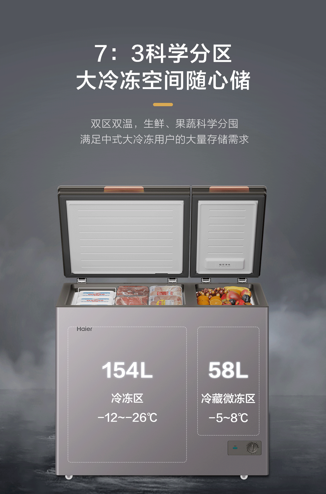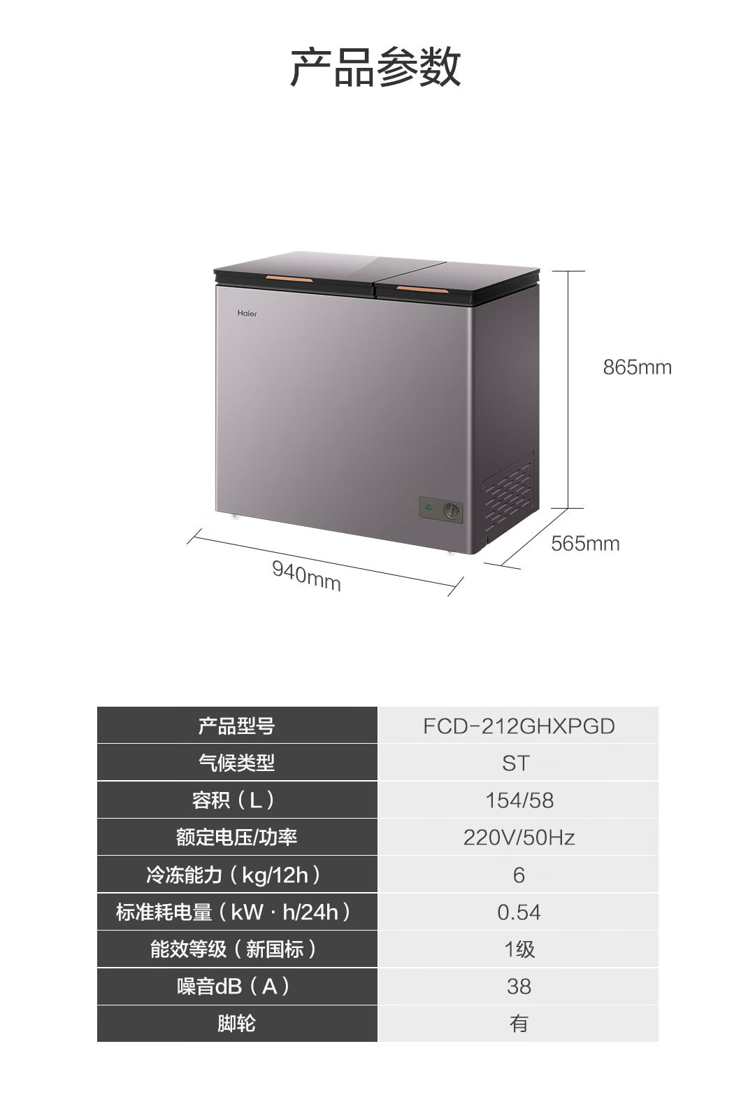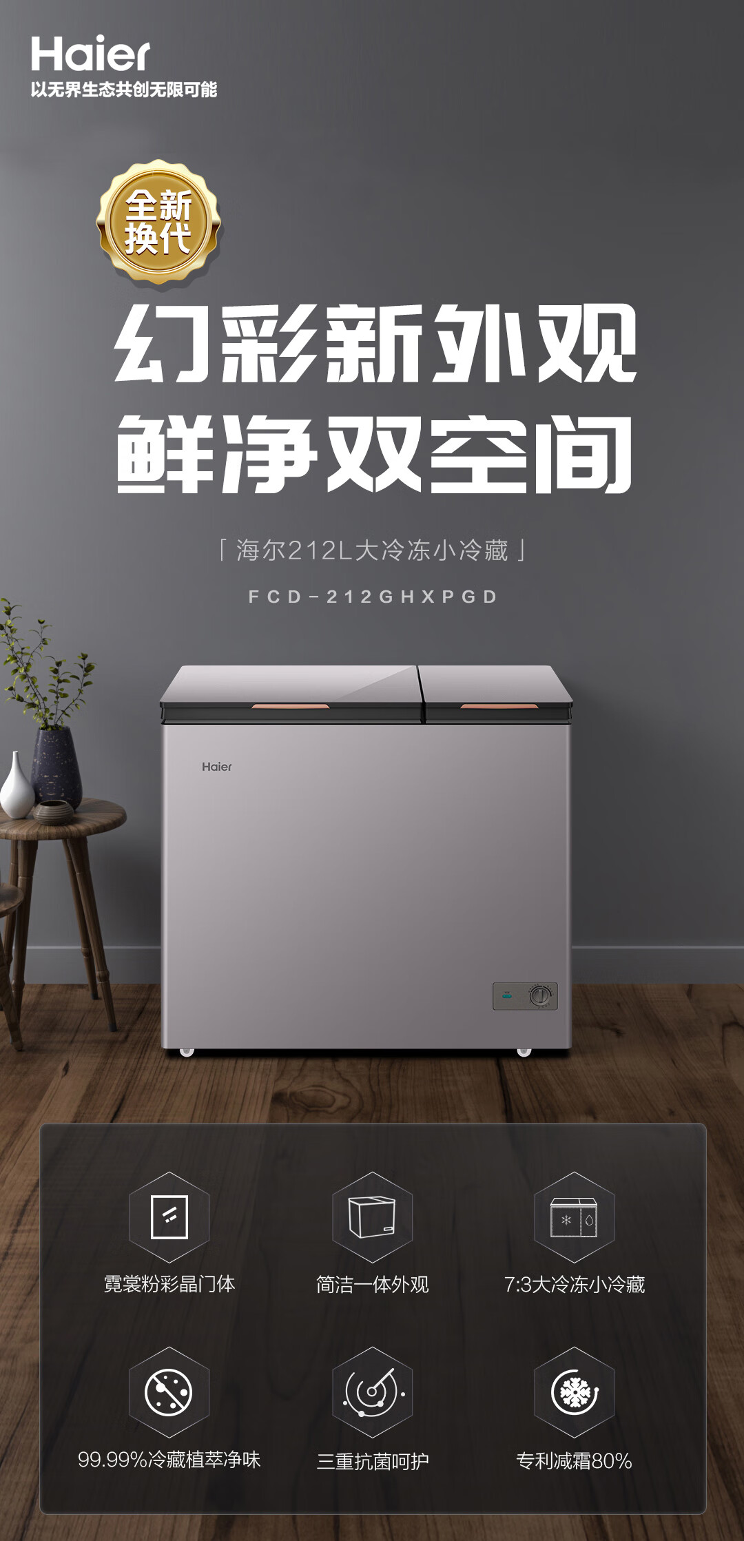 海尔(Haier)212升幻彩系列双箱双温商用家用冰柜 大冷冻小冷藏卧式冰柜家用小型冰箱冷柜FCD-212GHXPGD