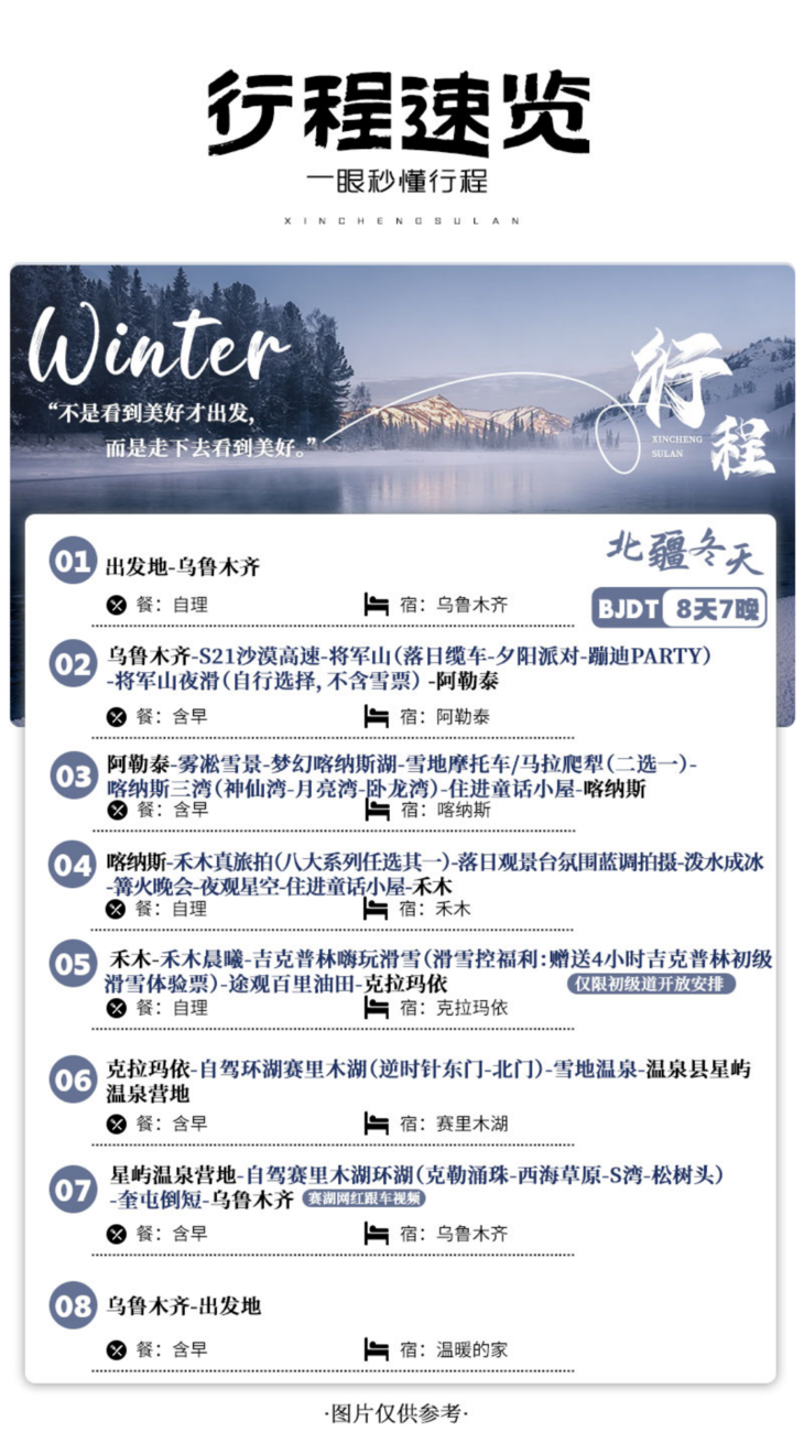 6人小团丨新疆雪域旅拍、喀纳斯&禾木童话世界、赛里木湖环湖&温泉、吉克普林滑雪8天(天天出发,2人成团)