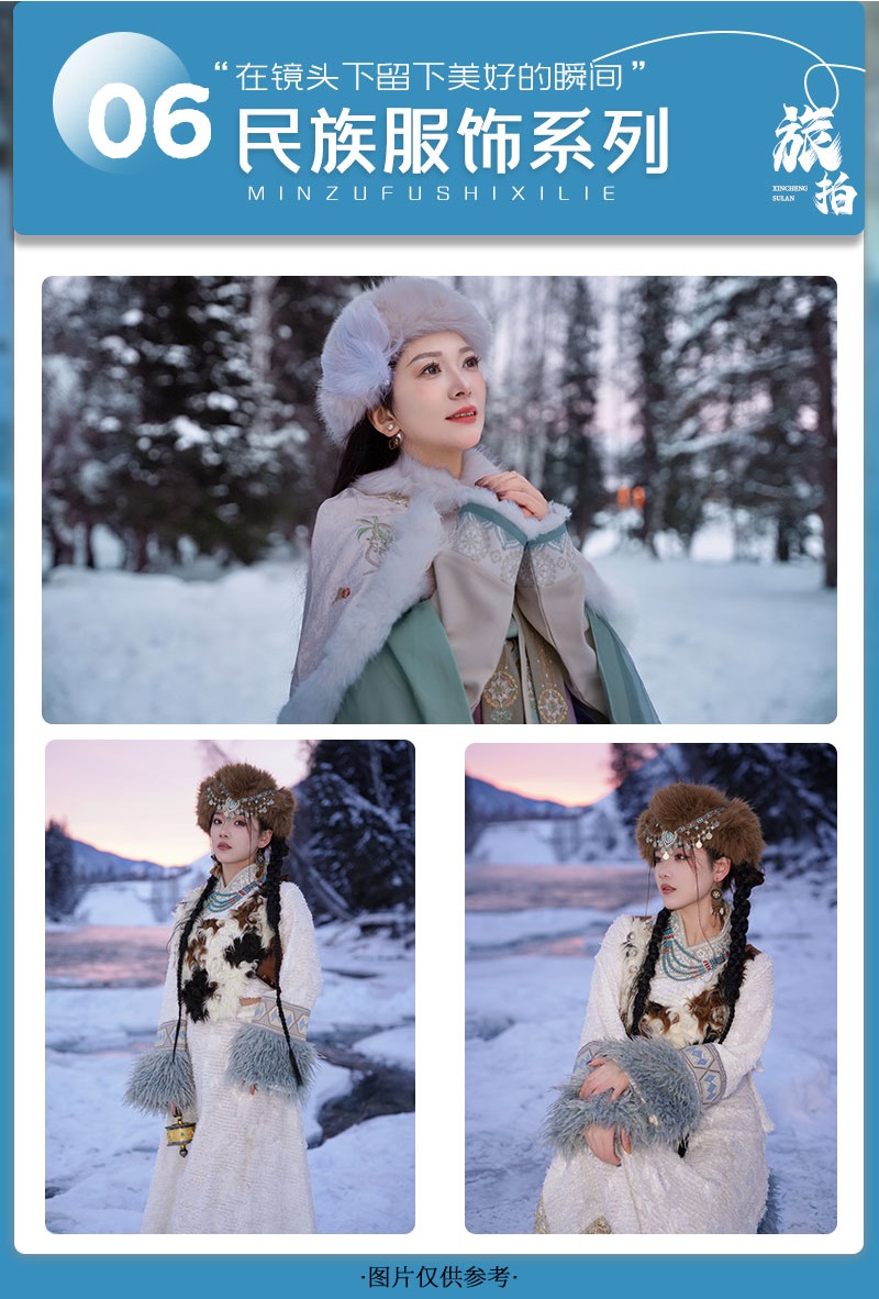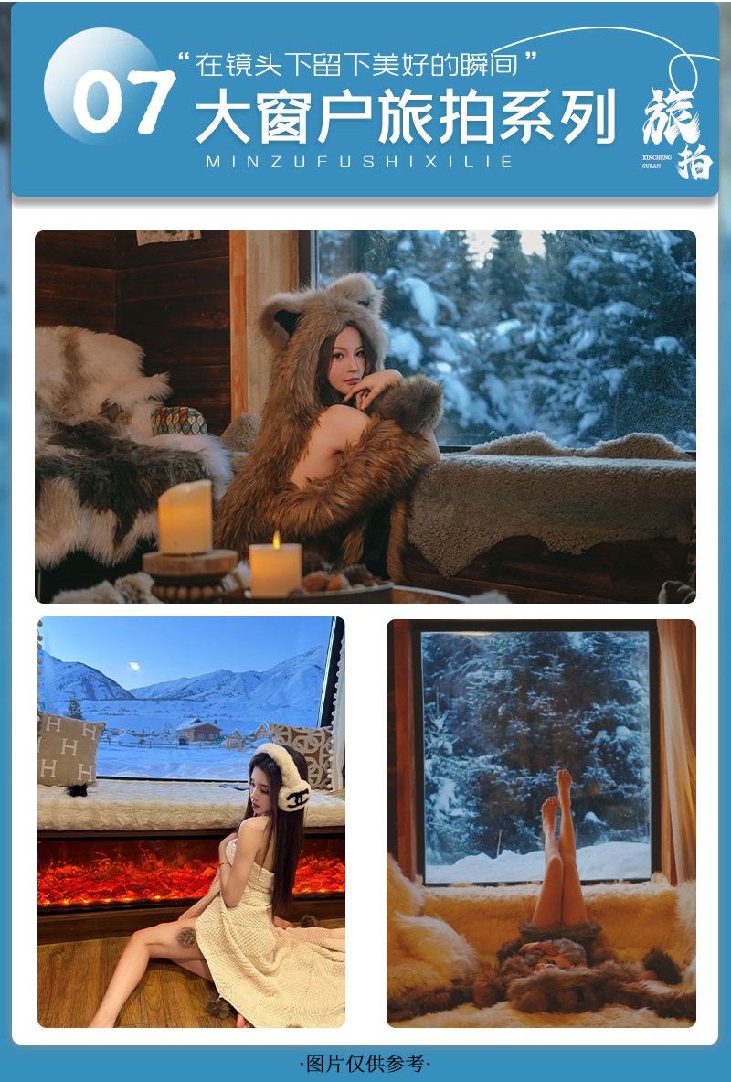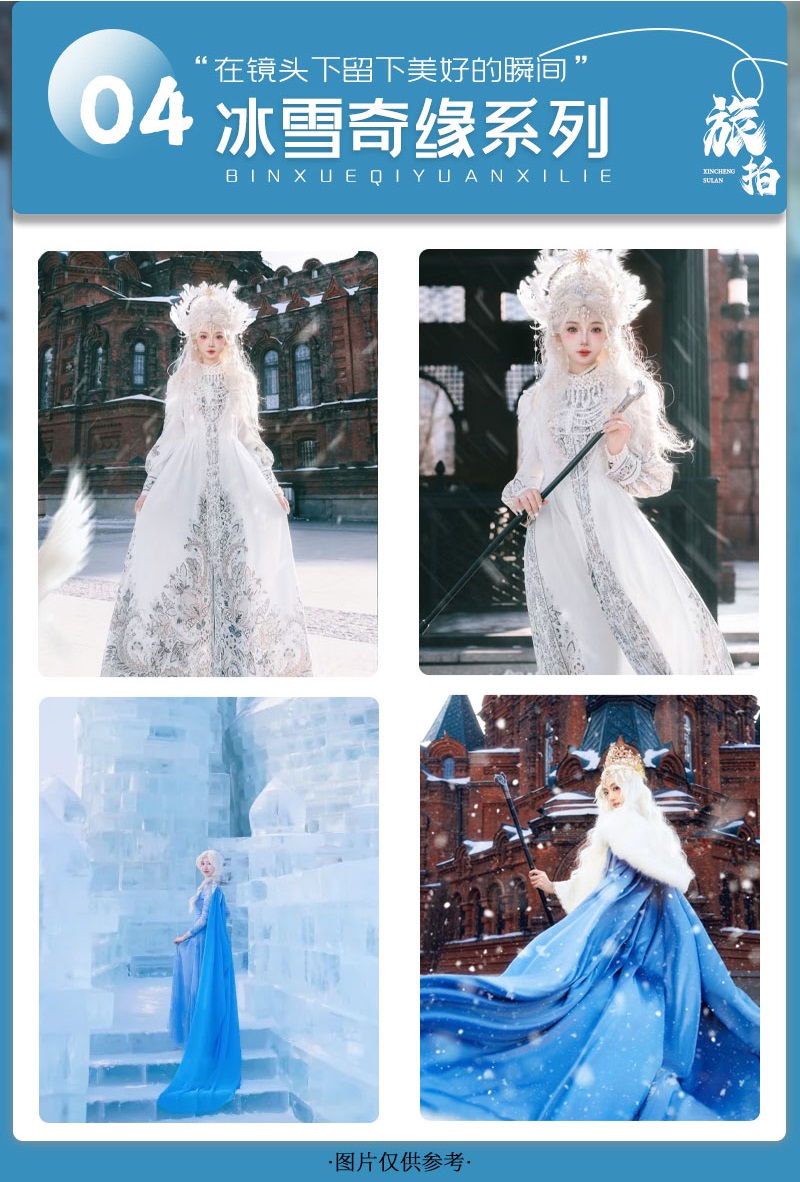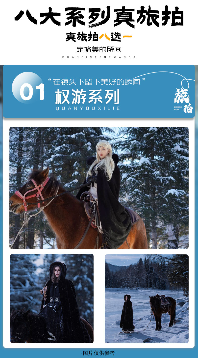 冰雪奇缘、权利的游戏电影同款、战国雪地、黑天鹅系列、大牌雪具滑雪、民族系列、大窗系列、雪域部落少女系列。