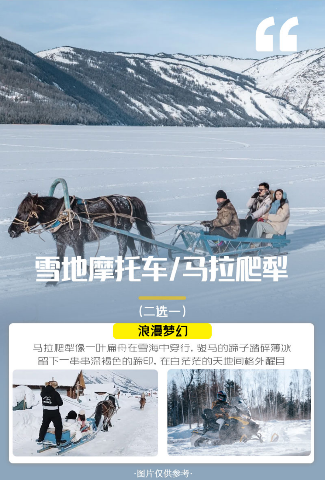 4.开放安排喀纳斯马拉爬犁(约20分钟)/雪地摩托(二选一)(赠送项目因个人原因不去不退)