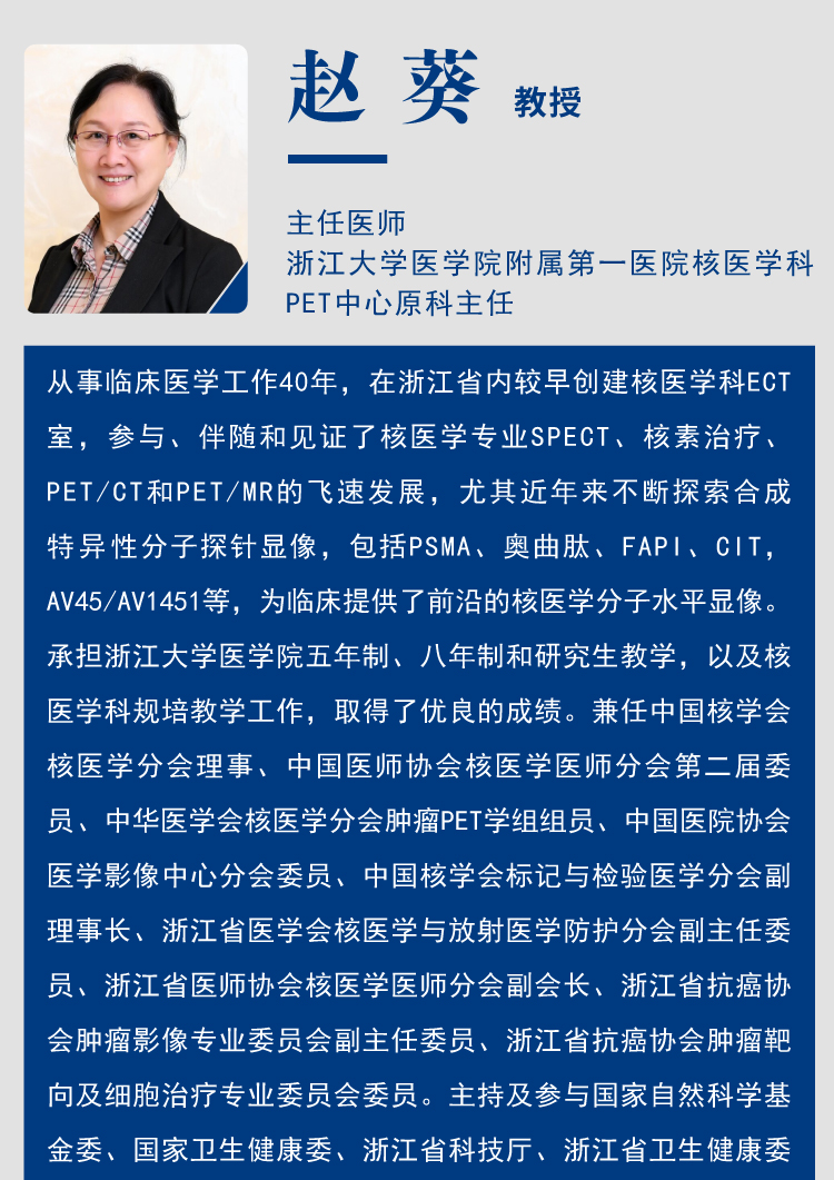 主任医师,浙江大学医学院附属di一医院核医学科PET中心原科主任。