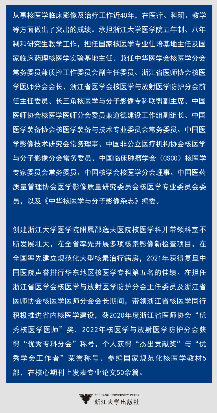 从事临床医学工作40年,在浙江省内较早创建核医学科ECT室,参与、伴随和见证了核医学专业SPECT、核素治疗、PET/CT和PET/MR的飞速发展,尤其近年来不断探索合成特异性分子探针显像,包括PSMA、奥曲肽、FAPI、CIT,AV45/AV1451等,为临床提供了前沿的核医学分子水平显像。承担浙江大学医学院五年制、八年制和研究生教学,以及核医学科规培教学工作,取得了优良的成绩。兼任中国核学会核医学分会理事、中国医师协会核医学医师分会第二届委员、中华医学会核医学分会肿瘤PET学组组员、中国医院协会医学影像中心分会委员、中国核学会标记与检验医学分会副理事长、浙江省医学会核医学与放射医学防护分会副主任委员、浙江省医师协会核医学医师分会副会长、浙江省抗癌协会肿瘤影像专业委员会副主任委员、浙江省抗癌协会肿瘤靶向及细胞治疗专业委员会委员。主持及参与国家自然科学基金委、国家卫生健康委、浙江省科技厅、浙江省卫生健康委等的各类课题多项。主编参编专著10余部,发表论文30余篇。连续10余年组织举办国家ji核医学分子影像新进展继教项目,并策划及参与浙江省核医学分会的学术活动,组织举办正电子PET/CT每周一次的读片活动并深受同道好评。组织浙江省内同道编写“PET/CT,SPECT与PET/MR疑难病例集萃”系列著作,有力推动了浙江省核医学的发展。获首届浙江省医师协会核医学医师分会“核星”突出贡献医师奖。