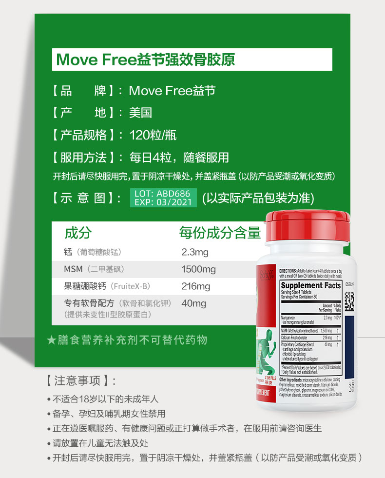 Move Free益节,美国专业关节健康品牌,多年专注关节健康领域。产品拥有氨糖及多和有效成分的科学配方,有效预防、舒缓疼痛,增加润滑,修护关节,让人们免受关节不适带来的痛苦和不便。