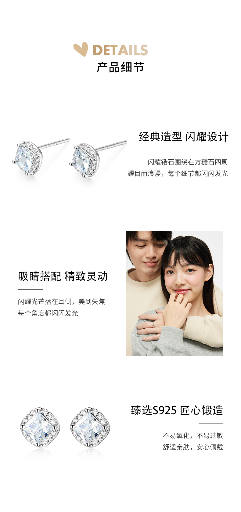 KADER卡蒂罗 时光方糖耳钉 经典百搭时尚设计 闪耀精致款简约大方 S925银 耳钉 女款 银白色