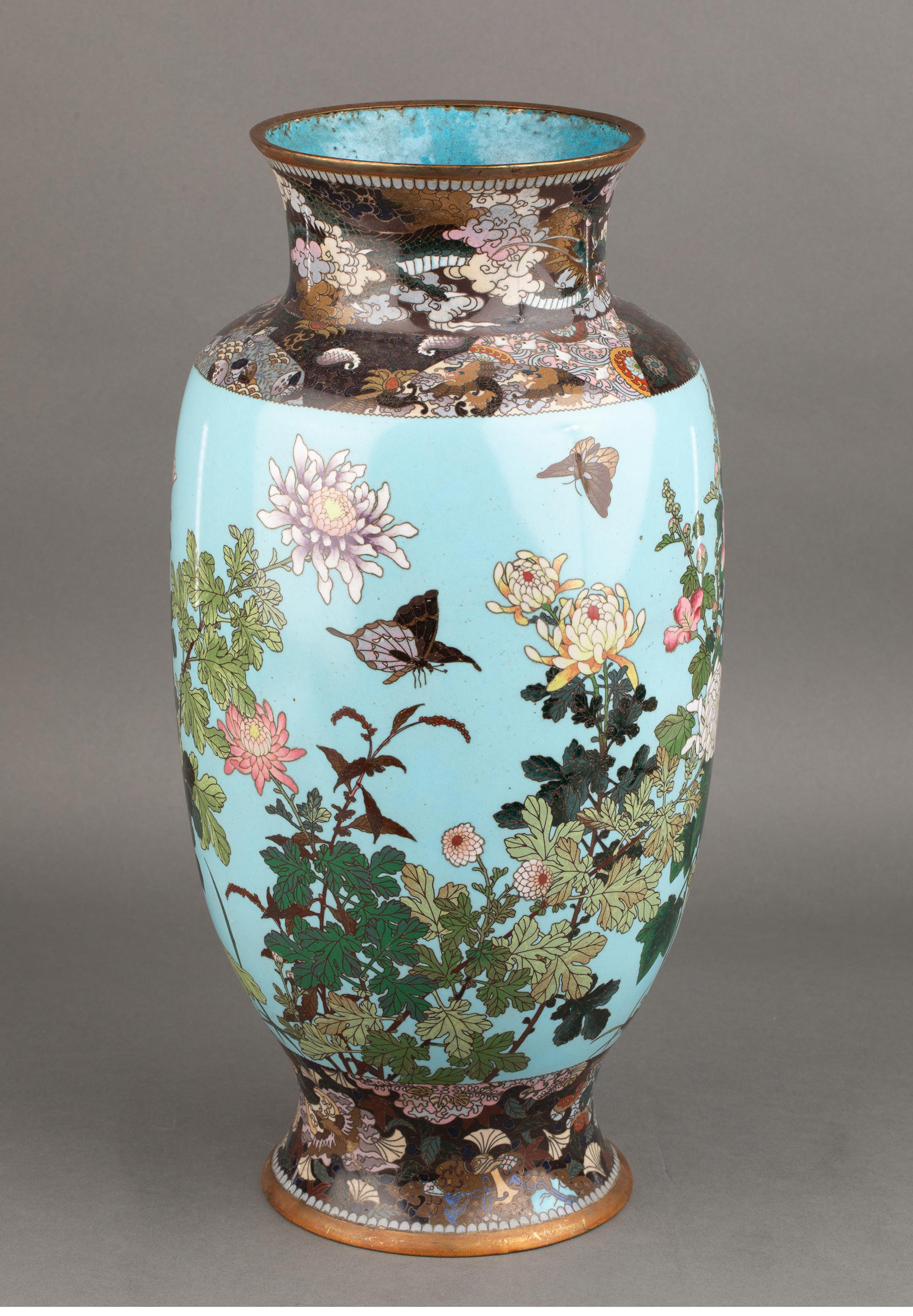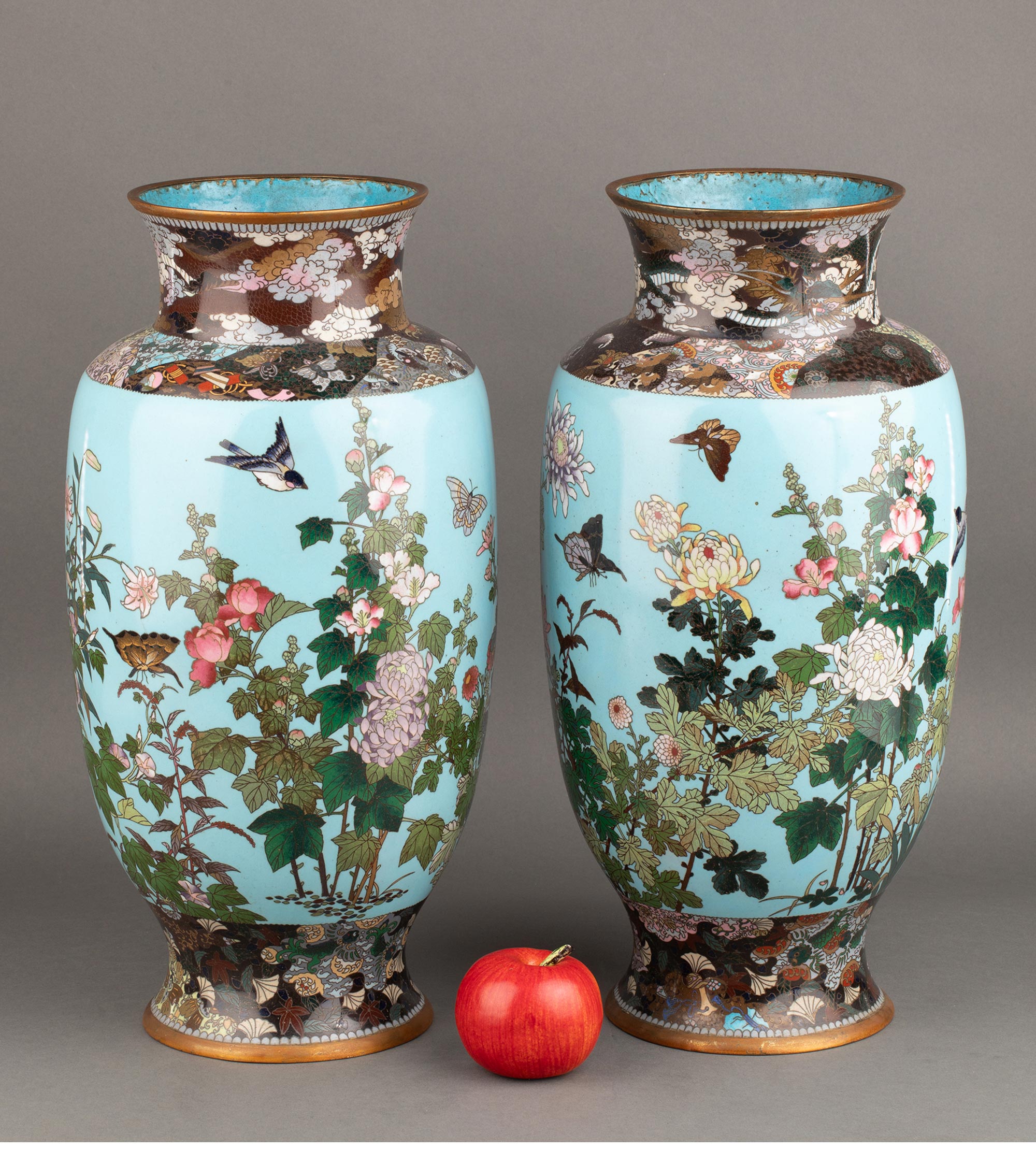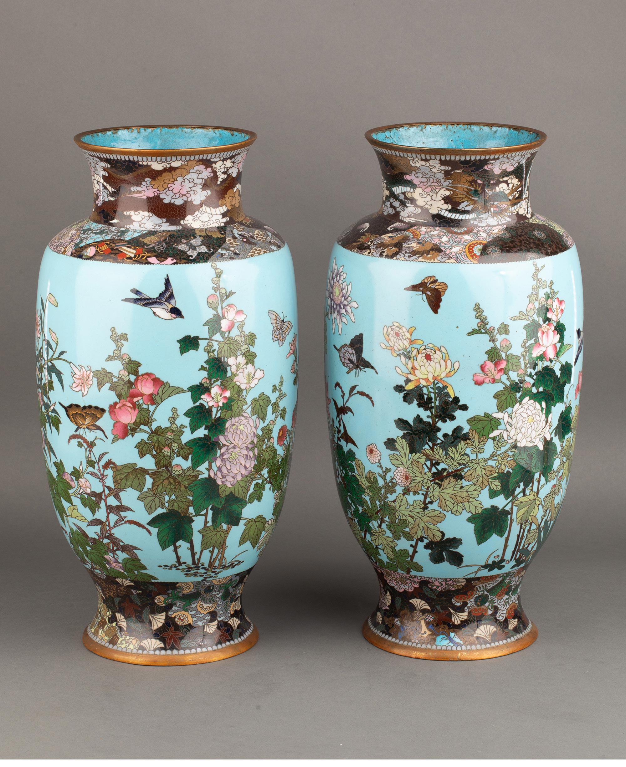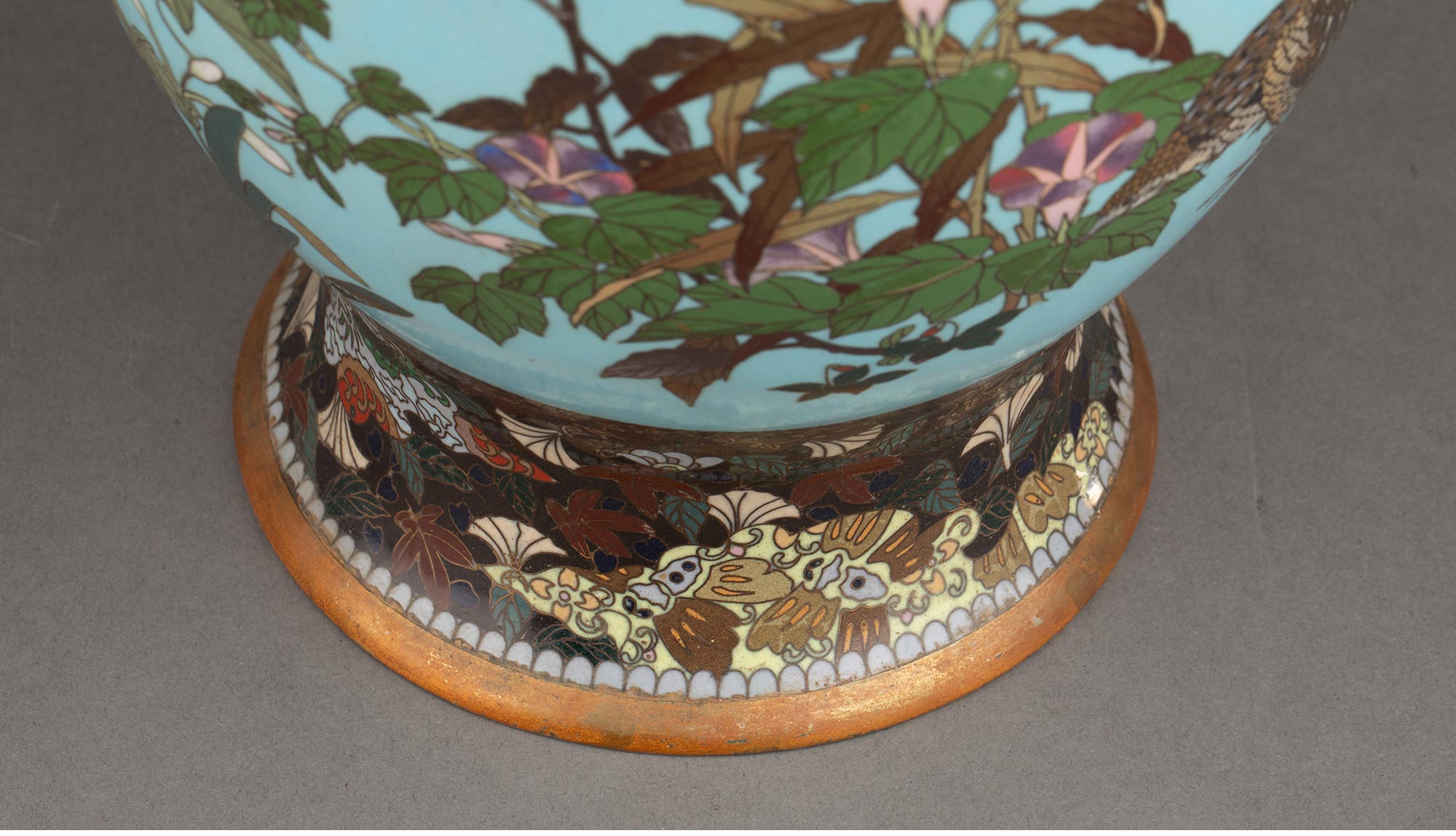 1880年代日本明治时期出品「富贵花鸟」主题修饰蓝地七宝烧花瓶一对