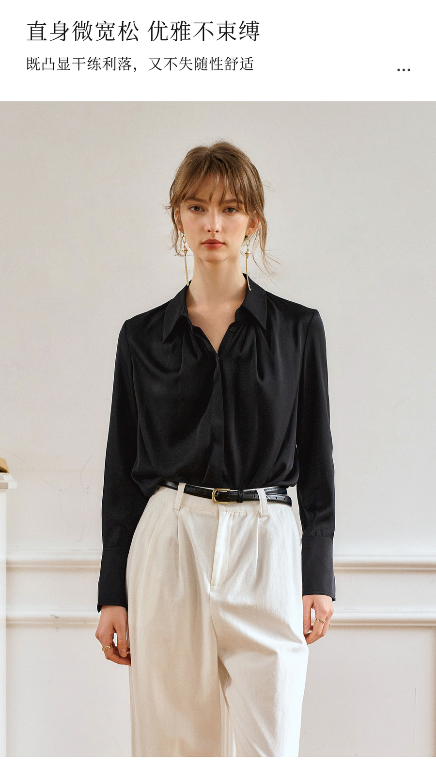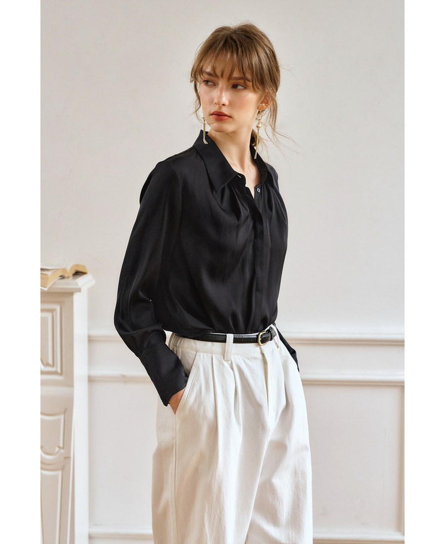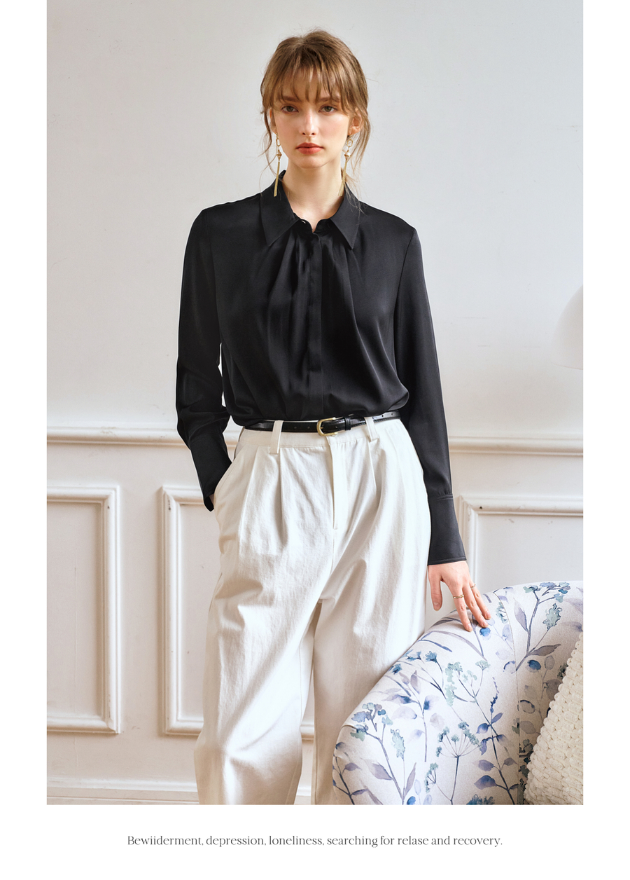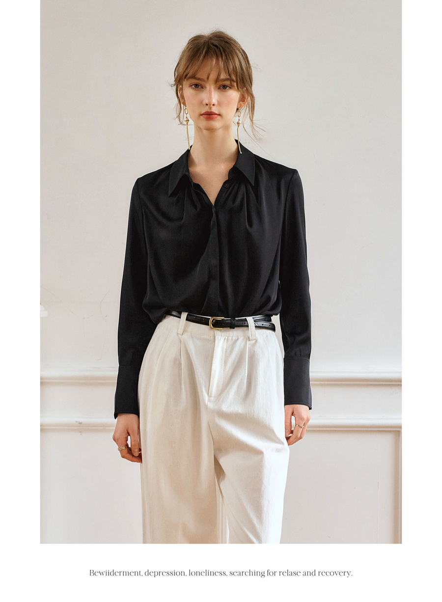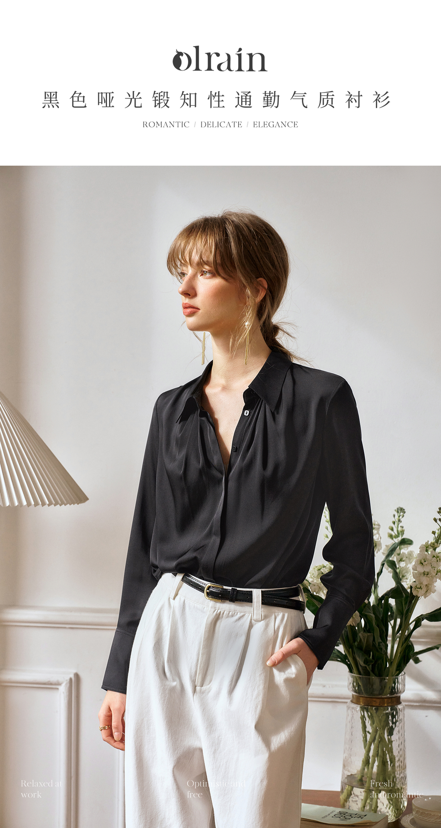 OLrain欧芮儿黑色长袖衬衫女春季2025年新款通勤知性缎面气质衬衣