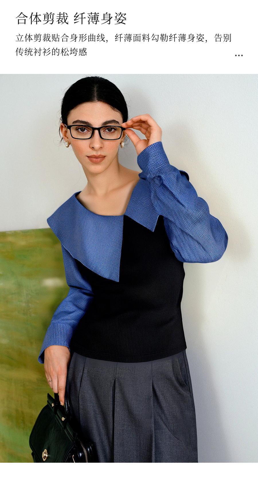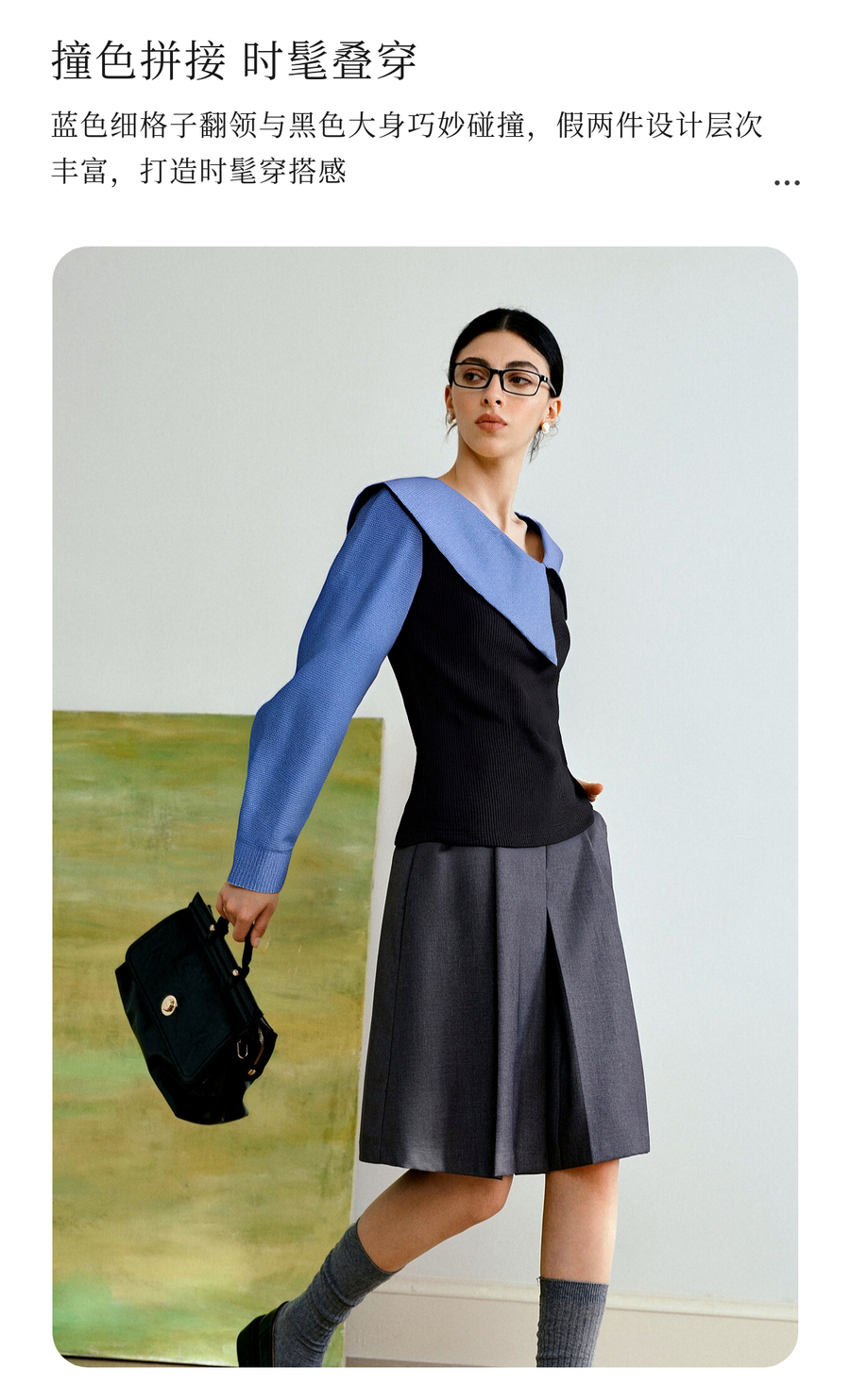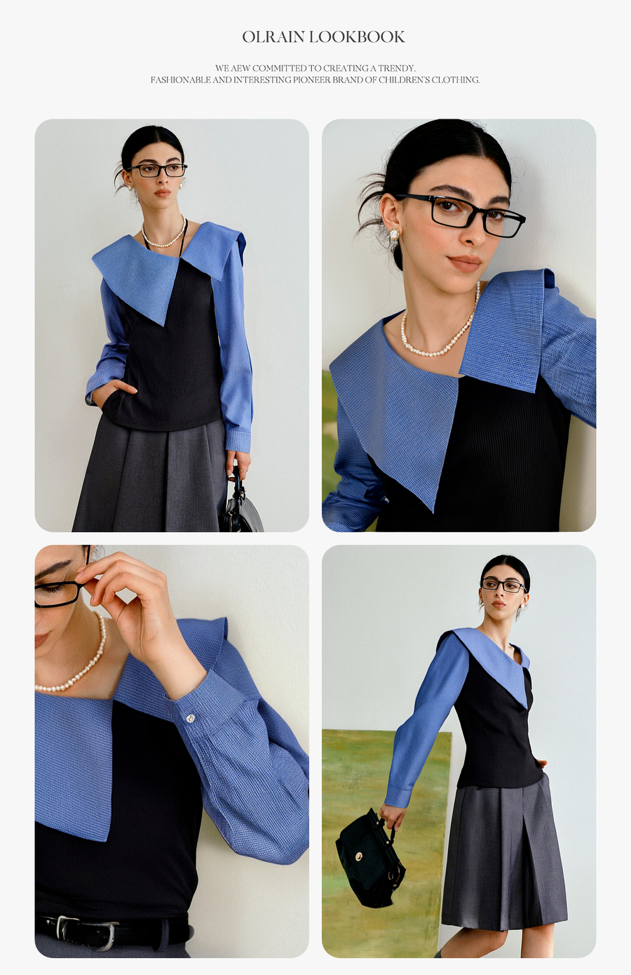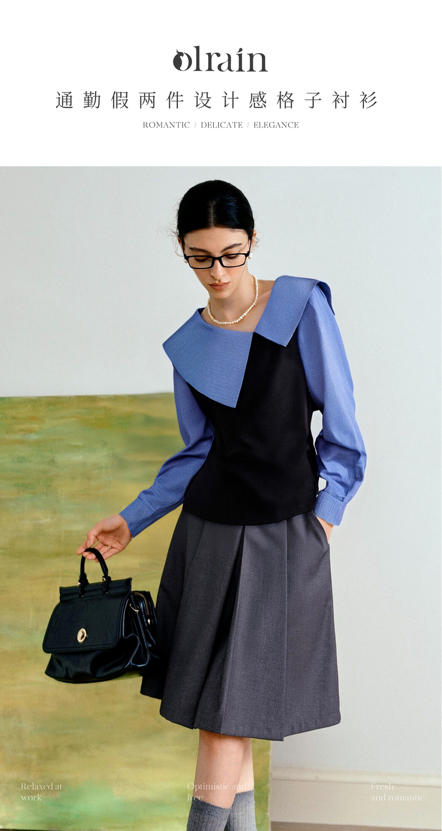 OLrain欧芮儿2025新款女秋季通勤假两件设计感格子套头长袖衬衫
