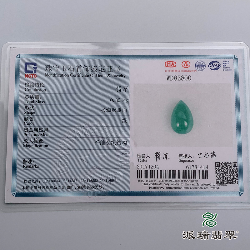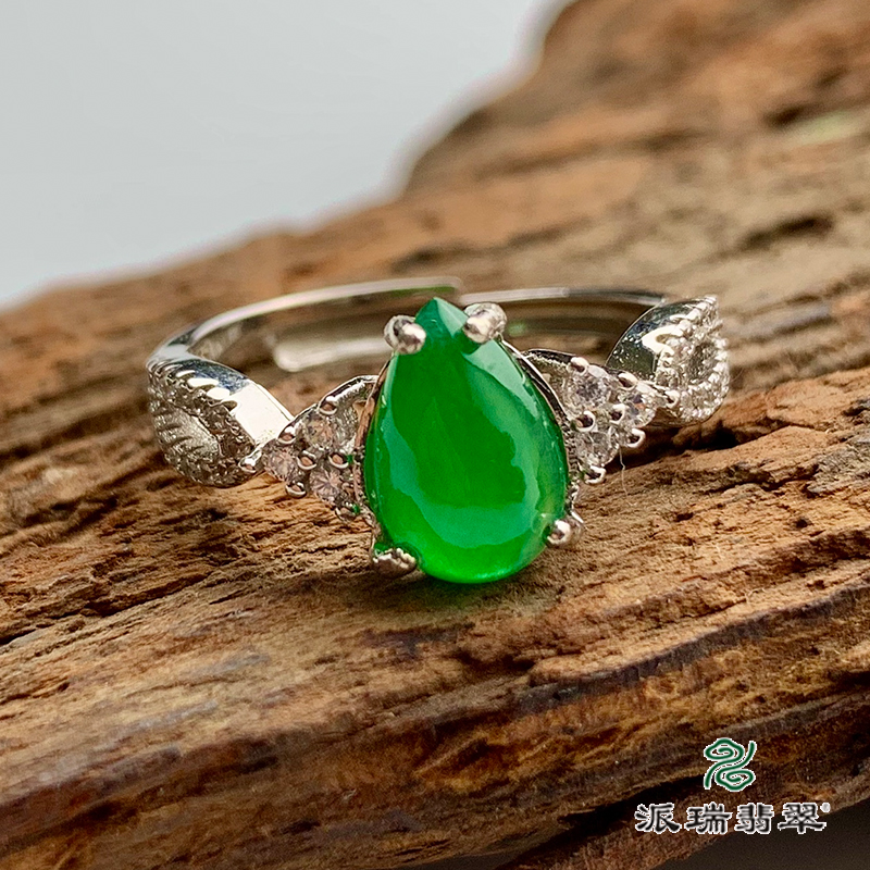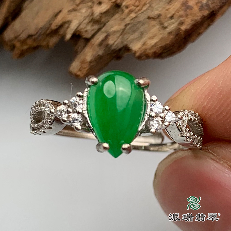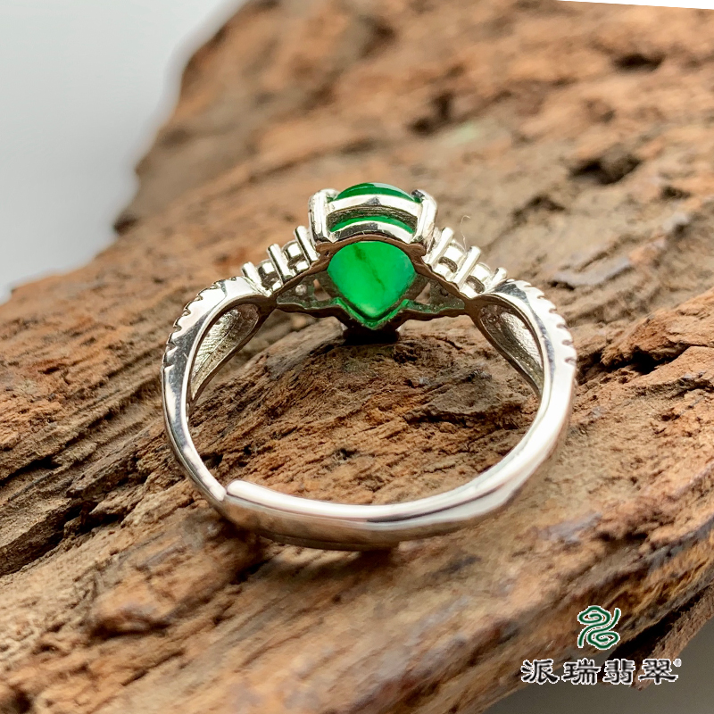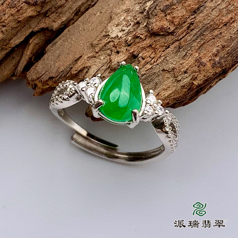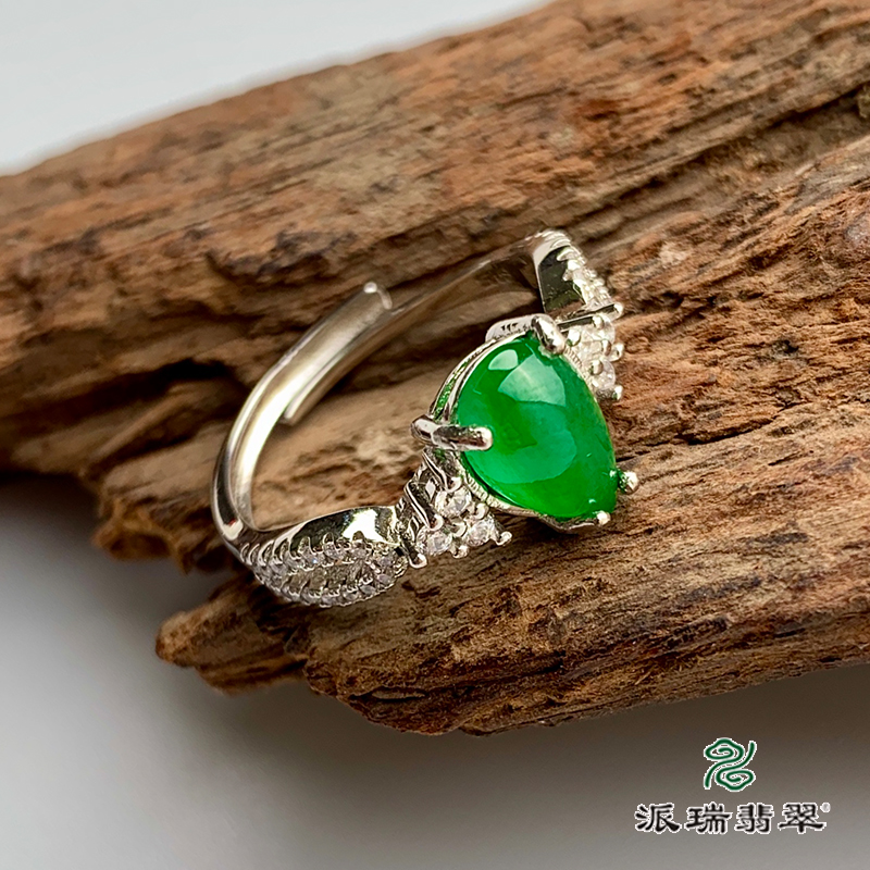 派瑞翡翠 翡翠戒面 冰种 绿色 银托镶嵌