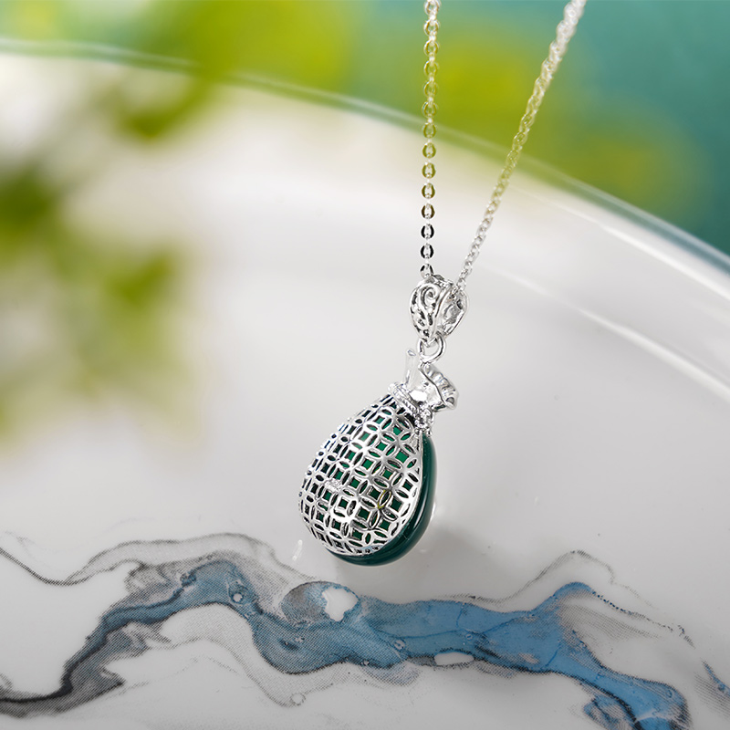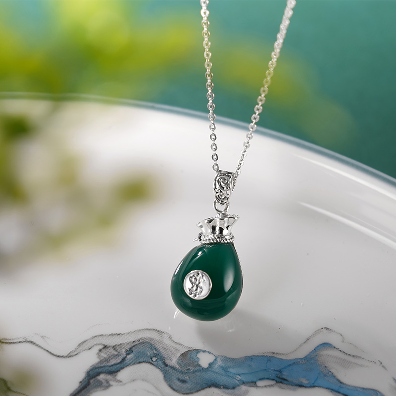 【寓意】:将玉髓温润德性与纯银清雅特质相融,构造了这枚福袋吊坠。流线轮廓勾勒婉约韵致,福袋之形寄寓祥瑞常伴、招财纳福之愿。