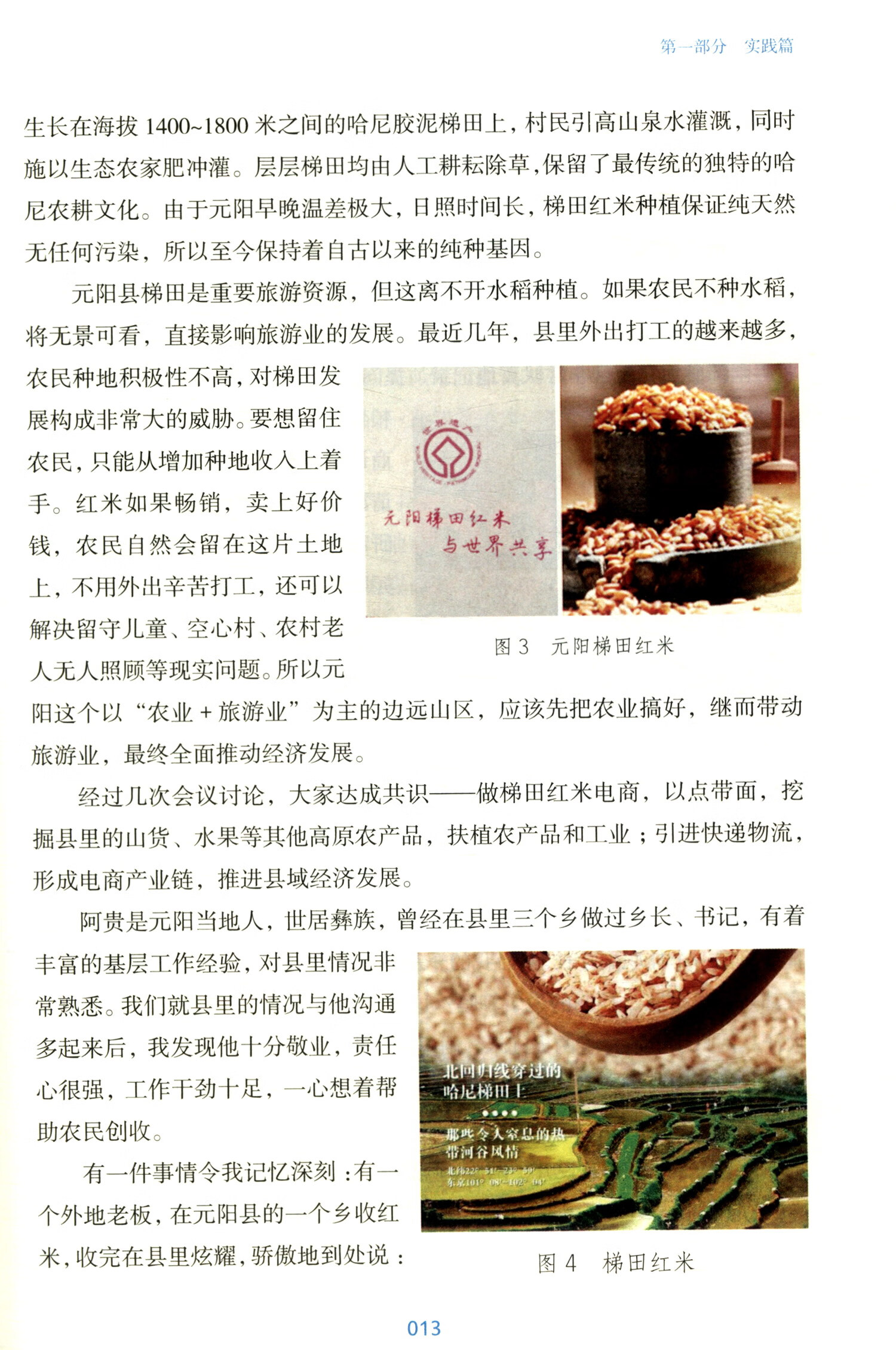 本书从我受教育部和上海财经大学委派,在云南省红河哈尼族彝族自治州元阳县挂职的经历讲起,用解剖麻雀的方法讲述了为一个国家级贫困县插上“互联网+”的翅膀的详细过程,这其中有失败的痛苦,也有成功的喜悦。过程越是艰难,酸甜苦辣体会得自然越深。剖析一个贫困县的“互联网+”之路,不单单是为了讲述其复杂的实践过程,更是为了总结经验,供更多的县域参考借鉴。我将此部分内容记为实践篇。