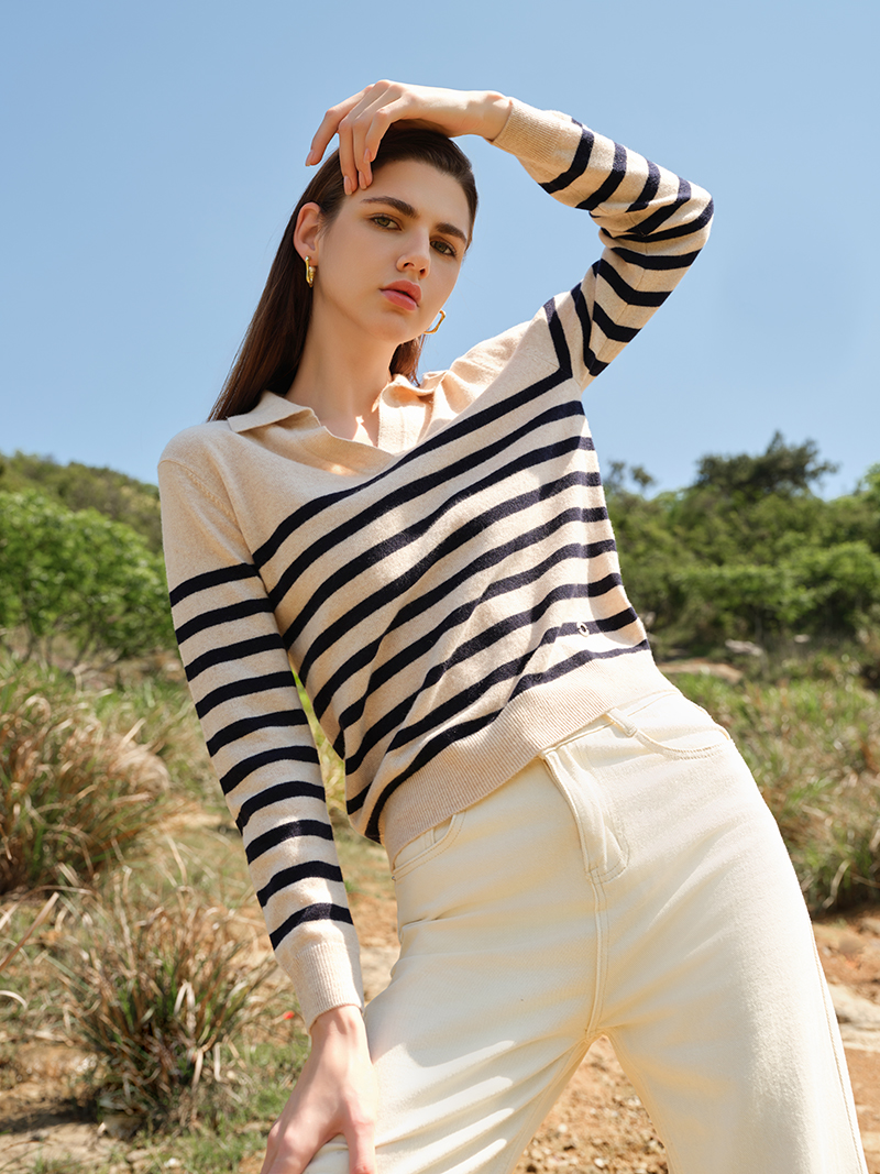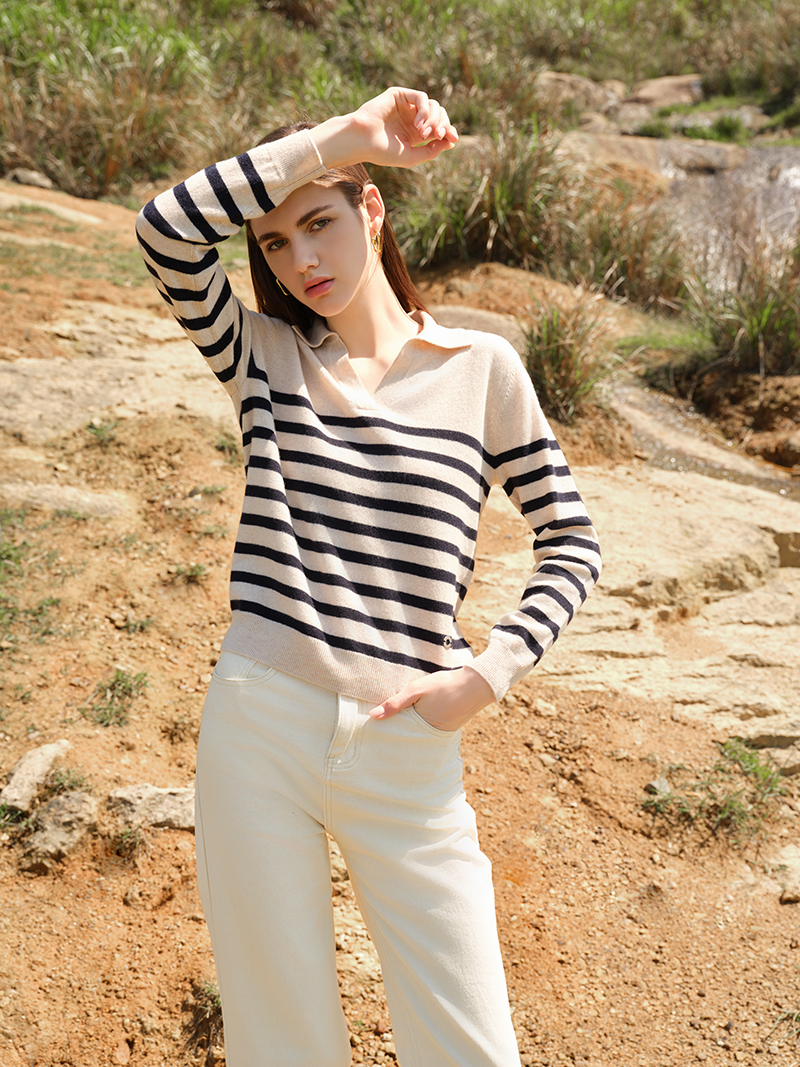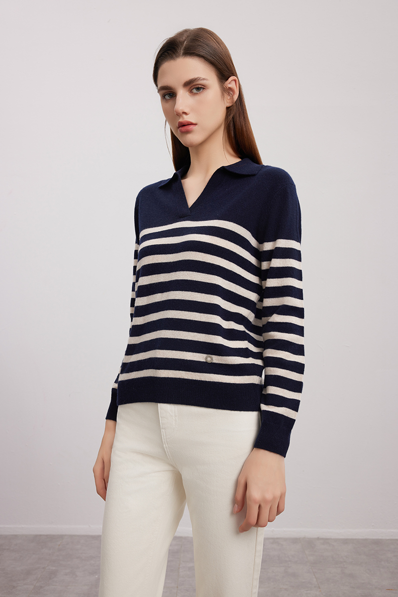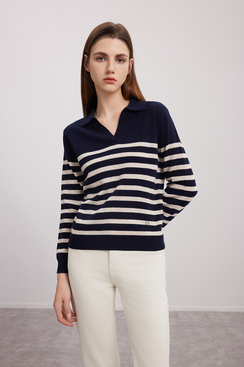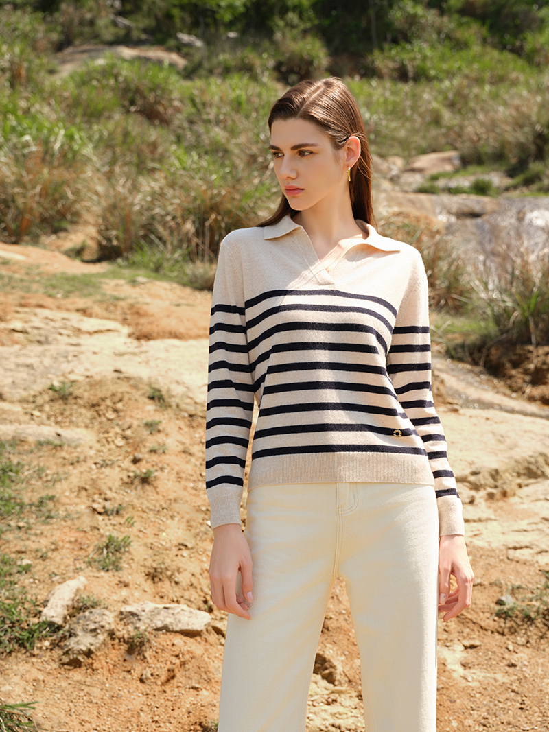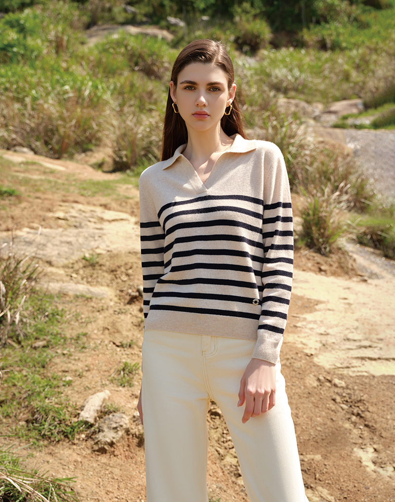 【V领条纹撞色羊绒衫】24年秋冬新品女士100%山羊绒时尚双色毛衣