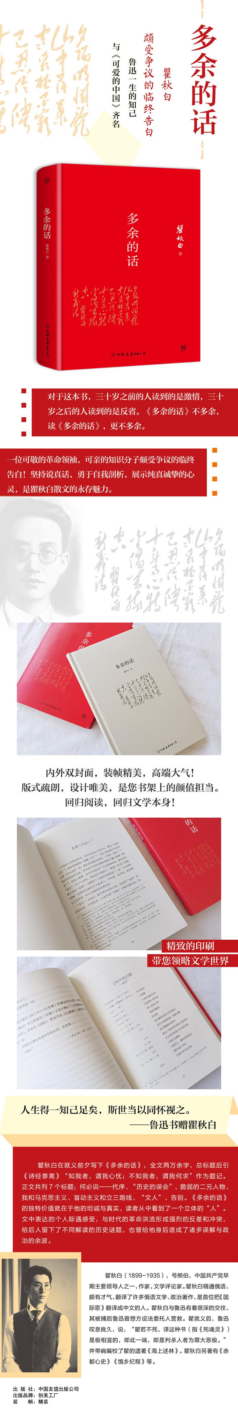 在就义前夕写下的那篇遗文《多余的话》,全文两万余字,正文共列8个标题:何必说――代序、“历史的误会”、脆弱的二元人物、我和马克思主义、盲动主义和立三路线、“文人”、告别、记忆中的日期。其独优惠值在于他的坦诚与真实,读者从中看到了一个立体的“人”。文中表达的个人际遇感受,与时代的革命洪流形成强烈的反差和冲突,给后人留下了不同解读的历史谜题,也曾给他身后造成了诸多误解与政治的余波。