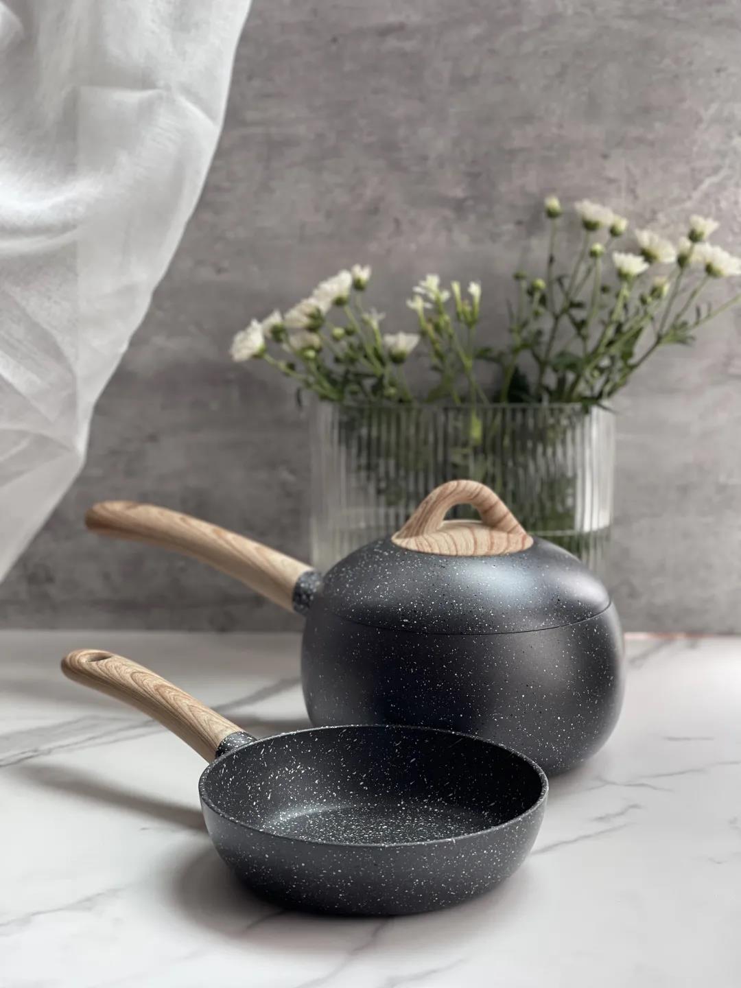 好的材质决定了锅具的烹饪性能,铝合金的不粘材质分量更轻便,加热均匀,烹饪速度快。
