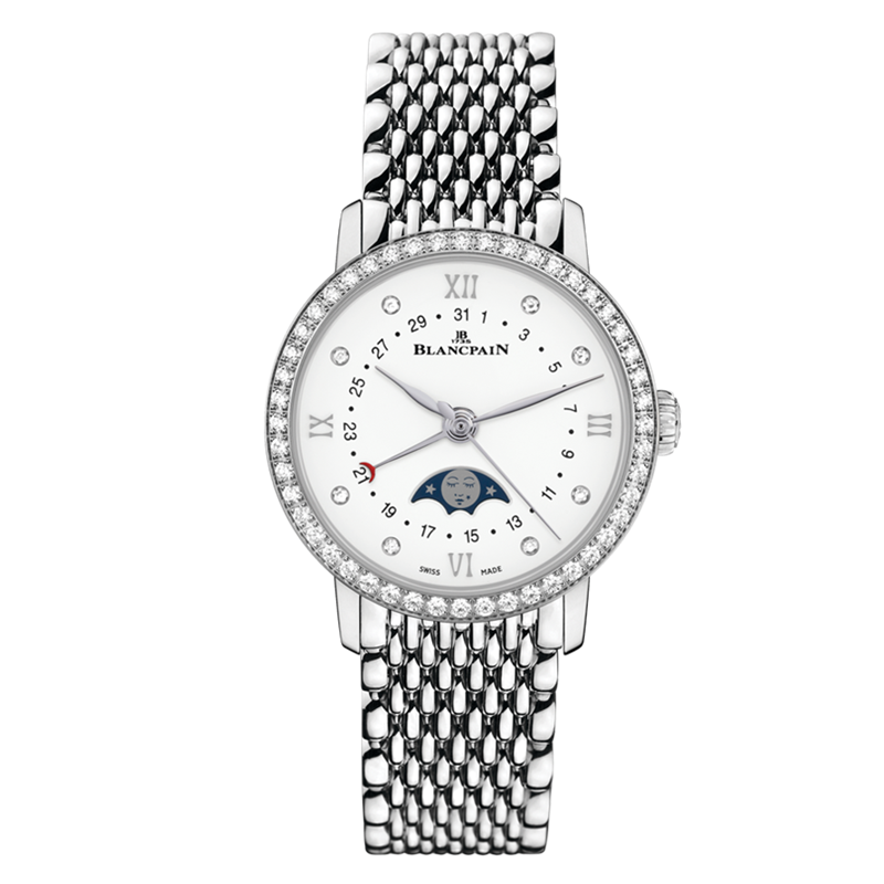 镜面 材质 | 蓝宝石水晶玻璃 | 表盘 | 精钢镶钻表壳 白色表盘 日期显示 月相 |