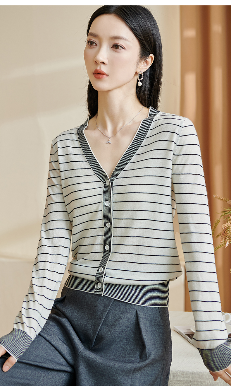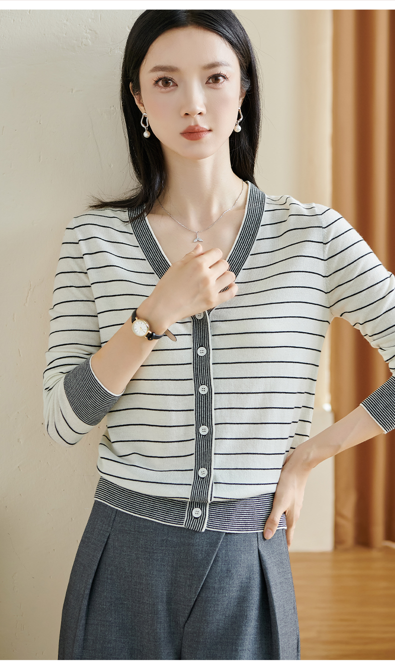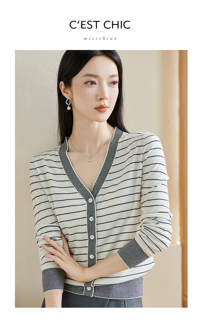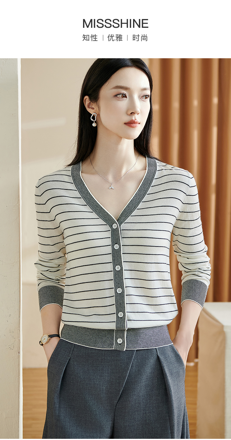 米思阳2026春季新款经典百搭条纹针织衫修身v领纽扣长袖外套2942