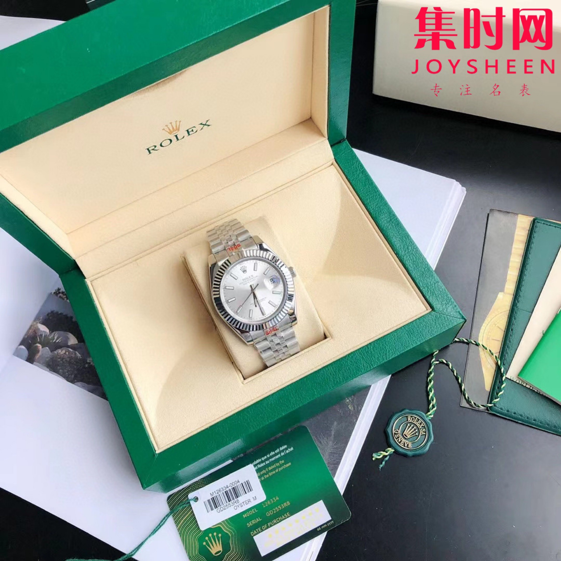 腕表编号、身份卡片、条码条牌的型号、编号一致!