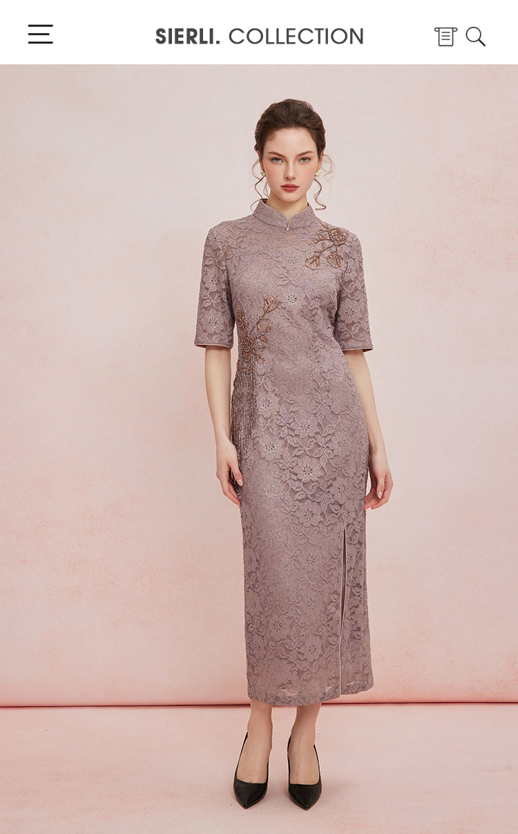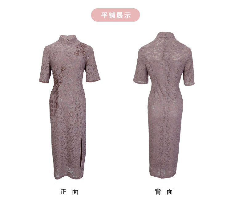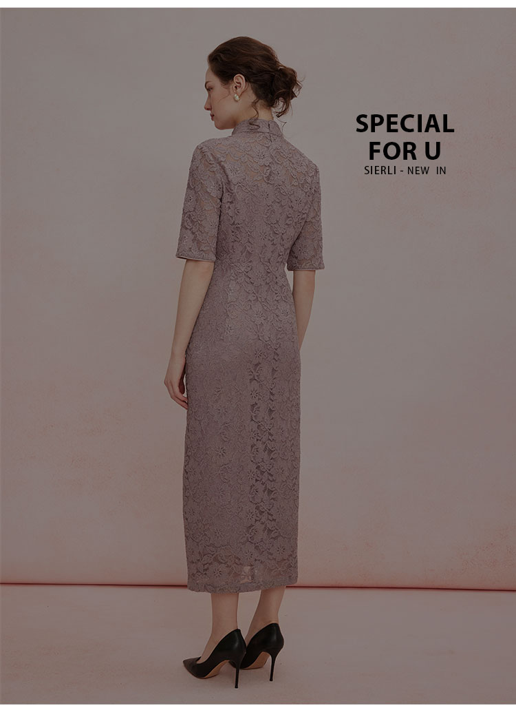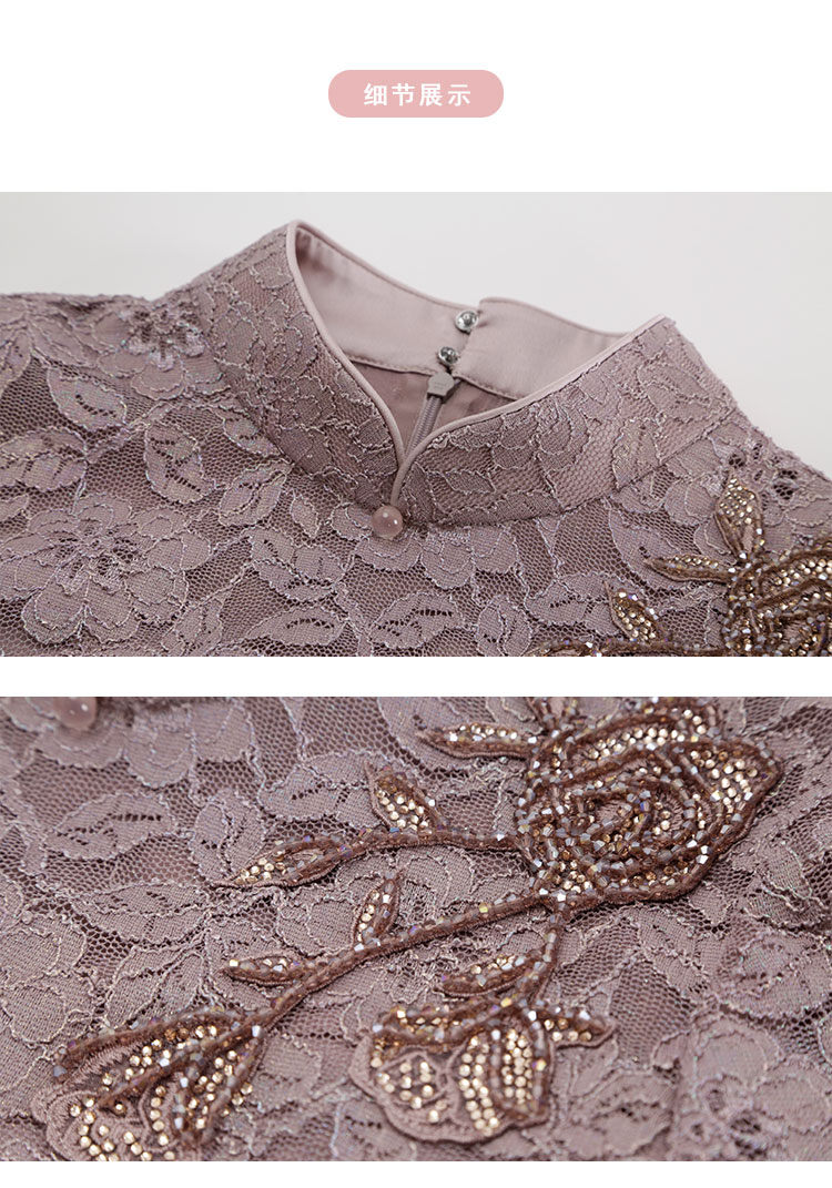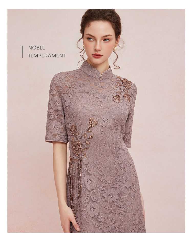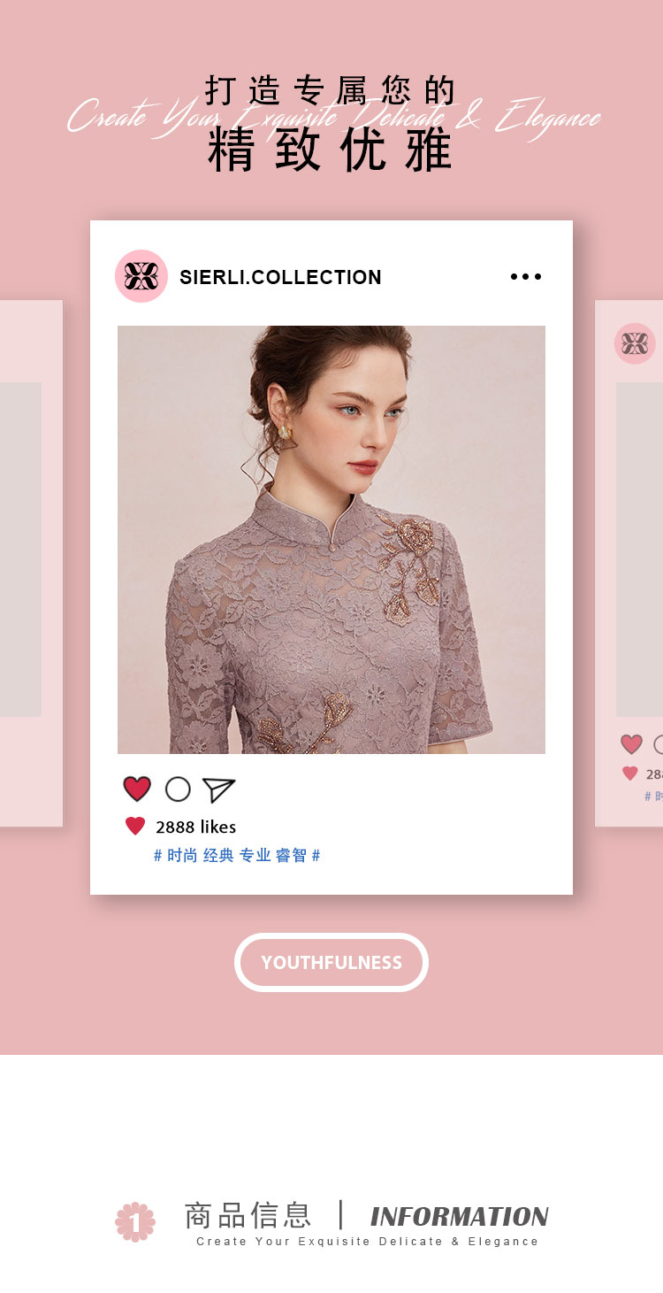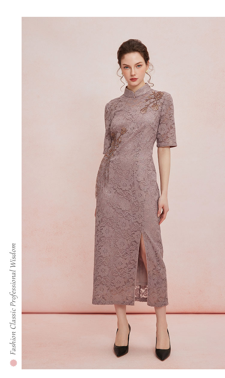 QB804斯尔丽25新款法式浪漫立体刺绣光泽感蕾丝旗袍流苏设计礼服连衣裙