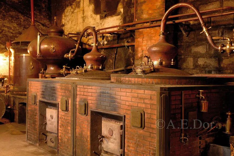 (2)蒸馏:干邑唯一允许使用的蒸馏器类型的是铜制的夏朗德壶式蒸馏器(Copper