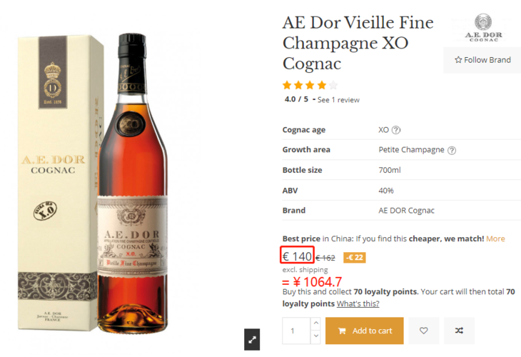 这款酒是红酒百科全书直接从海外采购,减少各种中间商转手的成本。低成本带来低售价,此酒在国际专业干邑网站上的价格超千元,我们的满减价比这还低 39%。