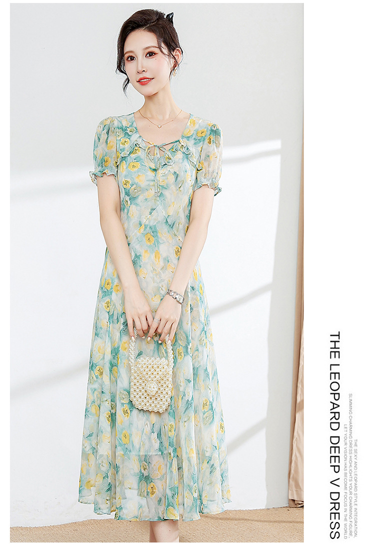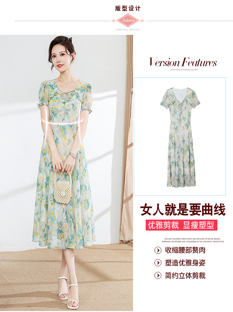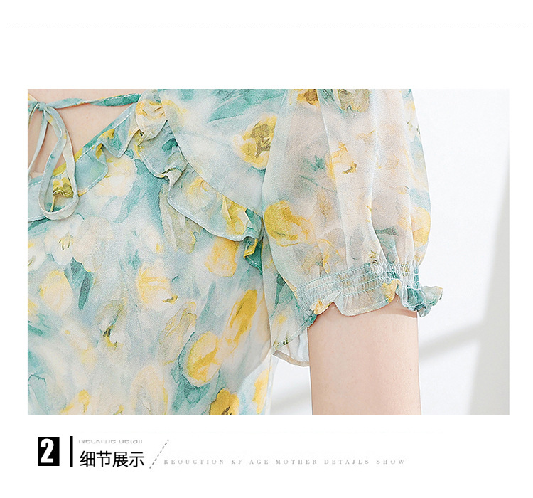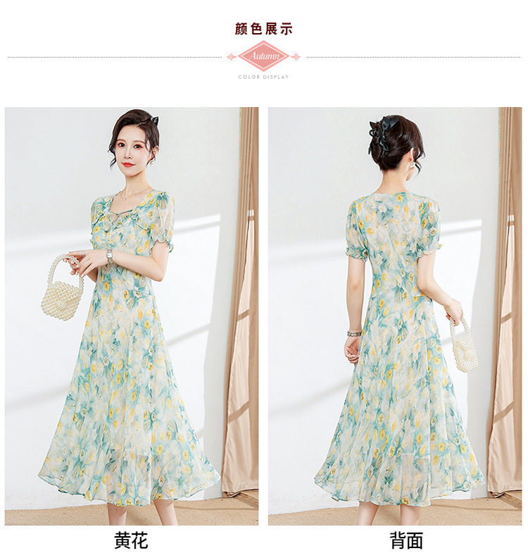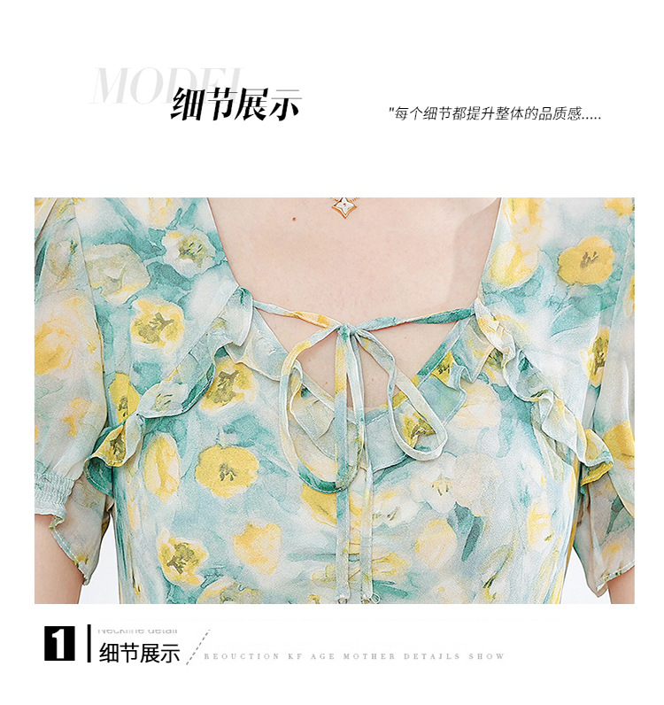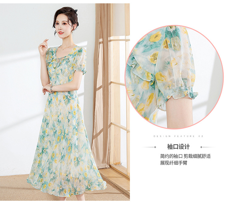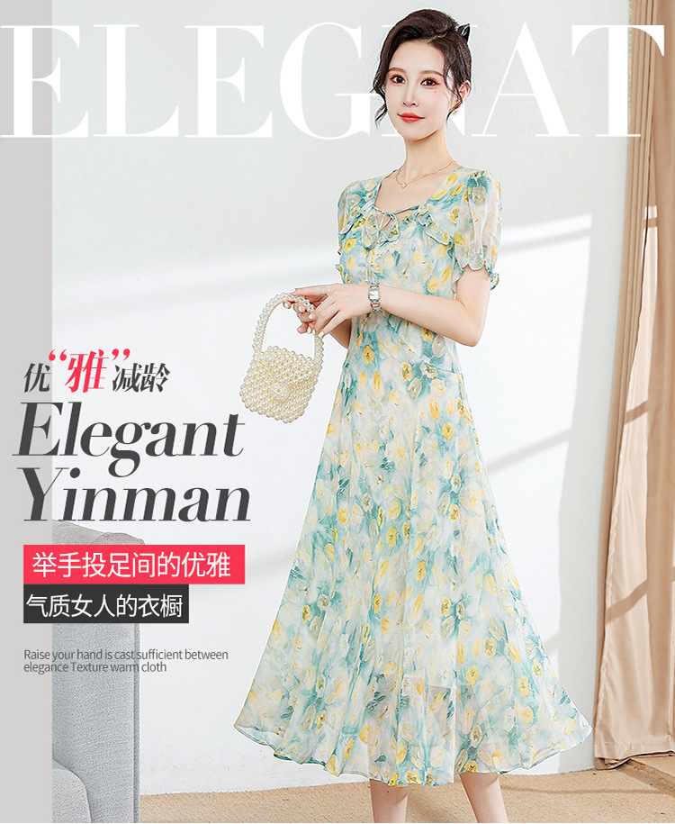 夏季新款,木耳边短袖系带蝴蝶结时尚中长裙女装长裙印花连衣裙QYM-YM-A2346-Y
