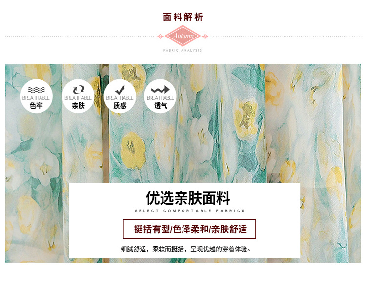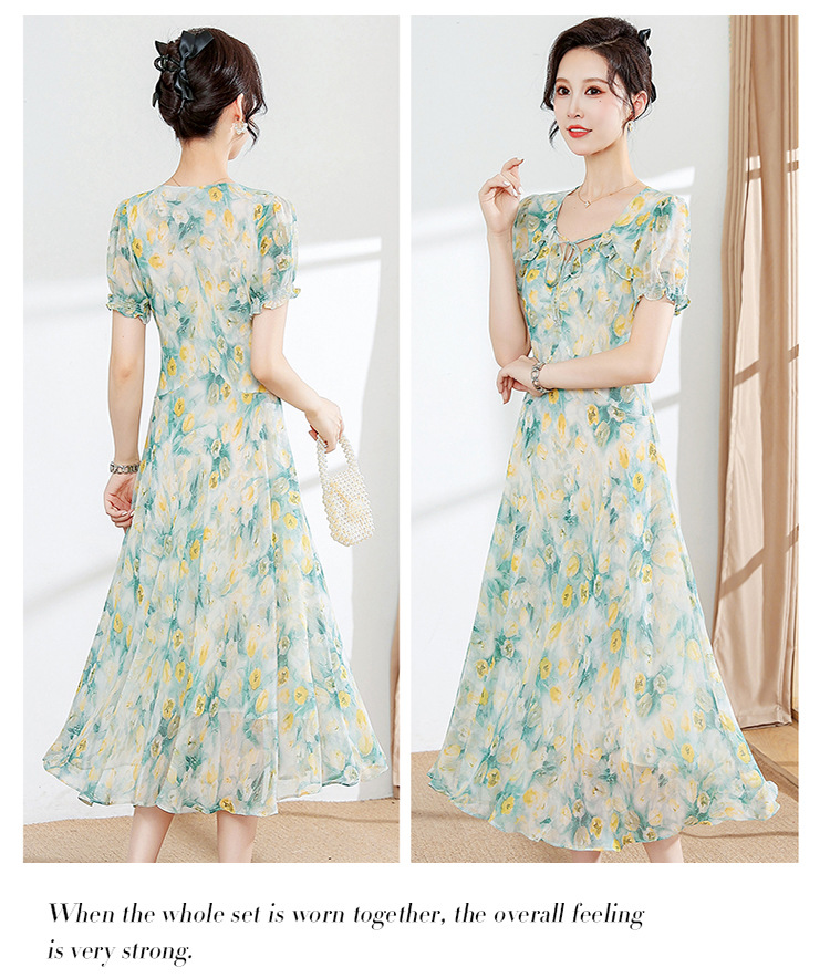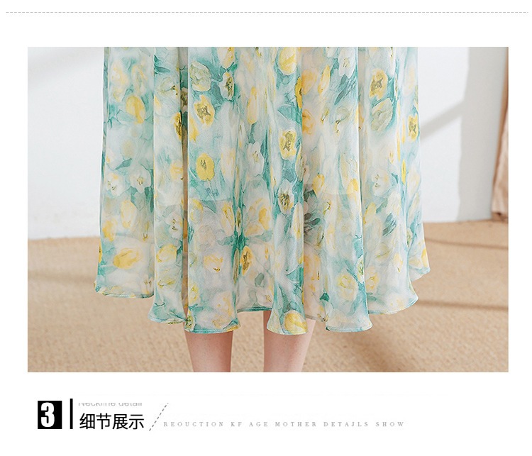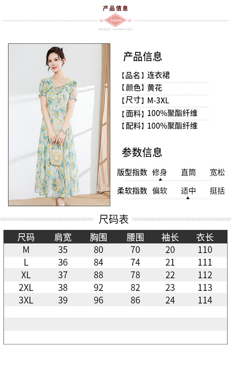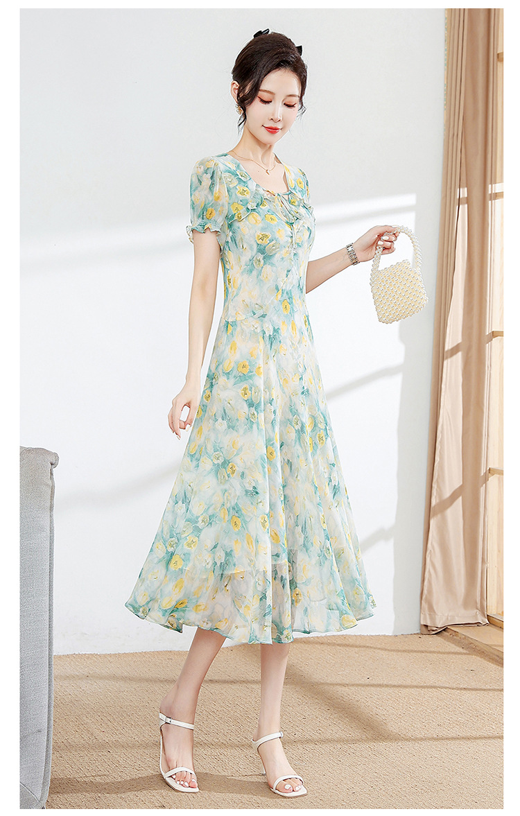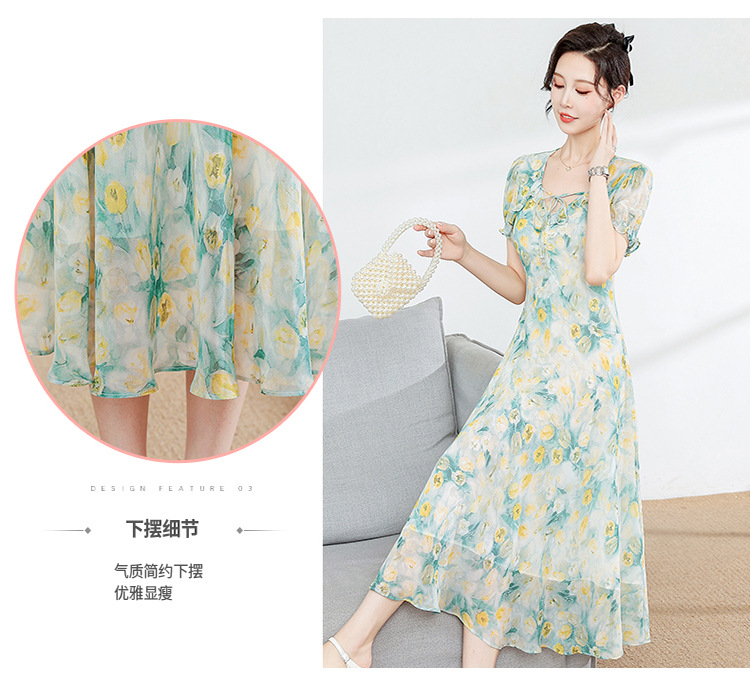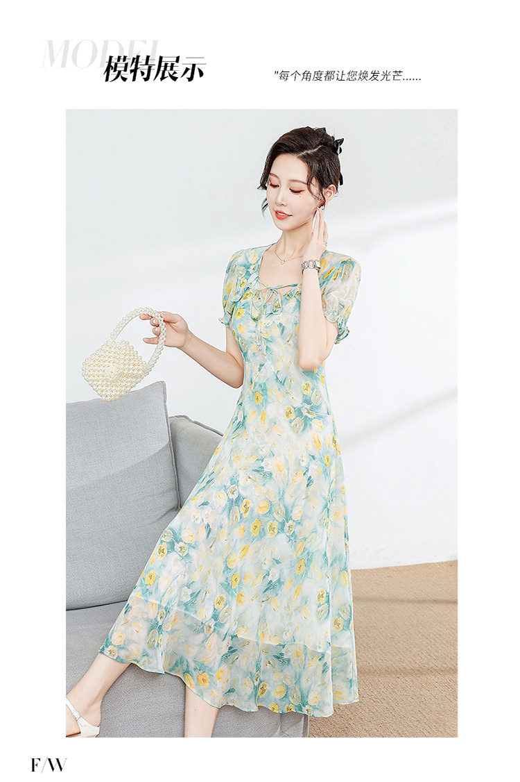夏季新款,木耳边短袖系带蝴蝶结时尚中长裙女装长裙印花连衣裙QYM-YM-A2346-Y