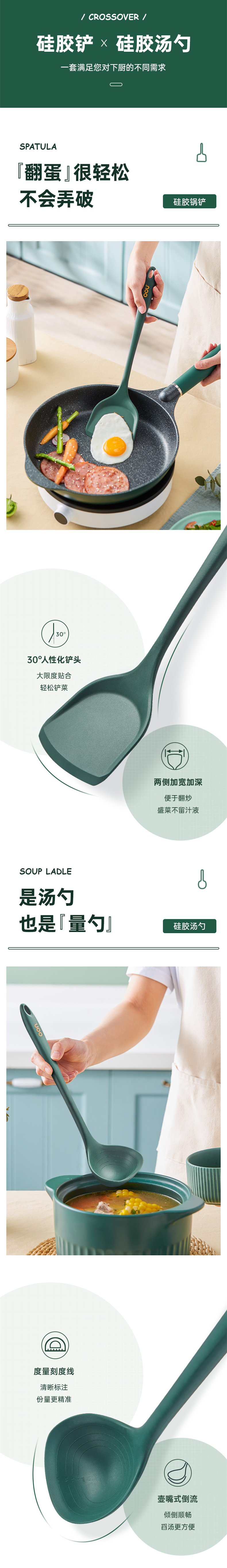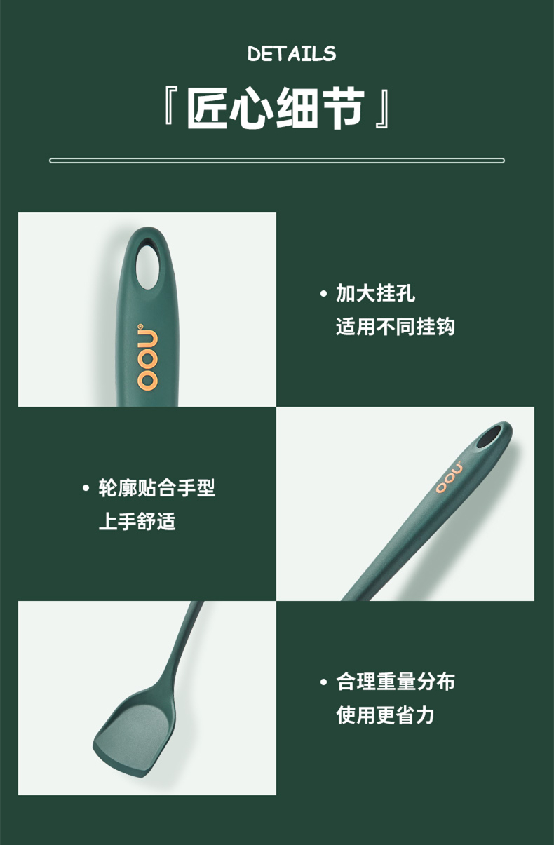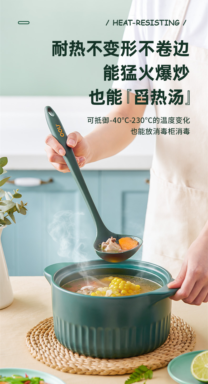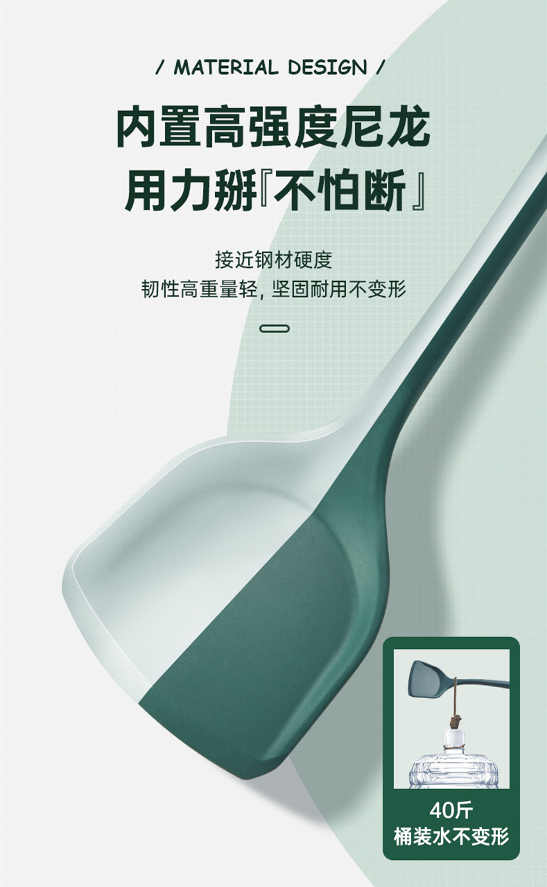 食品级硅胶、通过国家食品用安全标准检测、高强度尼龙、黄金手柄长度、30°人性化铲头、两侧加宽加深设计、可度量汤勺、壶嘴式倒流设计、加大悬挂孔