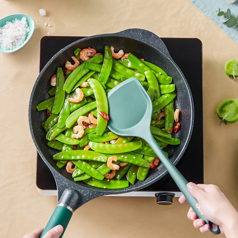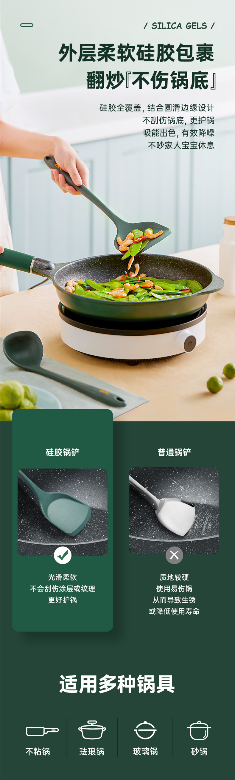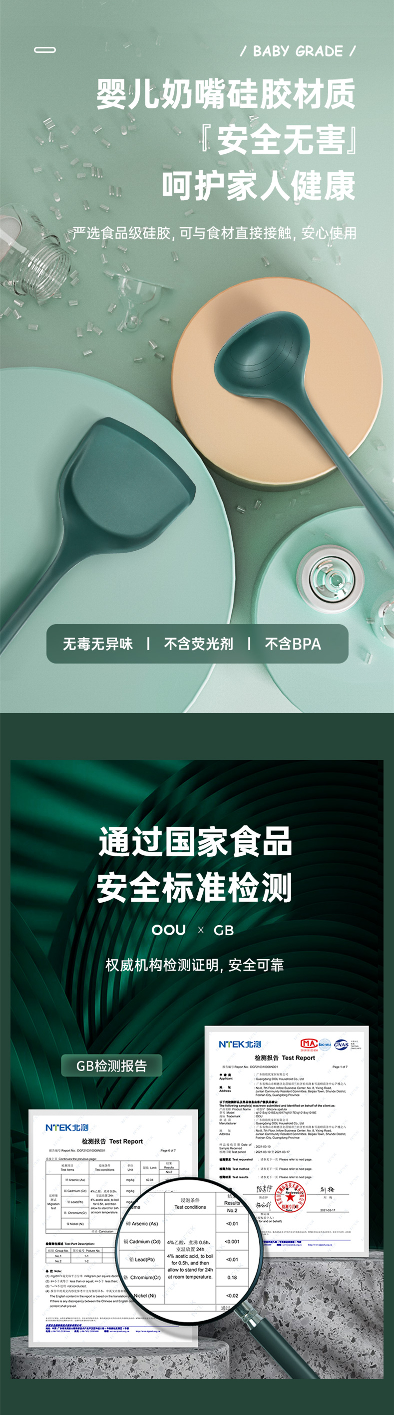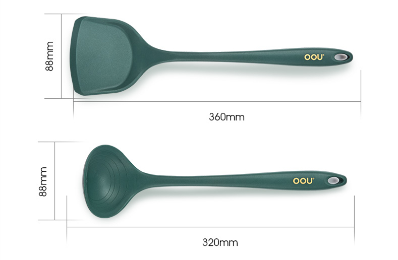 食品级硅胶、通过国家食品用安全标准检测、高强度尼龙、黄金手柄长度、30°人性化铲头、两侧加宽加深设计、可度量汤勺、壶嘴式倒流设计、加大悬挂孔
