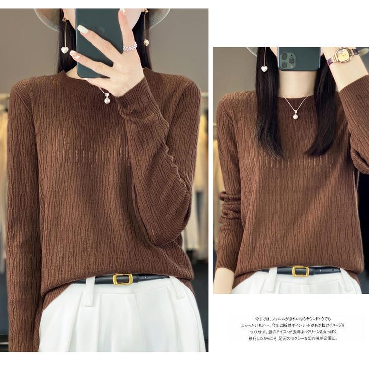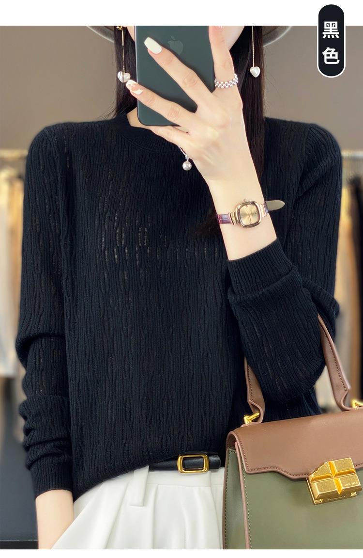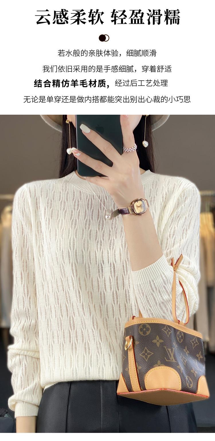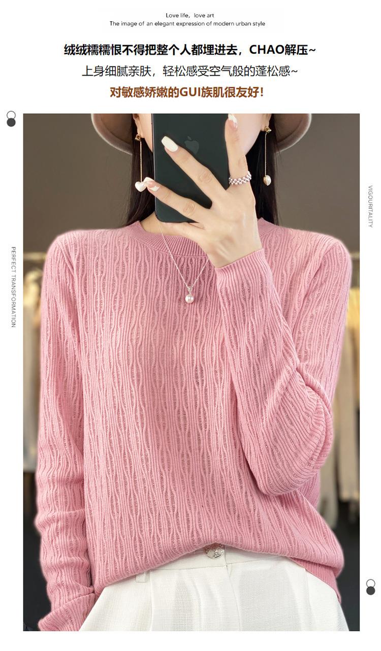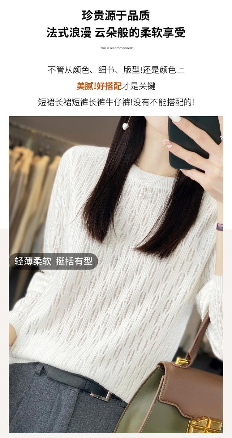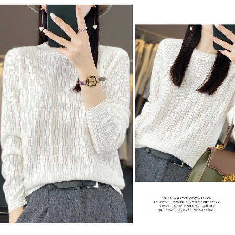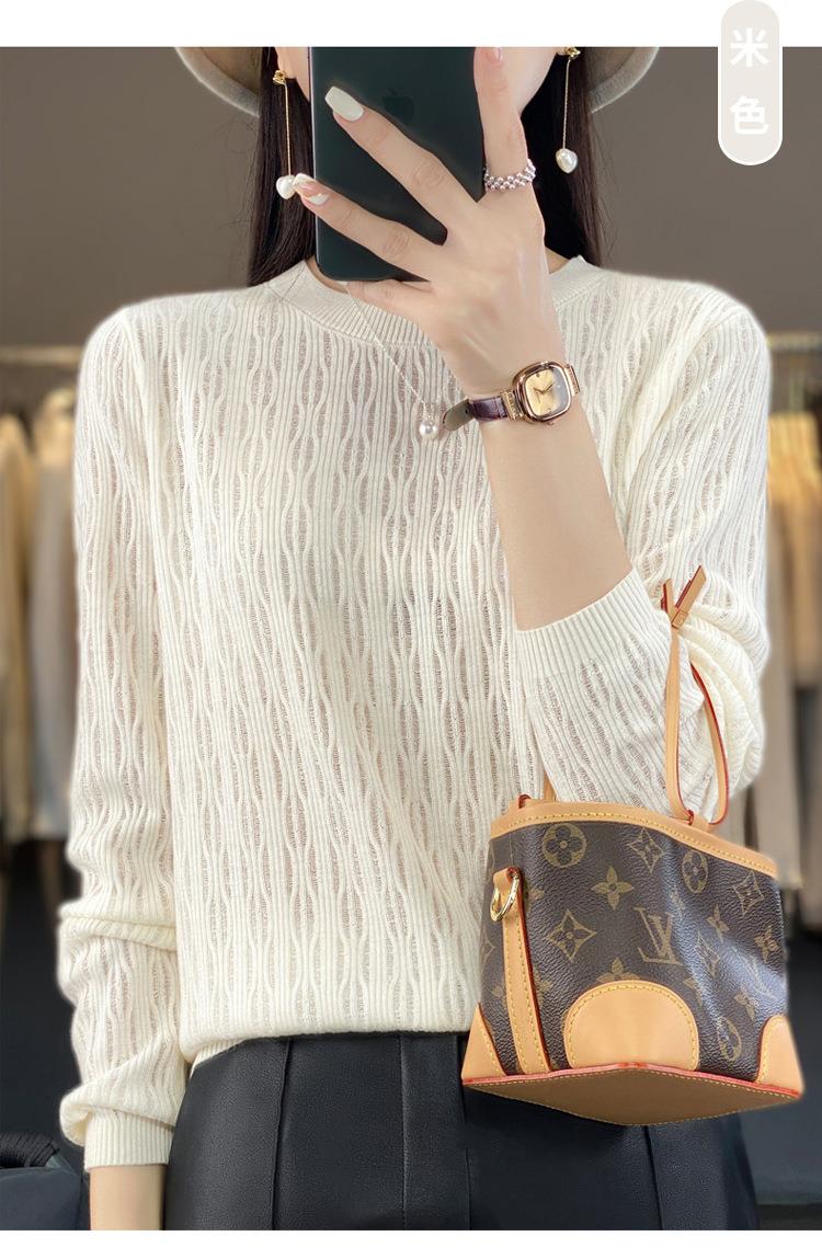 2023春秋跨境女式针织衫韩版圆领镂空精纺羊毛打底衫宽松毛衣