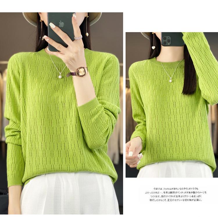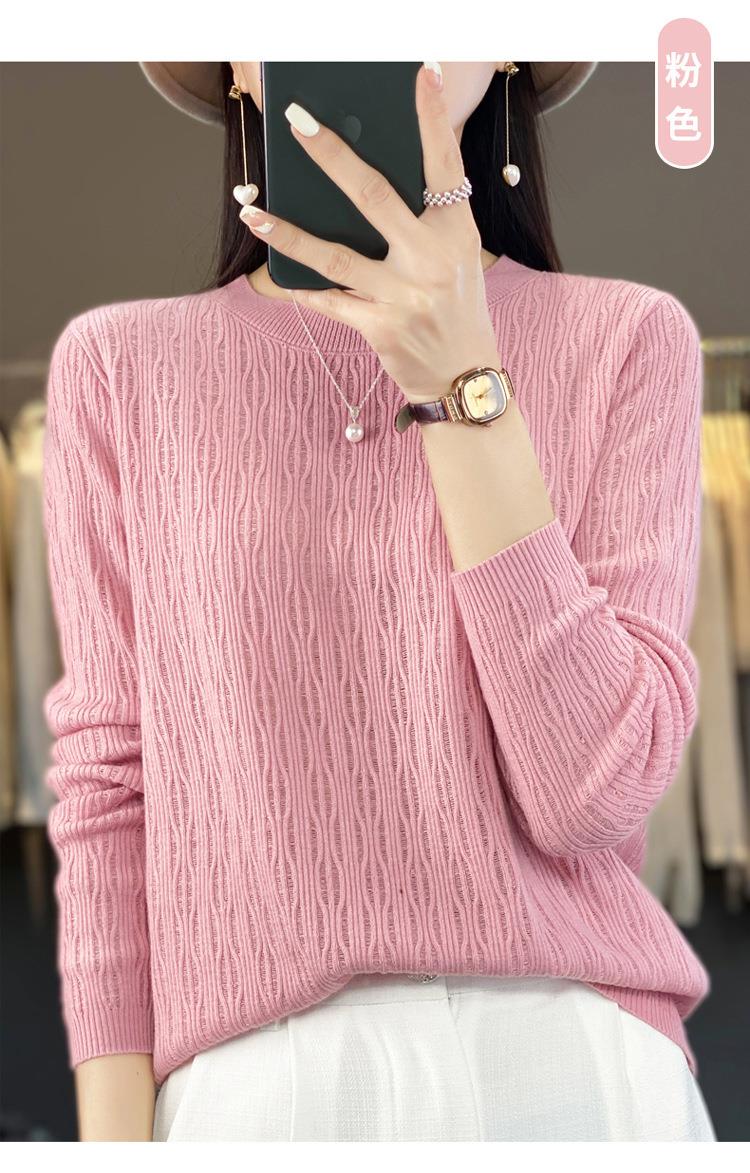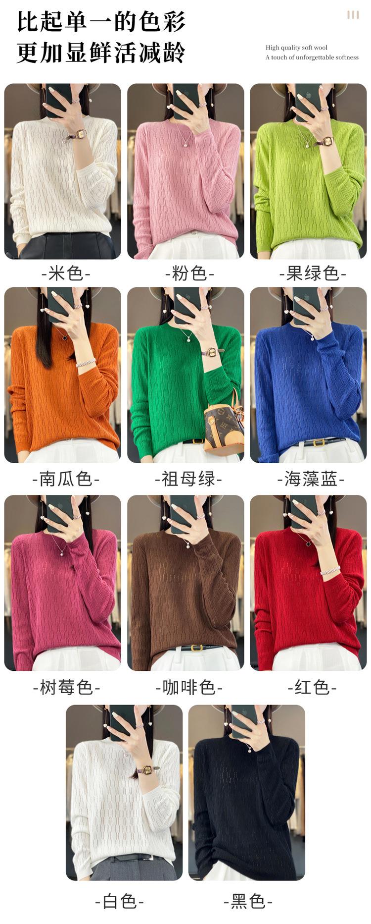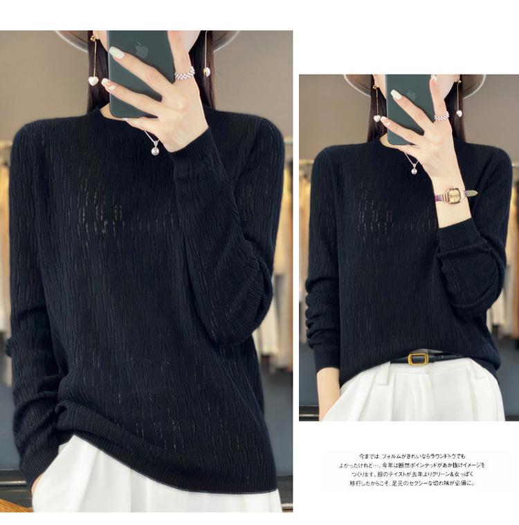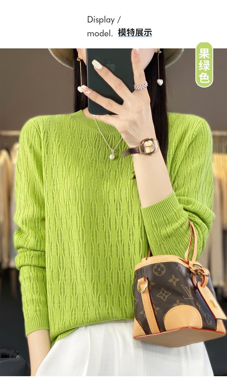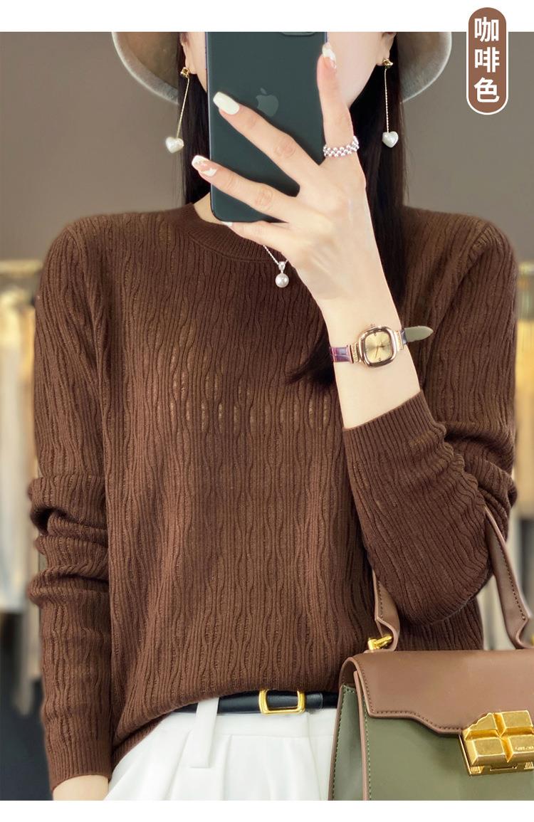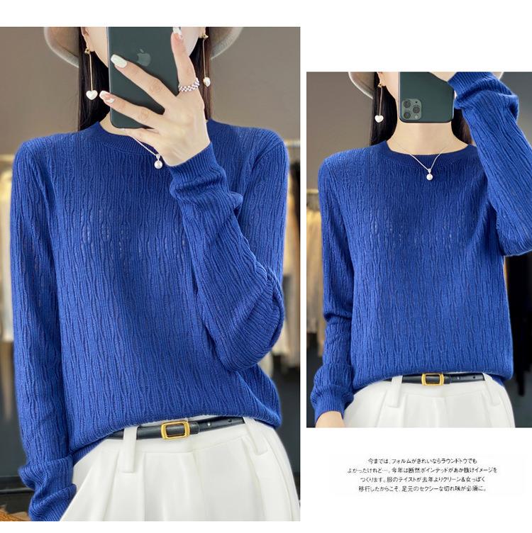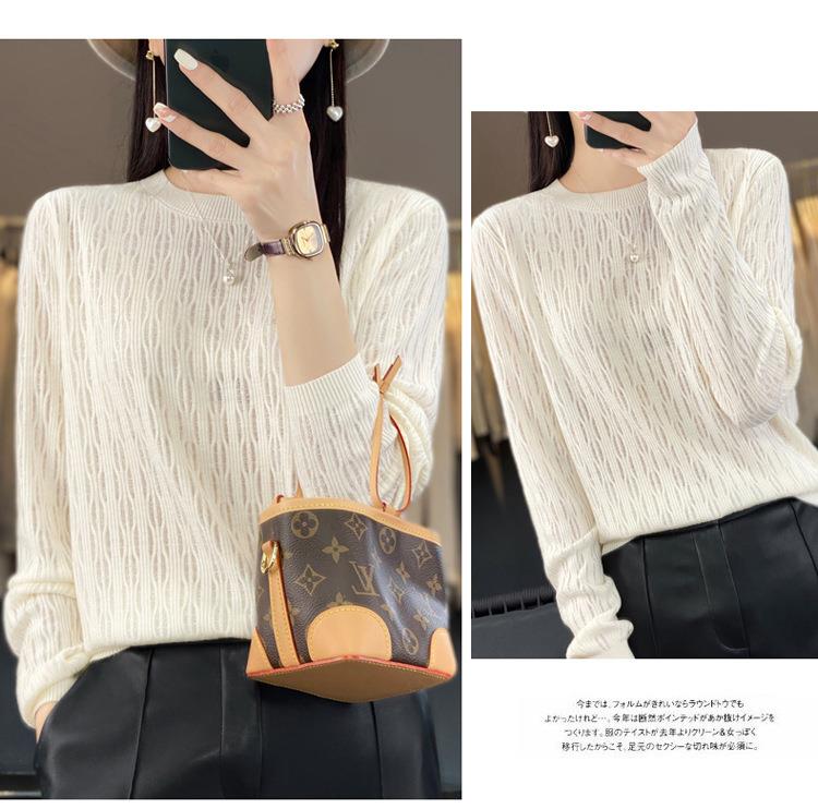 2023春秋跨境女式针织衫韩版圆领镂空精纺羊毛打底衫宽松毛衣