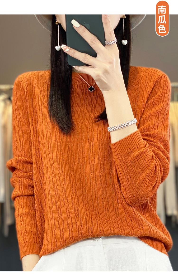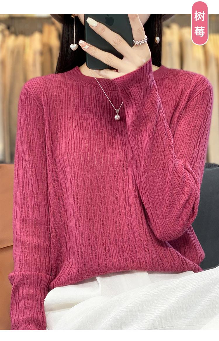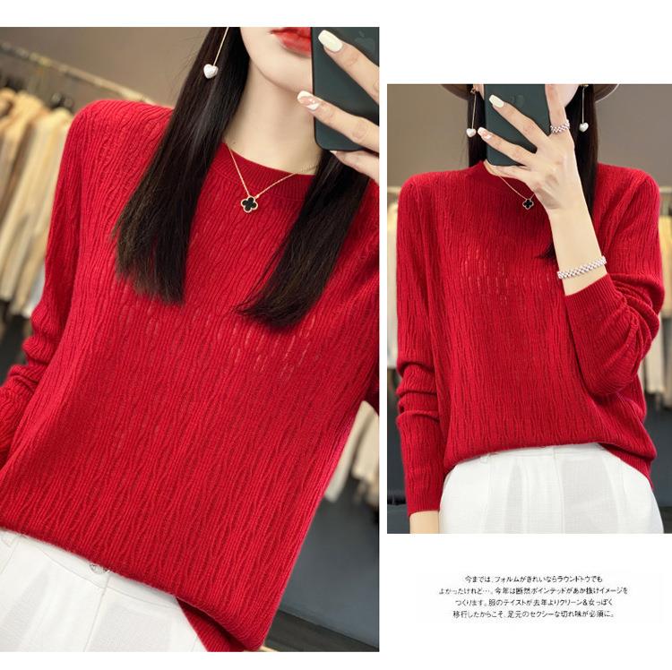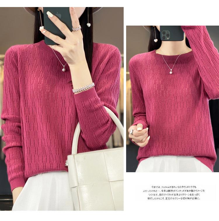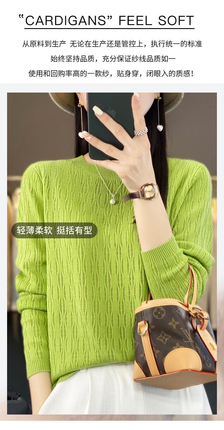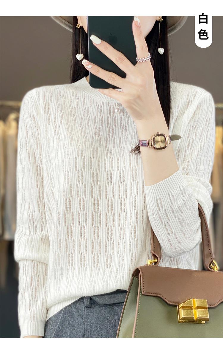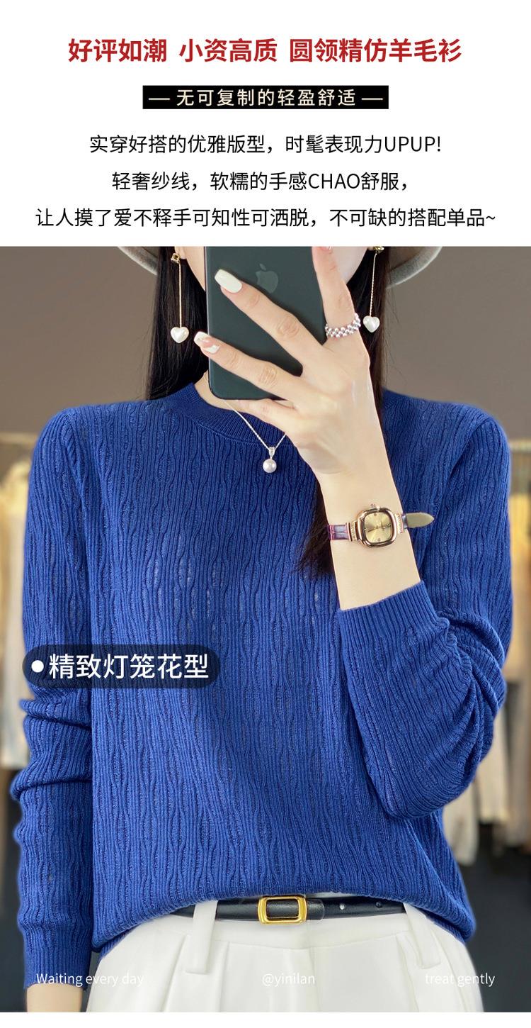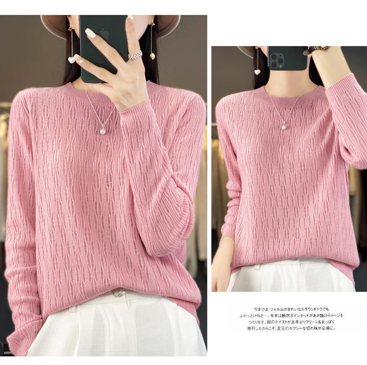 2023春秋跨境女式针织衫韩版圆领镂空精纺羊毛打底衫宽松毛衣