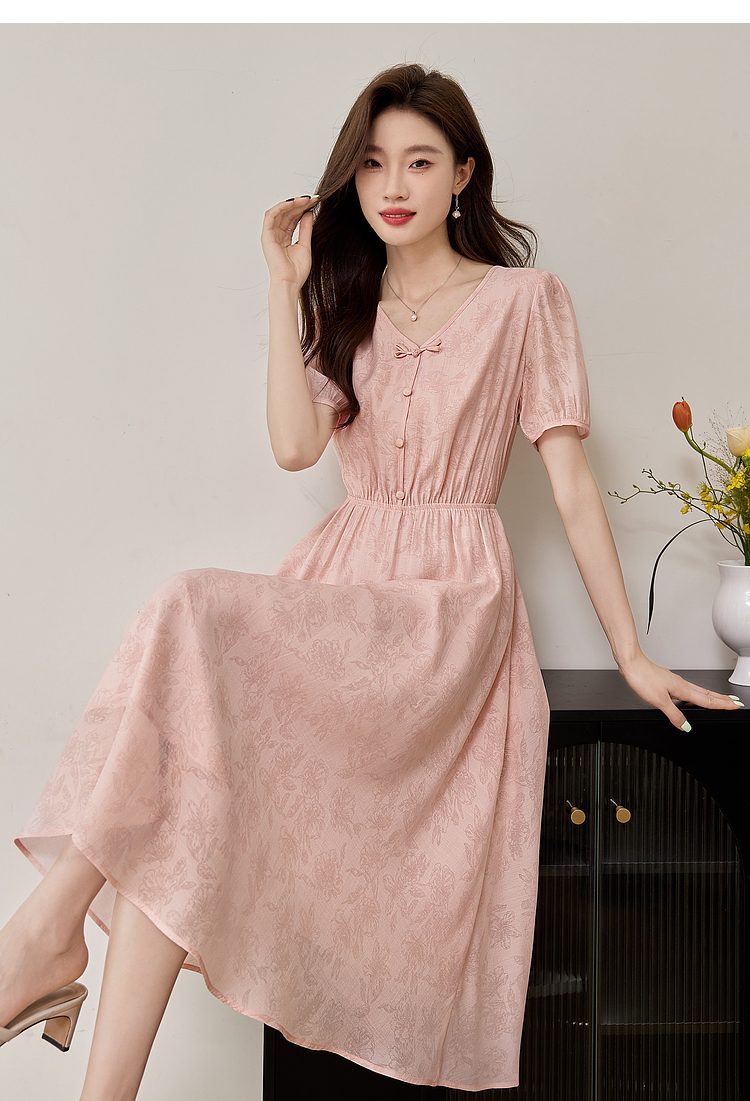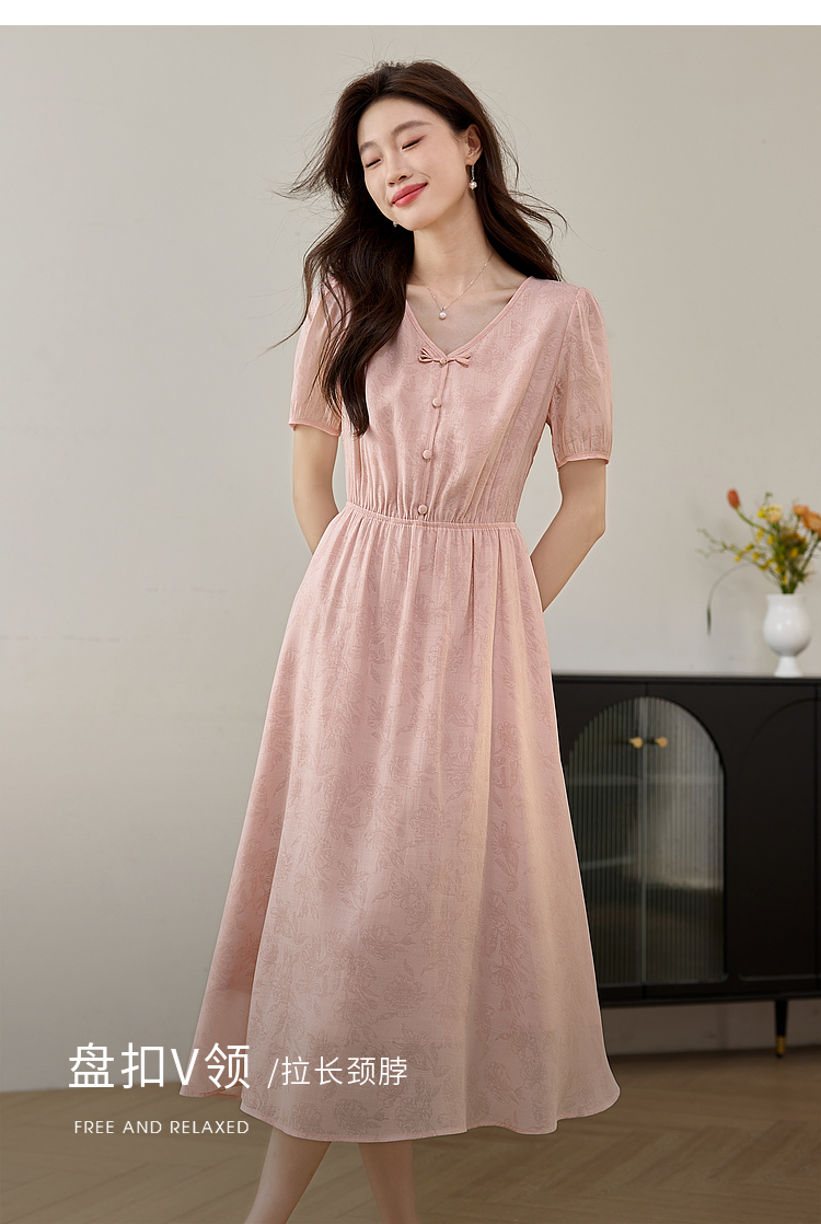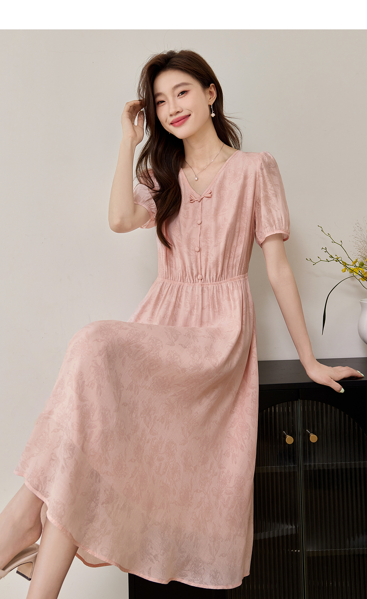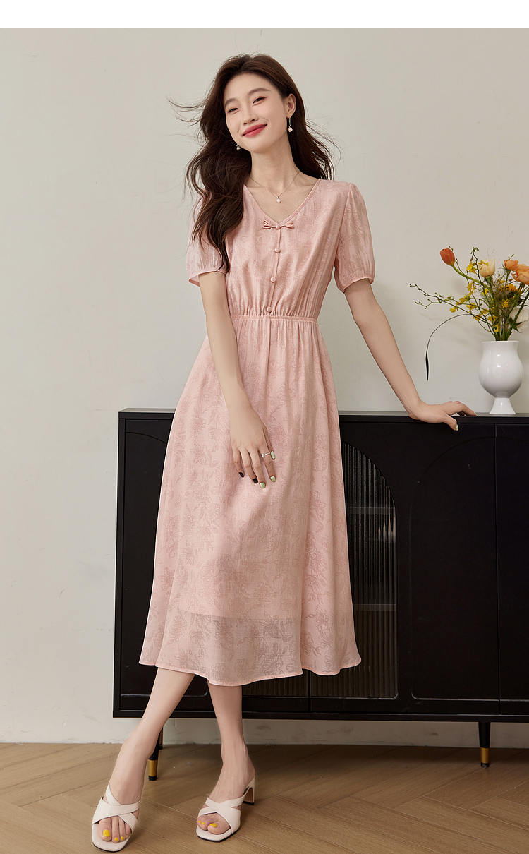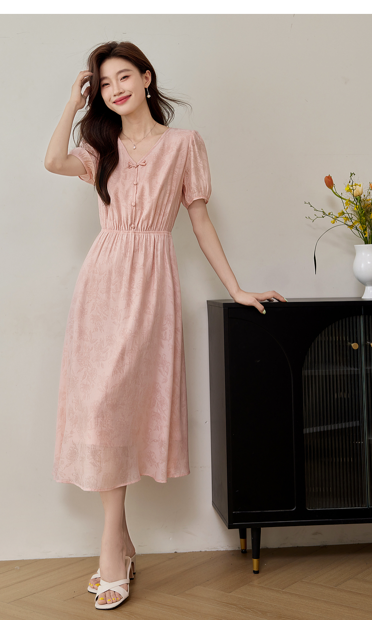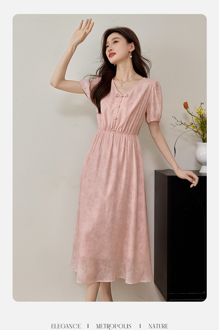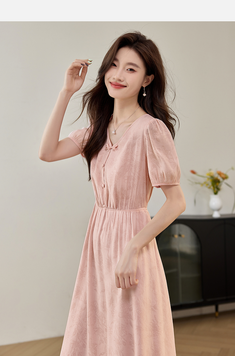 【专属特价】熙世界新中式暗纹提花连衣裙2025年夏季泡泡袖国风盘扣V领裙子