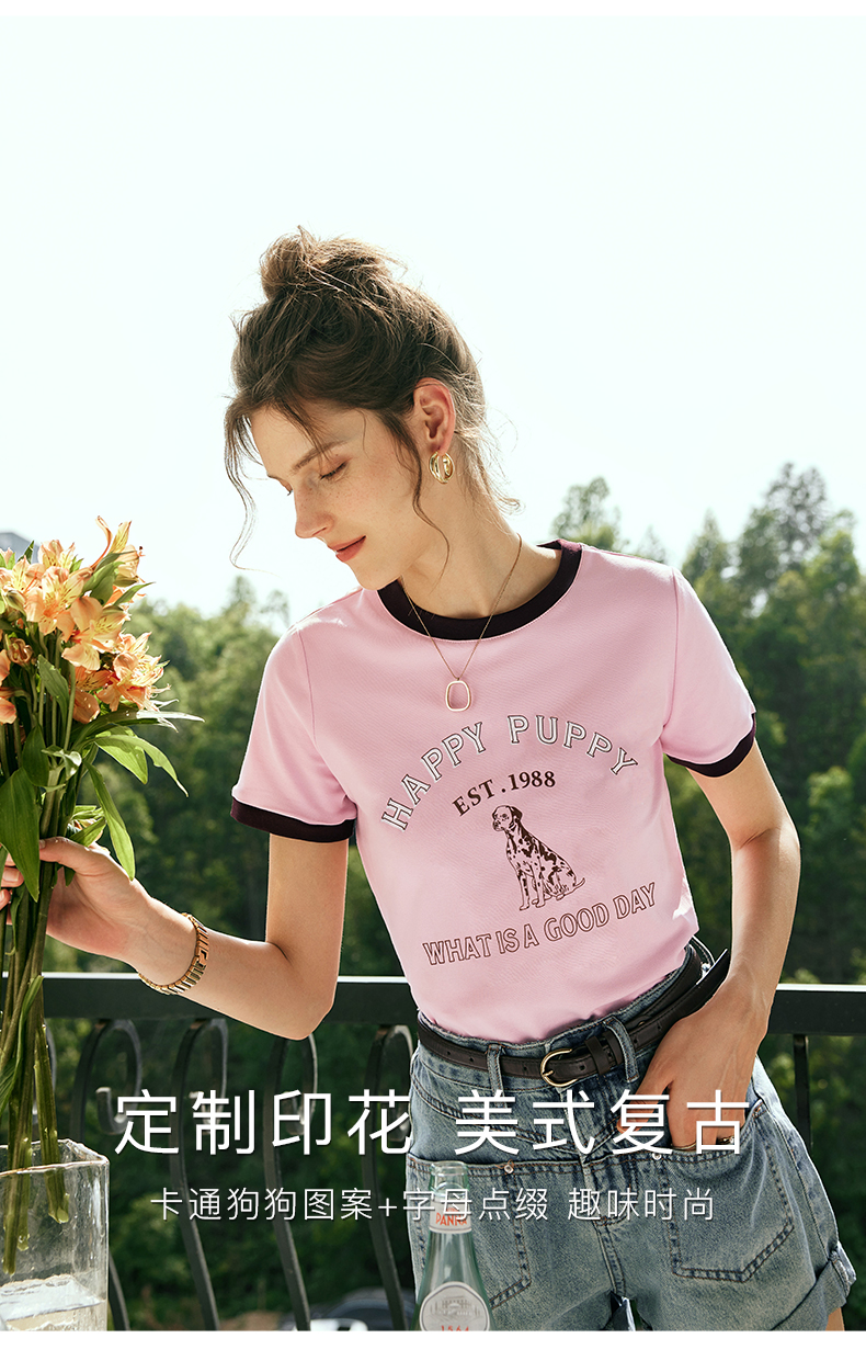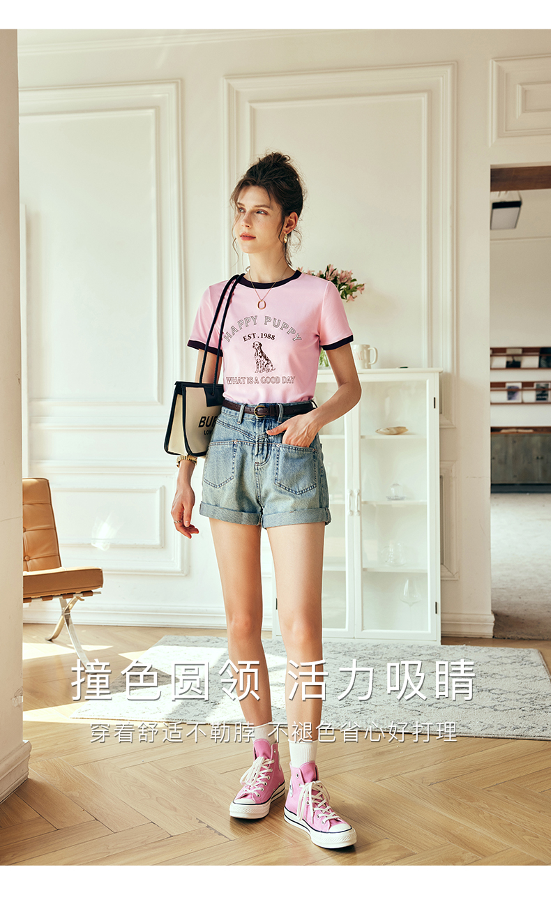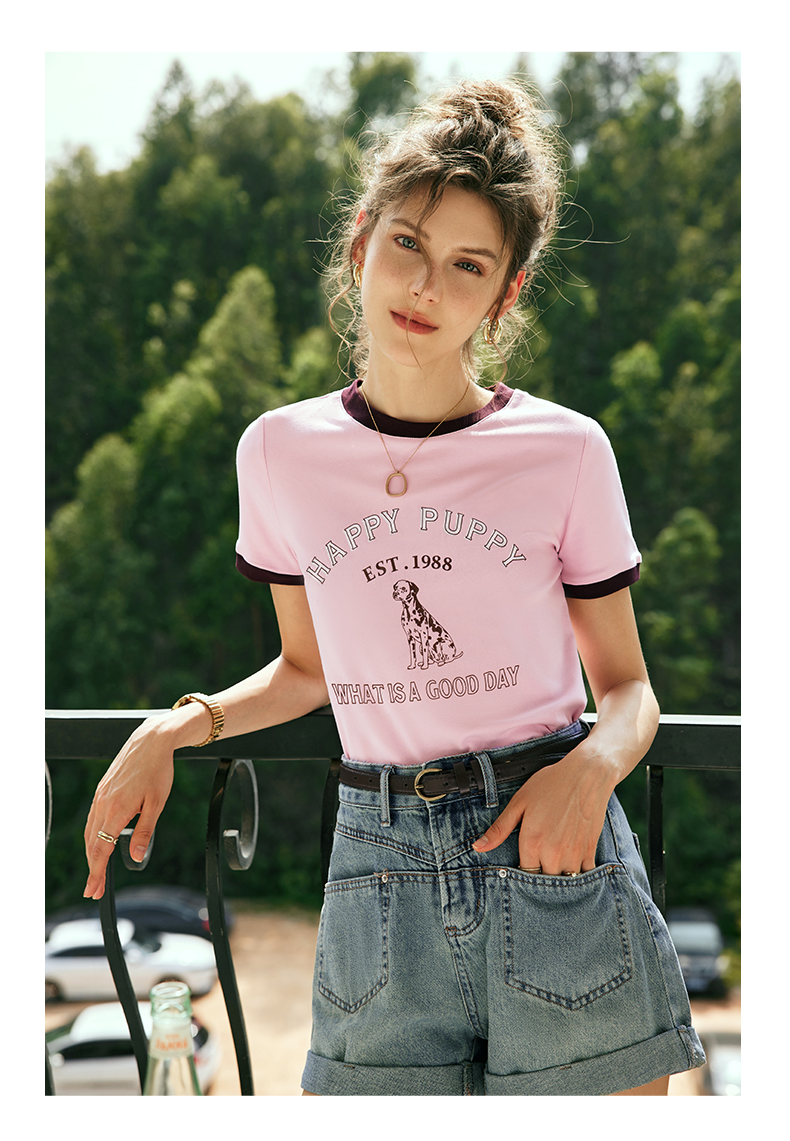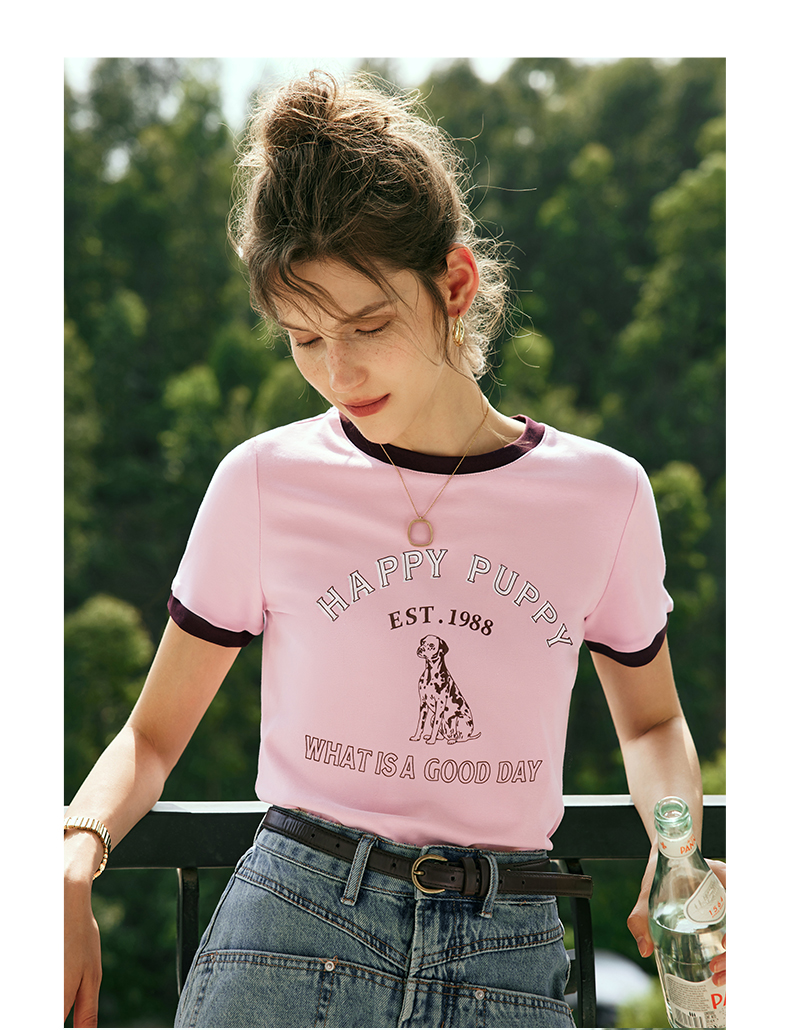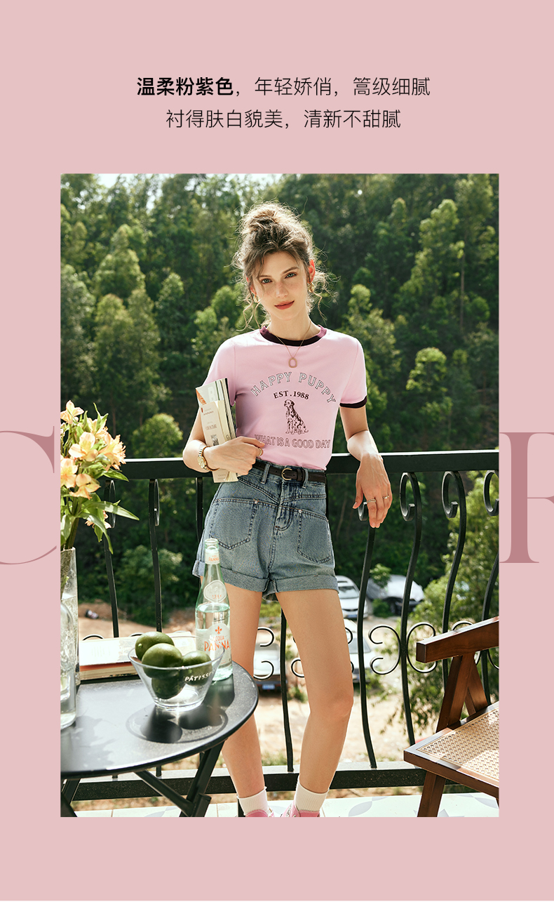 OLrain欧芮儿法式粉紫色短袖T恤女夏季2023新款修身撞色印花上衣