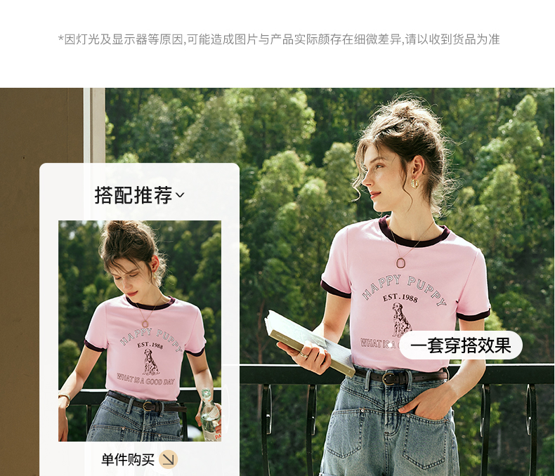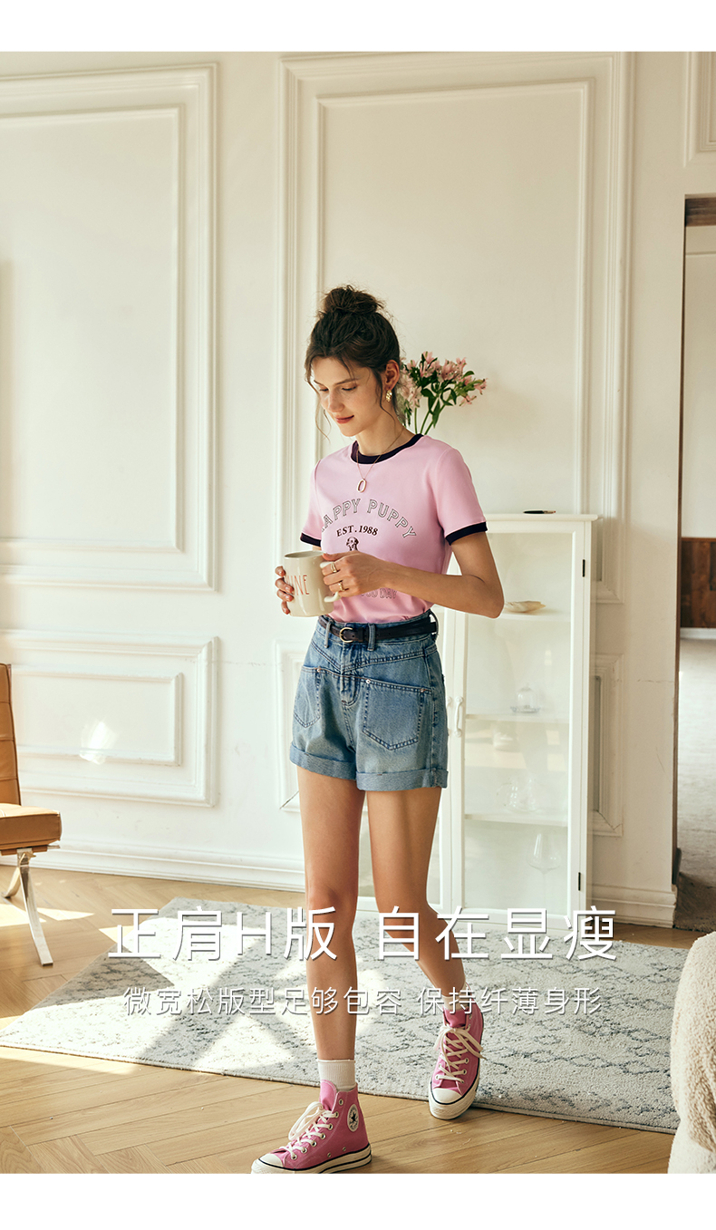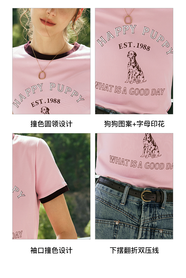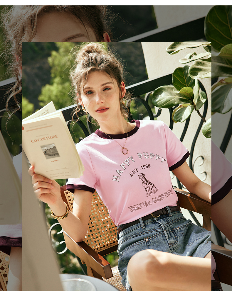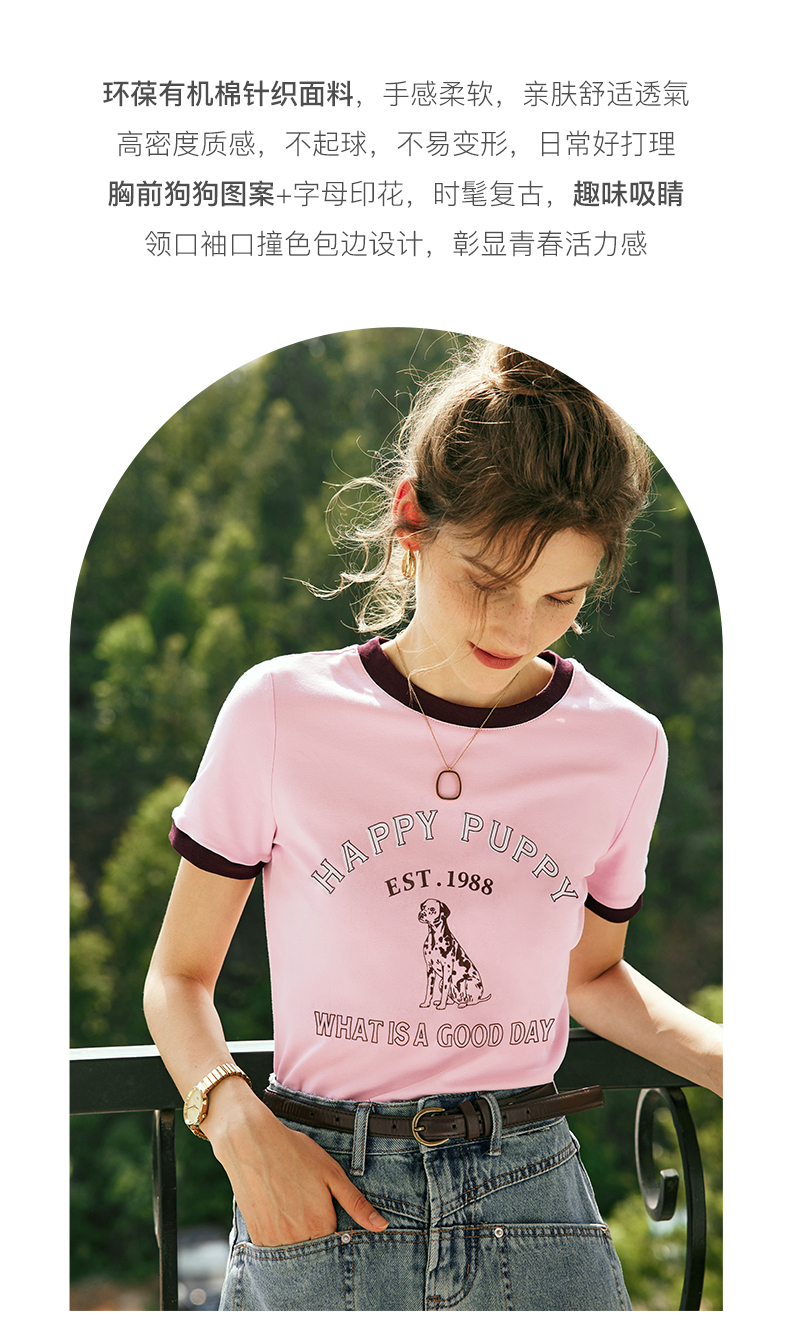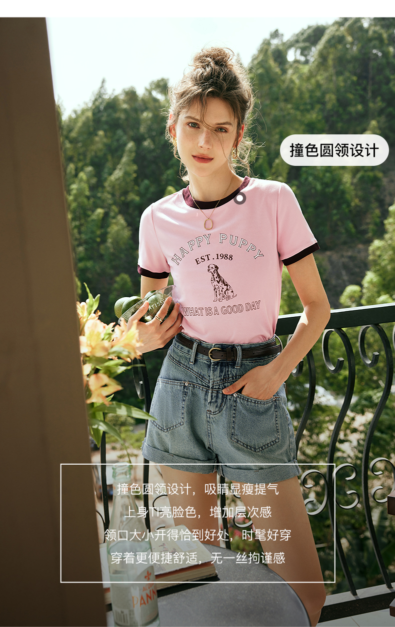 OLrain欧芮儿法式粉紫色短袖T恤女夏季2023新款修身撞色印花上衣