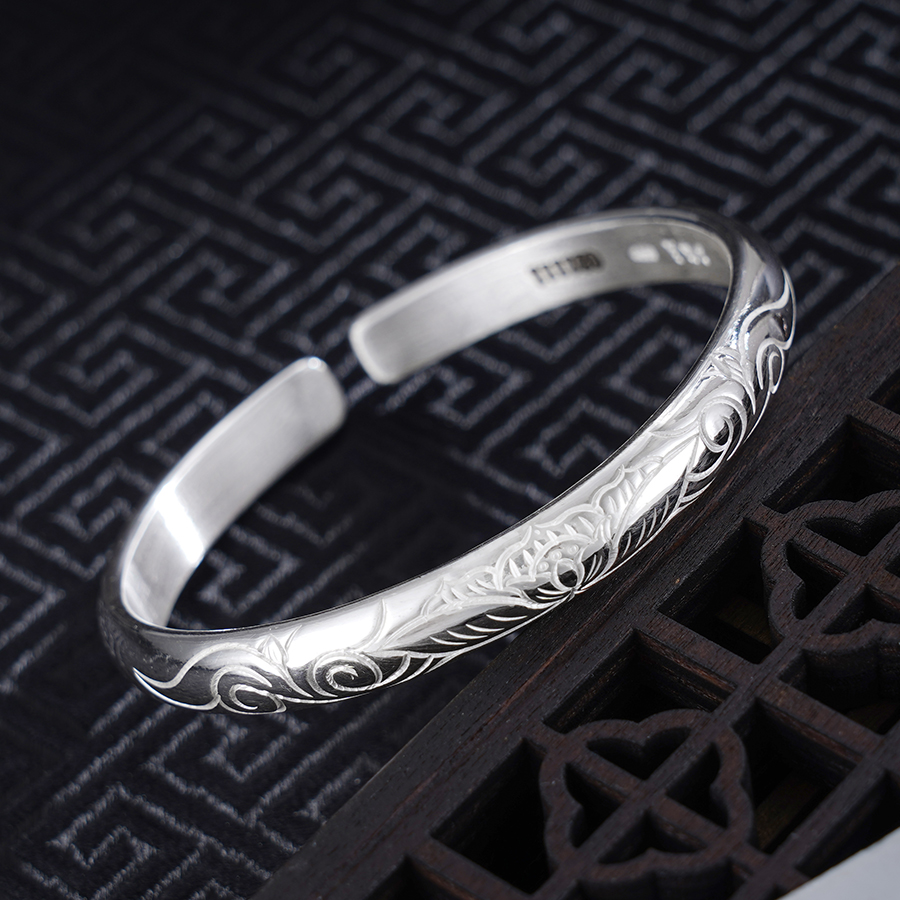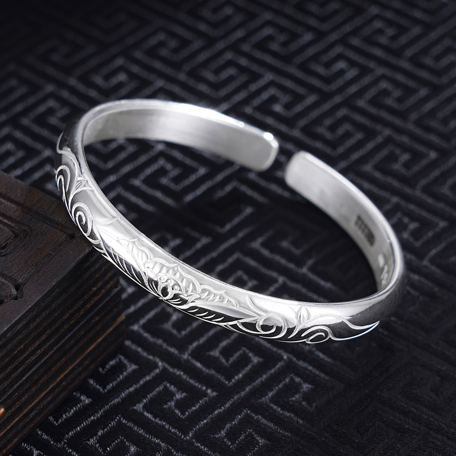 【寓意】:纯银开口手镯,镯面錾刻莲花图案。经抛光处理,表面泛起温润光泽,似月光轻覆。寓意清雅相伴,静享美好流年。