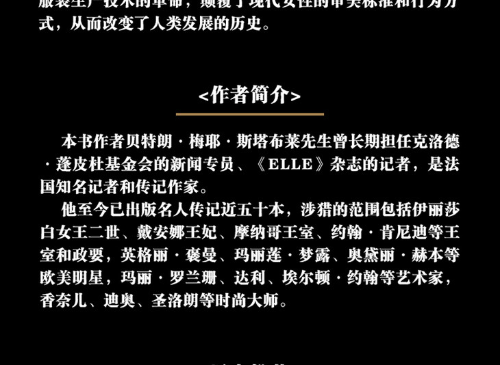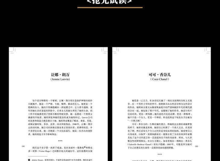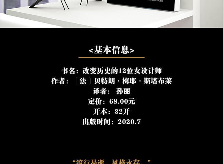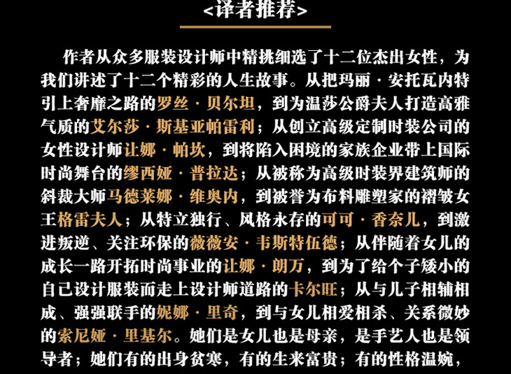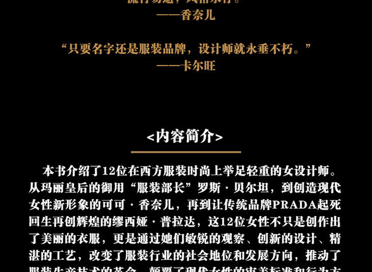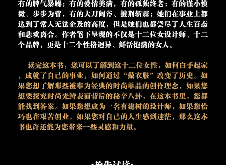 读完这本书,您可以了解到这十二位女性,如何白手起家,成就了自己的事业,如何通过“做衣服”改变了历史。如果您想了解那些被奉为经典的时尚单品的创作理念,如果您想要探究时尚光鲜表面背后的秘辛八卦,在这本书里,您都能找到答案。如果您想成为一名有建树的设计师,如果您恰巧也在艰苦创业,如果您对自己的人生感到迷茫,那么这本书也许还能为您带来一些灵感和力量。