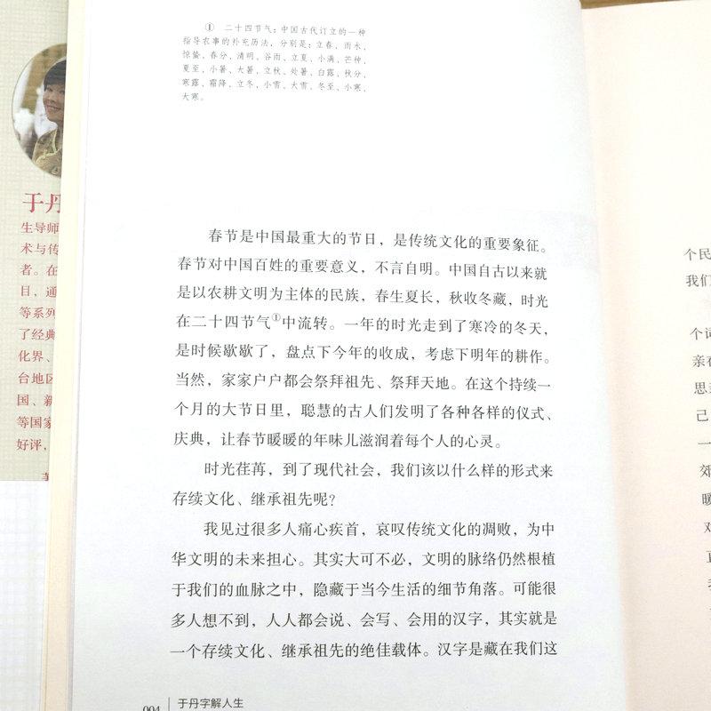 于丹,著名文化学者,北京师范大学教授、博士生导师、文化创新与文化传播工程研究院院长,艺术与传媒学院副院长。她是古典文化的普及传播者。在中央电视台《百家讲坛》《文化视点》等栏目,通过《论语心得》《庄子心得》《论语感悟》等系列讲座普及、传播传统文化,以生命感悟激活了经典中的属于中华民族的精神基因,在海内外文化界、教育界产生广泛影响。先后在我国内地、港台地区,及美国、英国、法国、德国、日本、韩国、新加坡、马来西亚、巴西、新西兰、澳大利亚等国家地区进行千余场传统文化讲座,得到广泛的好评,并掀起了海内外民众学习经典的热潮。