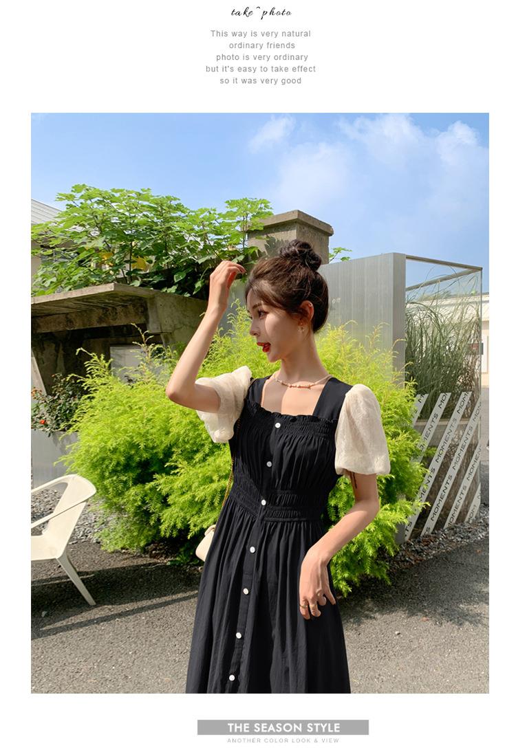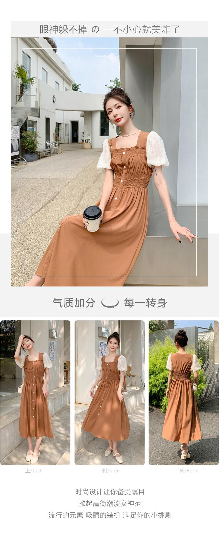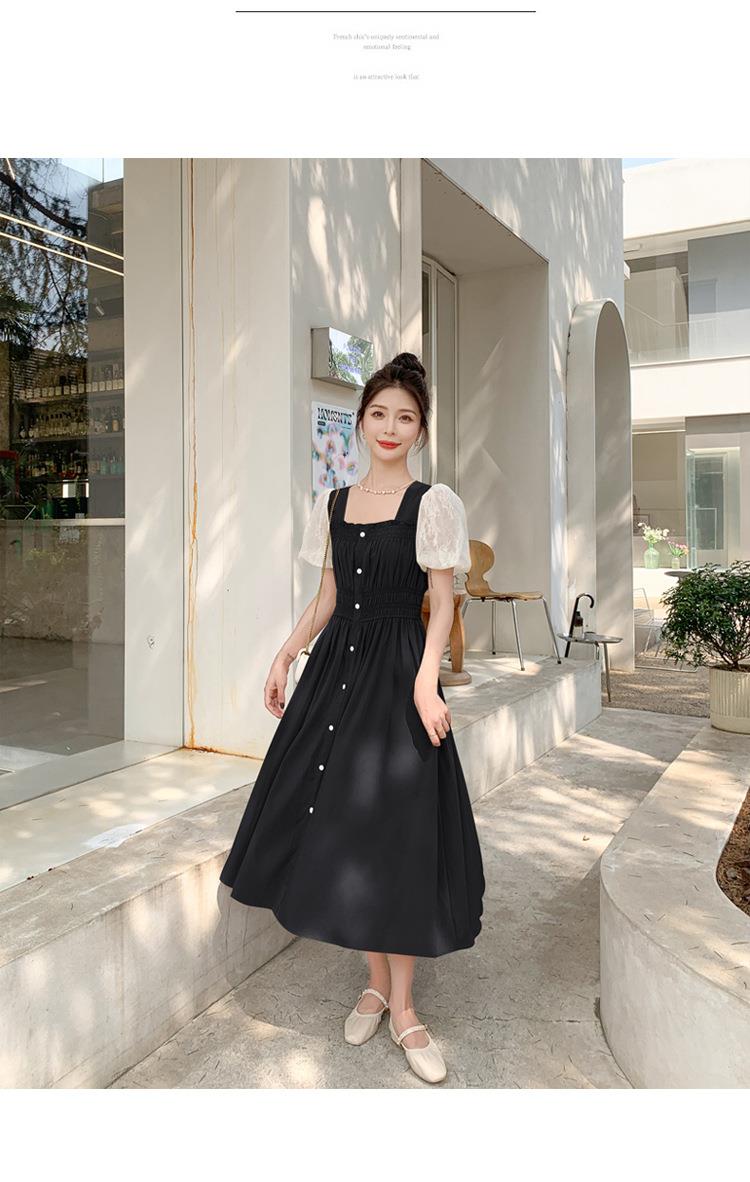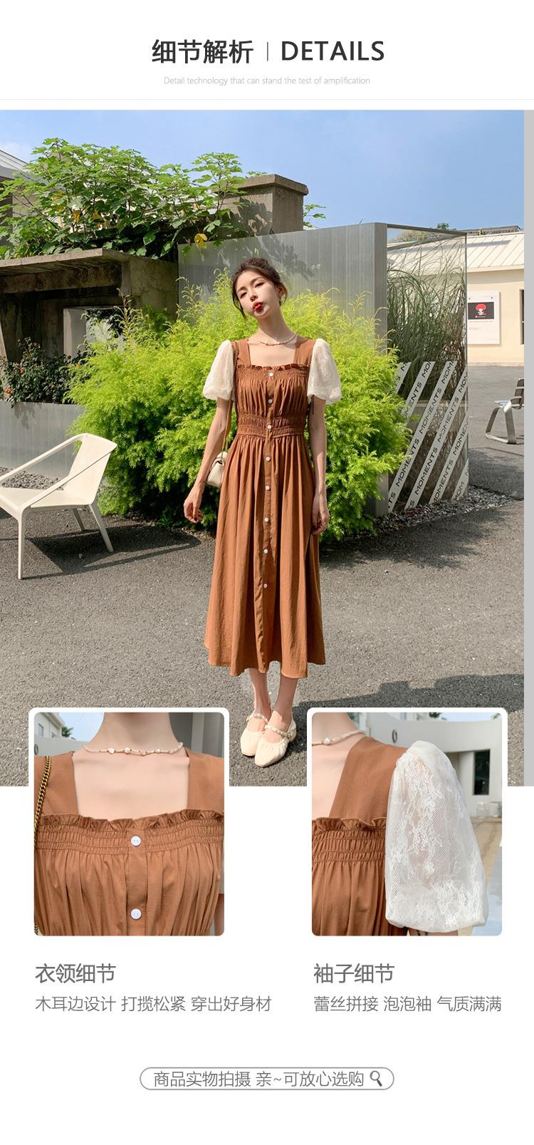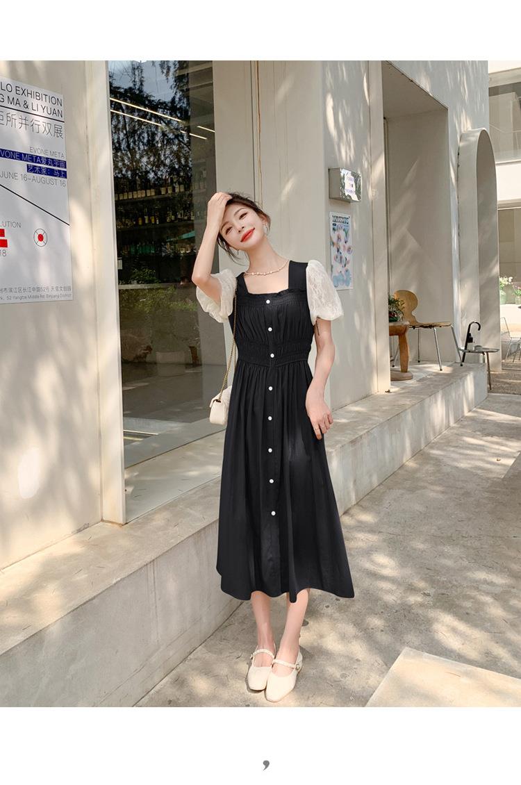 法式复古方领裙子2023夏季新款蕾丝泡泡袖松紧腰显瘦连衣裙女通勤