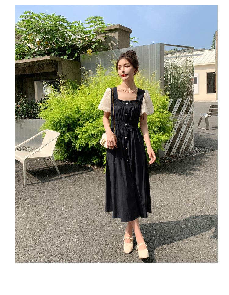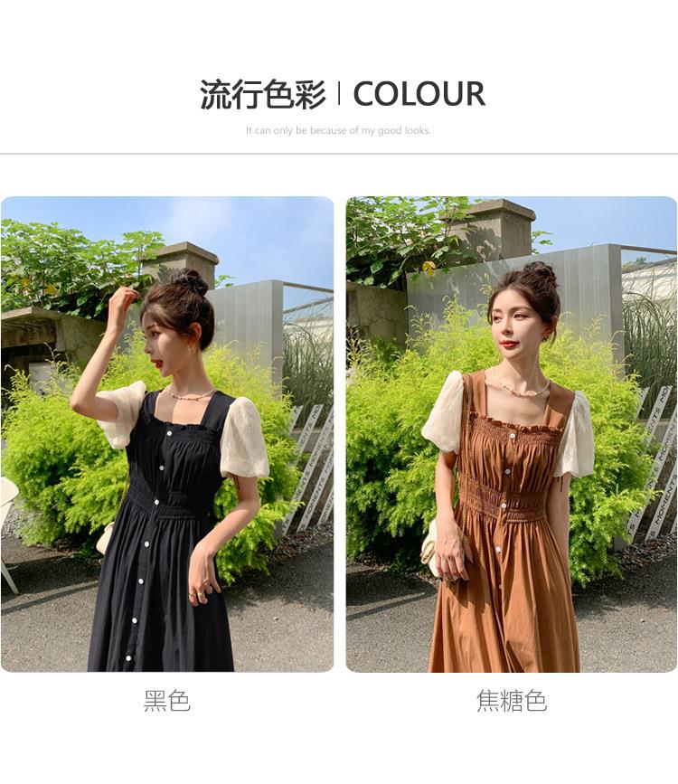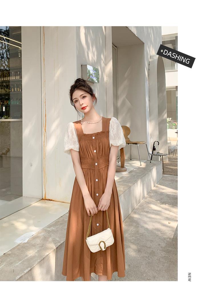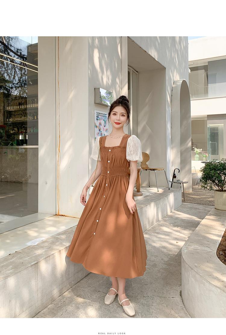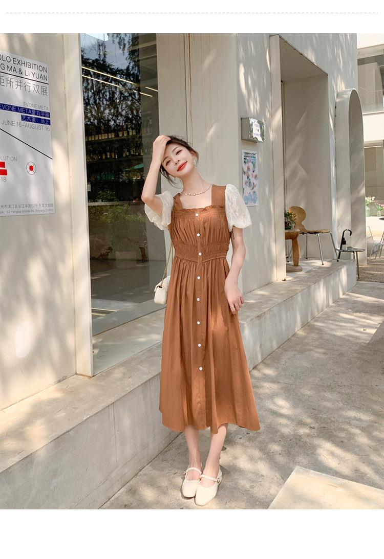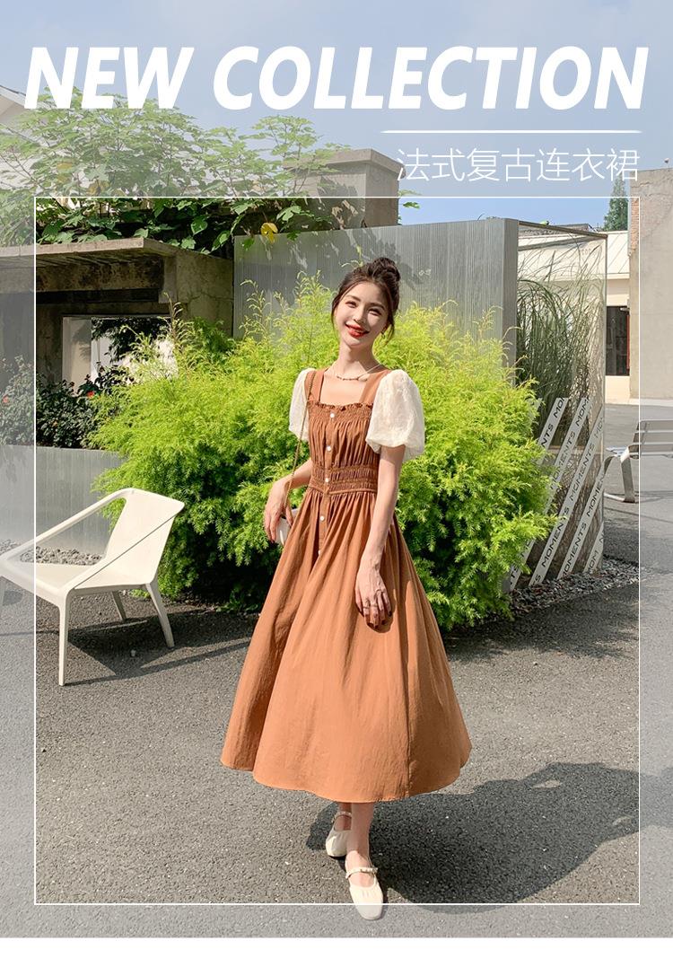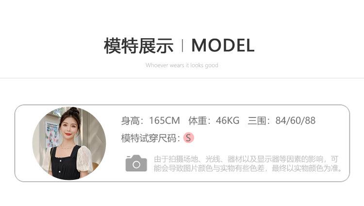 法式复古方领裙子2023夏季新款蕾丝泡泡袖松紧腰显瘦连衣裙女通勤