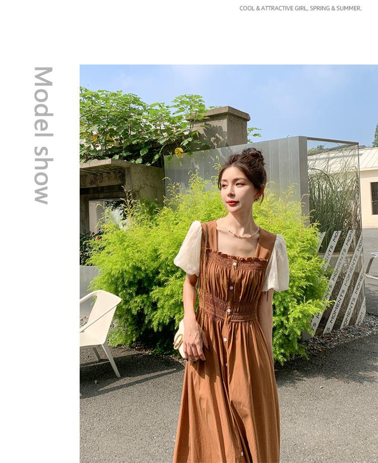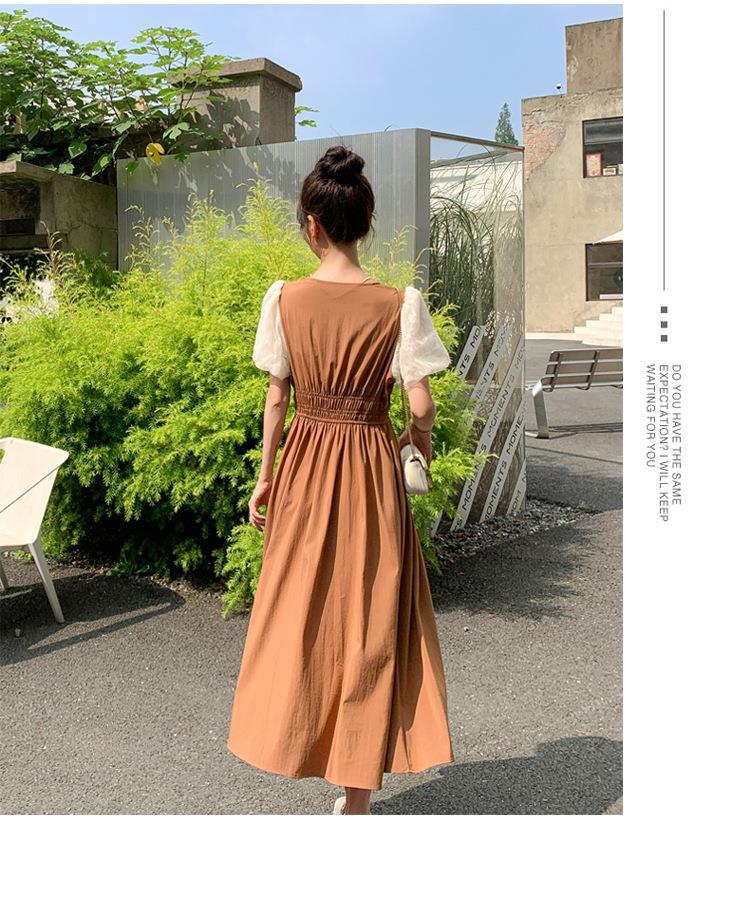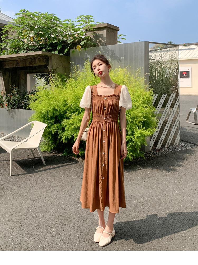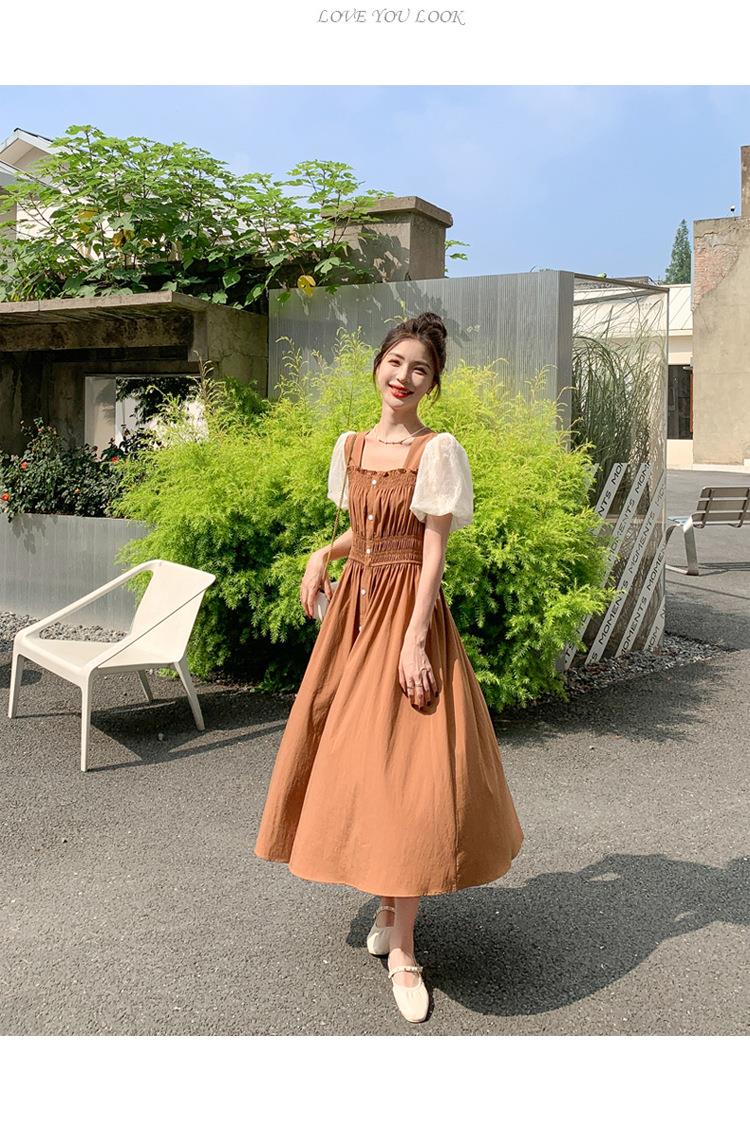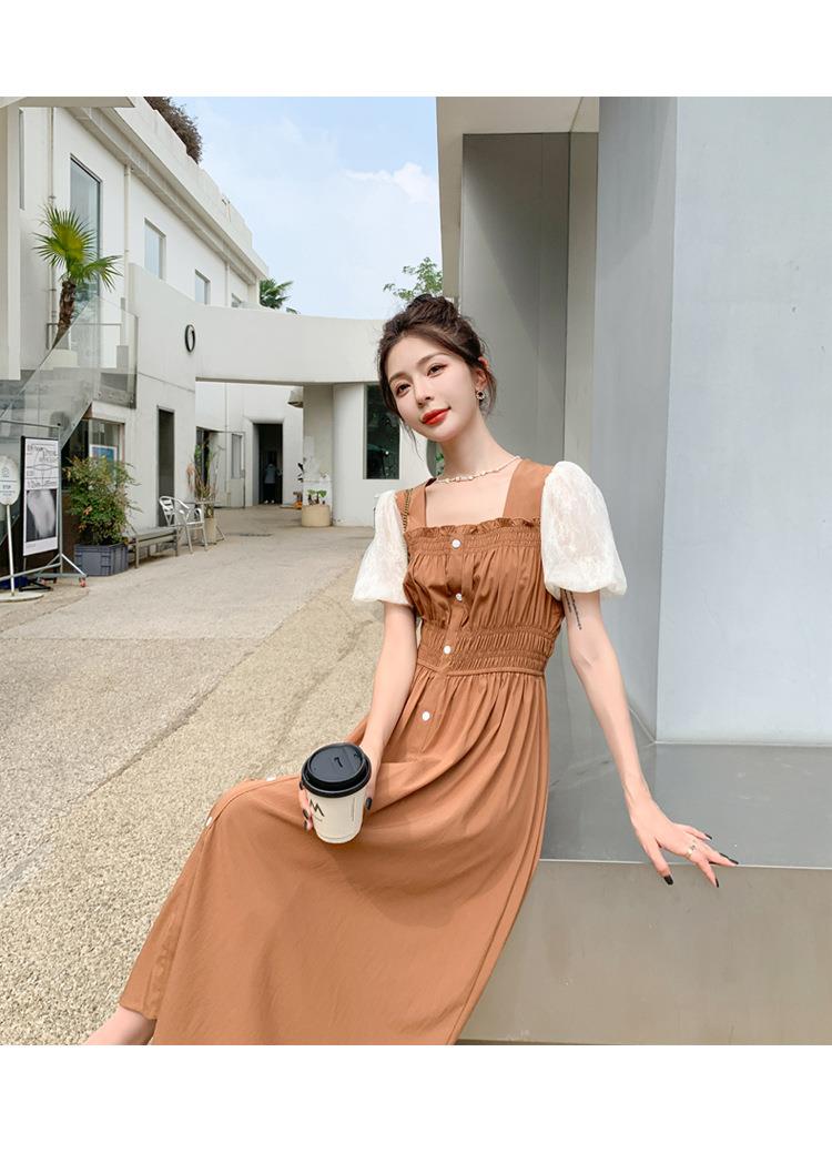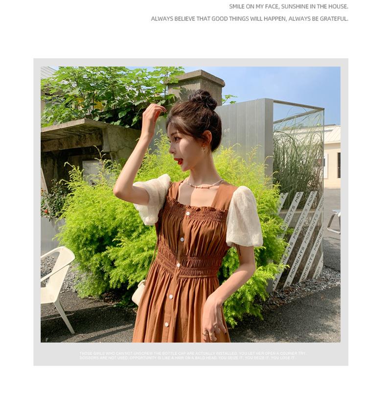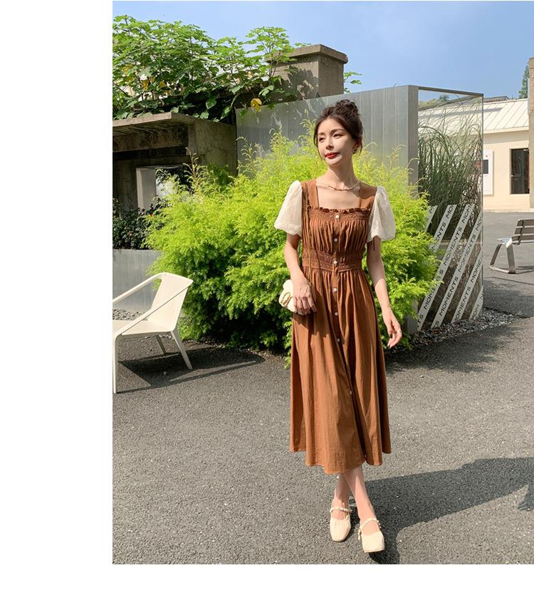 法式复古方领裙子2023夏季新款蕾丝泡泡袖松紧腰显瘦连衣裙女通勤