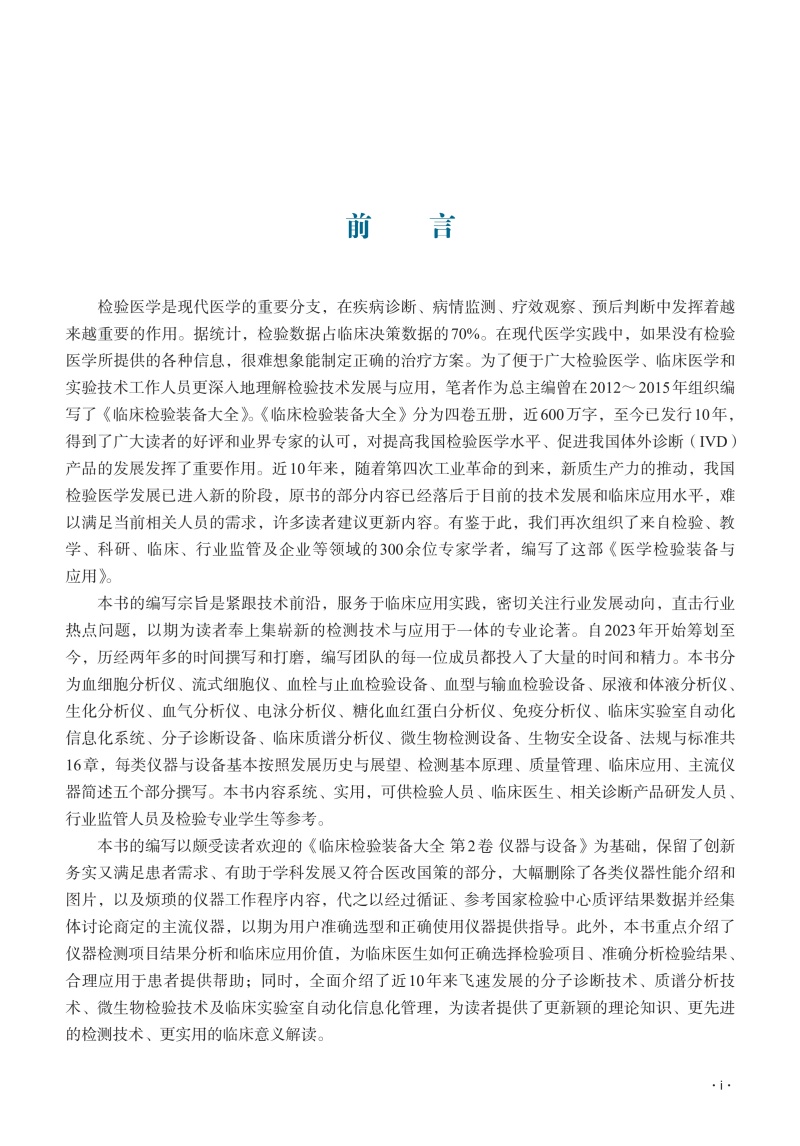本书是一部集临床检验装备检测技术与应用于一体的专业论著,分为血细胞分析仪、流式细胞仪、血栓与止血检验设备、血型与输血检验设备、尿液和体液分析仪、生化分析仪、血气分析仪、电泳分析仪、糖化血红蛋白分析仪、免疫分析仪、临床实验室自动化信息化系统、分子诊断设备、临床质谱分析仪、微生物检测设备、生物安全设备、法规与标准共16章,每类仪器与设备基本包括发展历史与展望、检测基本原理、质量管理、临床应用、主流仪器简述五个部分。