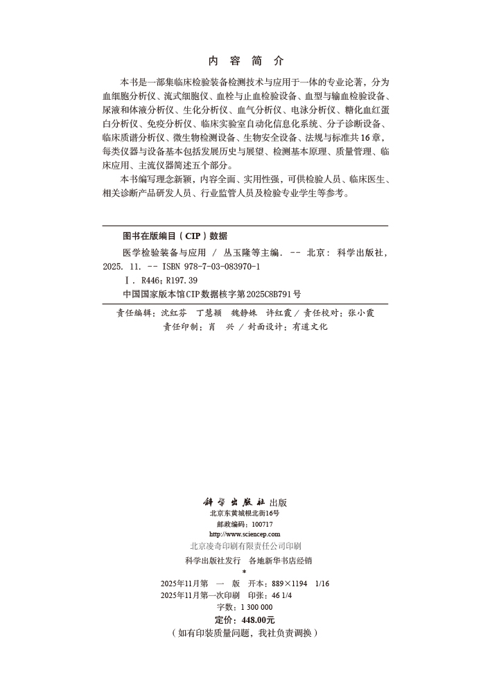 医学检验装备与应用 丛玉隆 陈锦添 罗晓亮 袁锦云 主编 一部集临床检验装备检测技术与应用于一体的专业论著 科学出版社