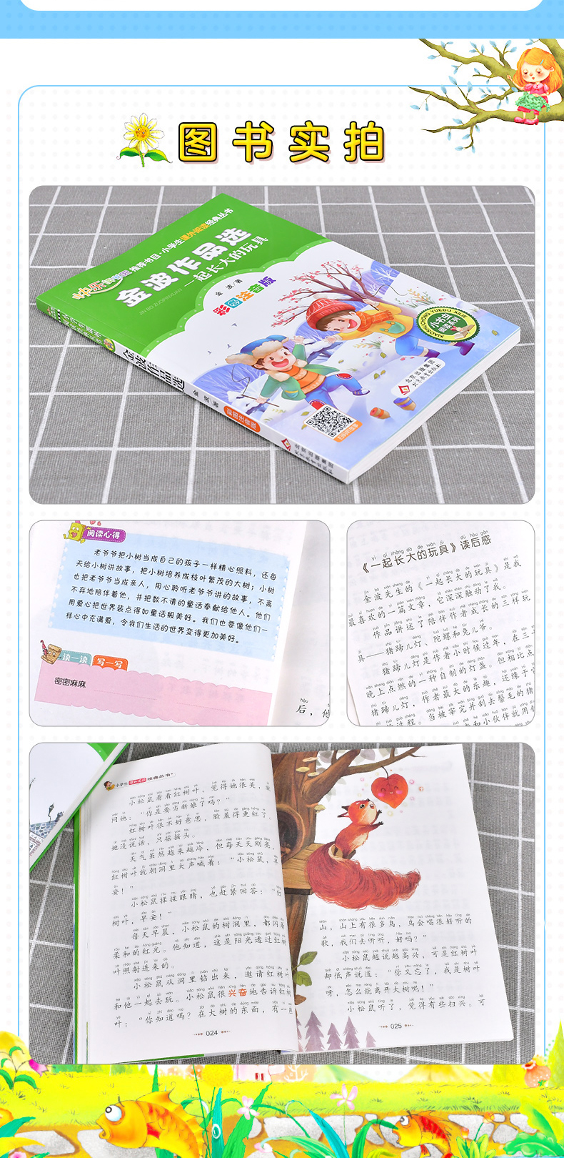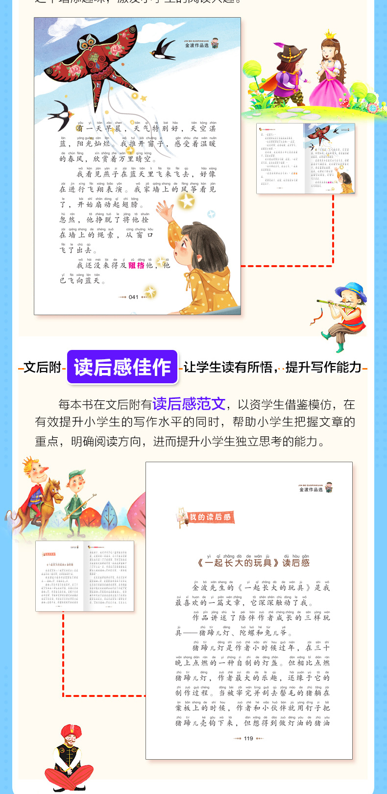 《金波作品选》收录了金波先生一些经典的、适合孩子读的散文、童话作品,其中《一起长大的玩具》记述了作者与小时候玩的三种玩具(猪蹄儿灯、陀螺、兔儿爷)之间的故事。作者童年时在玩这三种玩具的过程中,不仅获得了无限乐趣,还锻炼了动手的能力,甚至懂得了一些人生道理。这些玩具承载了作者的童年回忆,至今令作者难以忘怀。