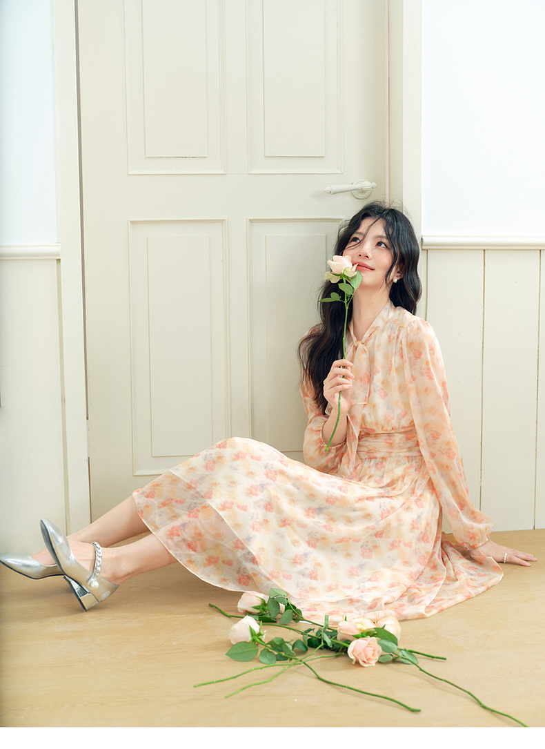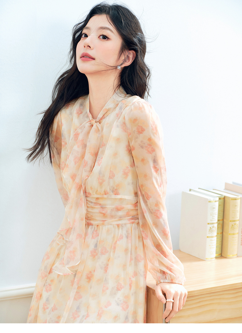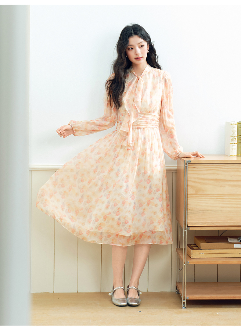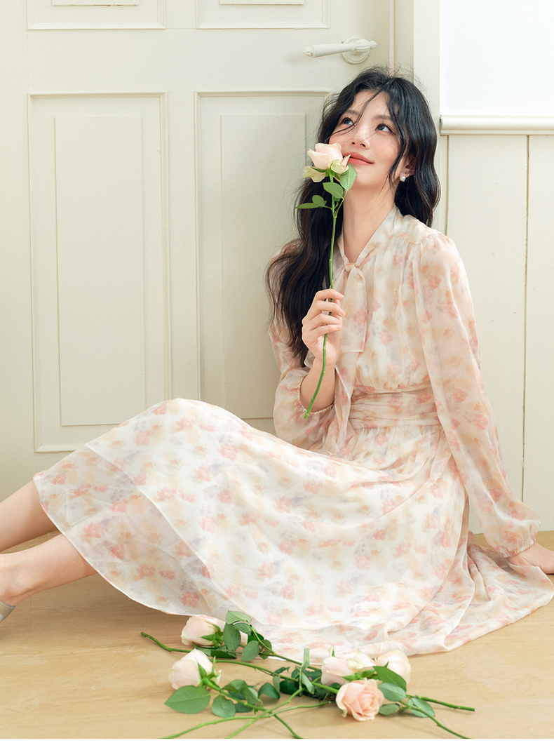 【严选】诗凡黎法式浪漫碎花飘带领连衣裙2025年春新款洋气减龄约会仙女裙7G2190581